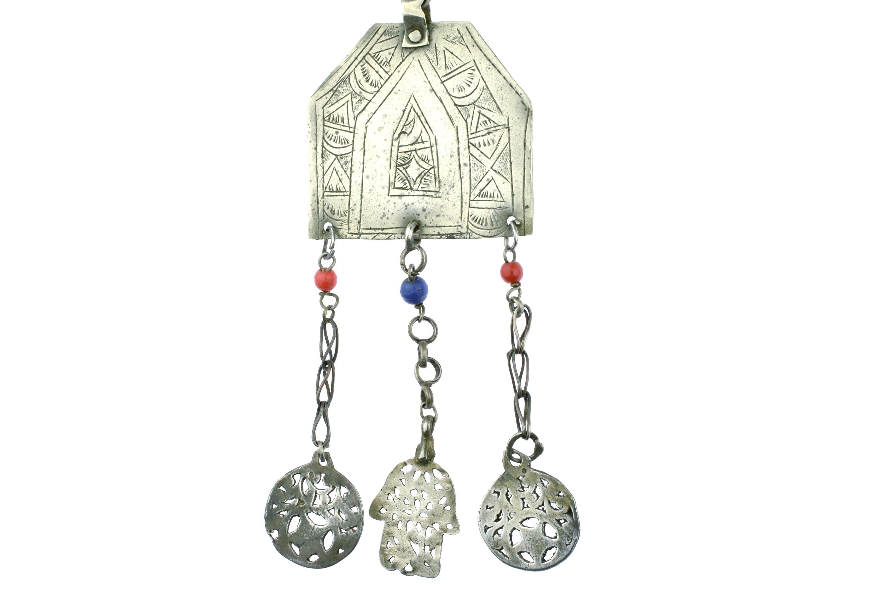 Antique Tunisian Amazigh Louha Amulet in the shape of a door or mihrab (prayer niche). Hand of Fatima and glass beads.