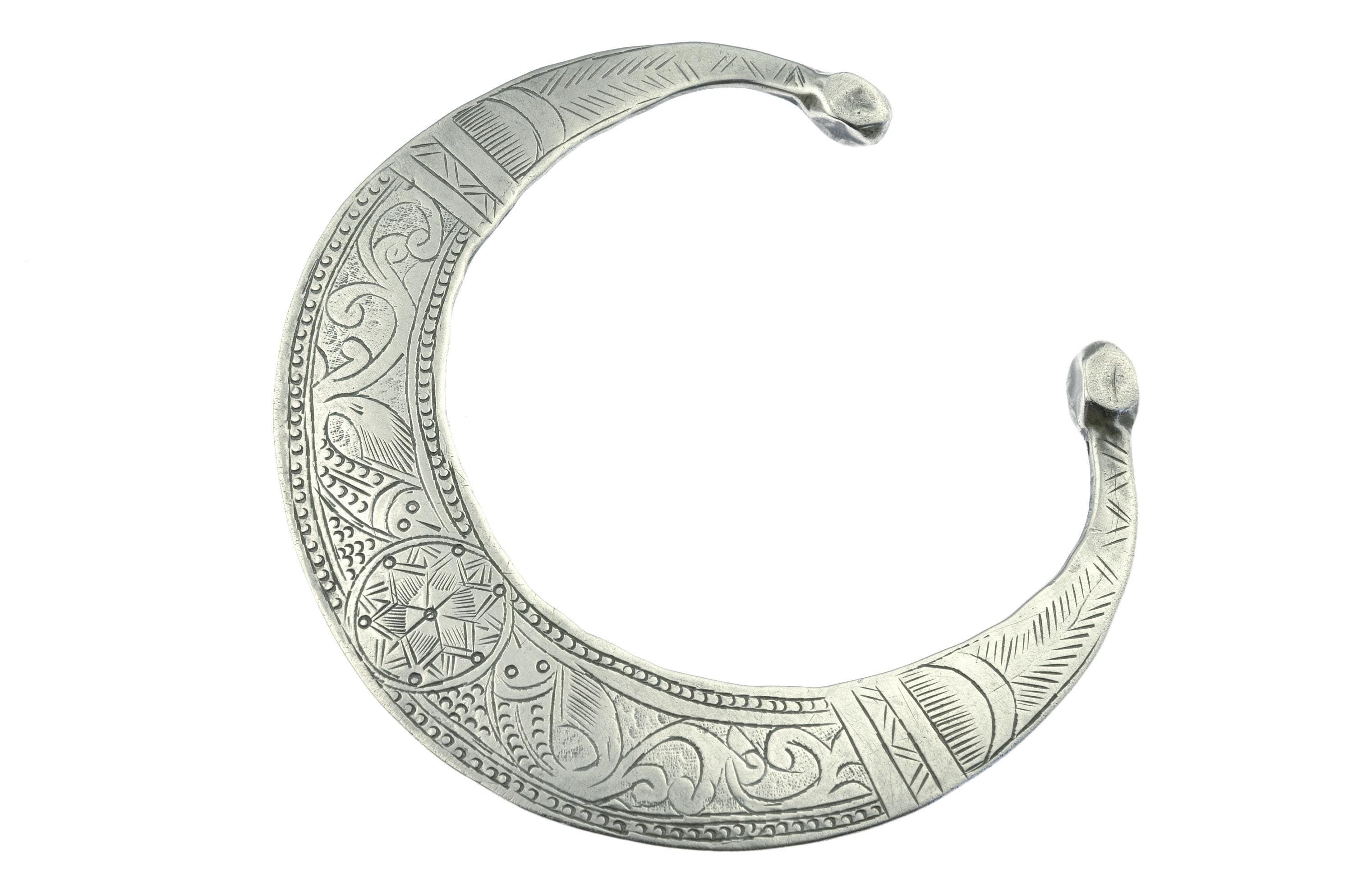 Crescent-type fibulae like this one were used to fix the two parts of the traditional Tunisian costume, the draped dress. They were worn by women from nomadic tribes in the south of the country, in the region of Medenine and Tataouine.