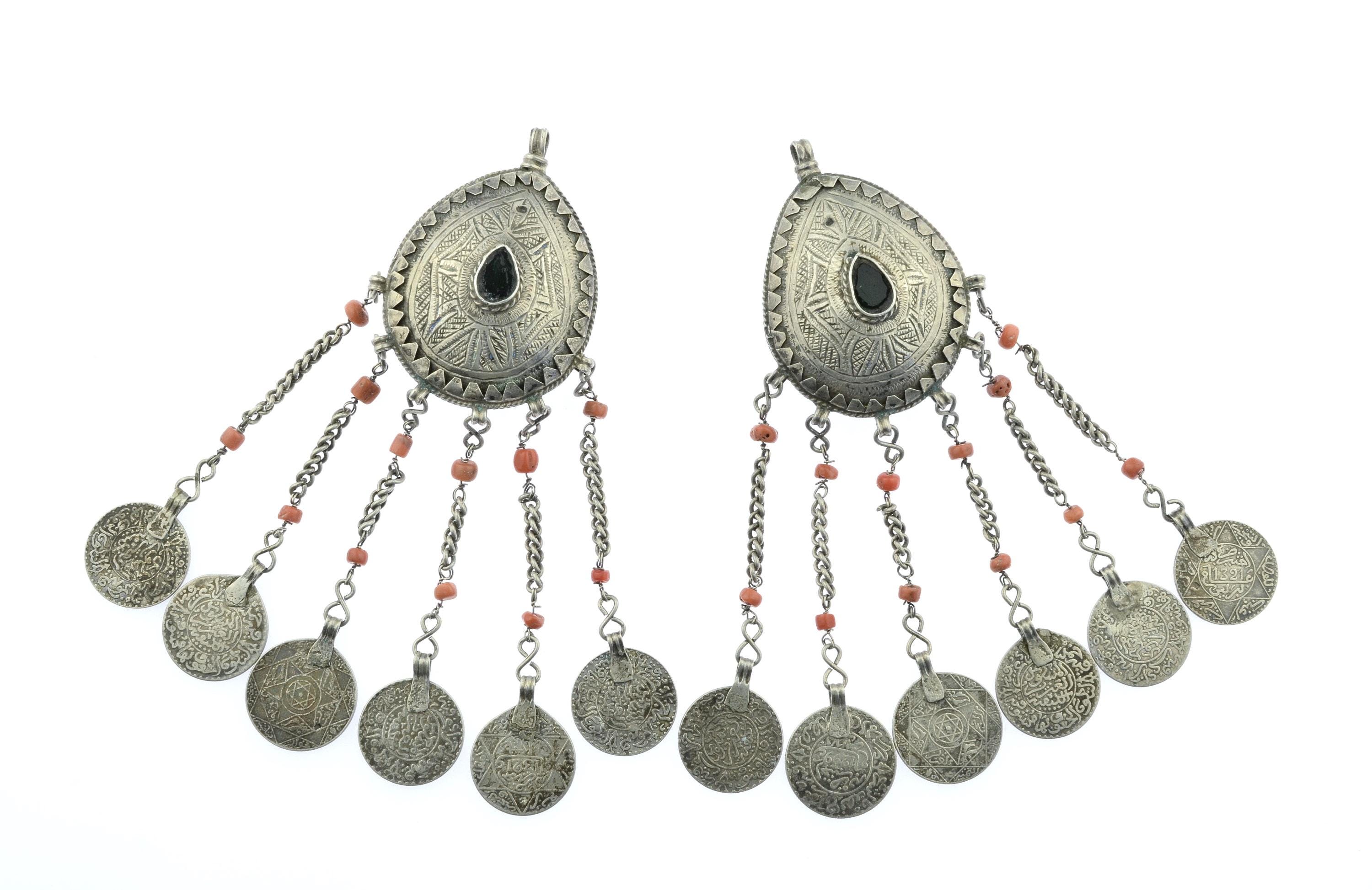 These pear-shaped pendants called Bermil are part of the jewelry set of women from the Zaïan tribes. They are decorated with coral beads and rials.