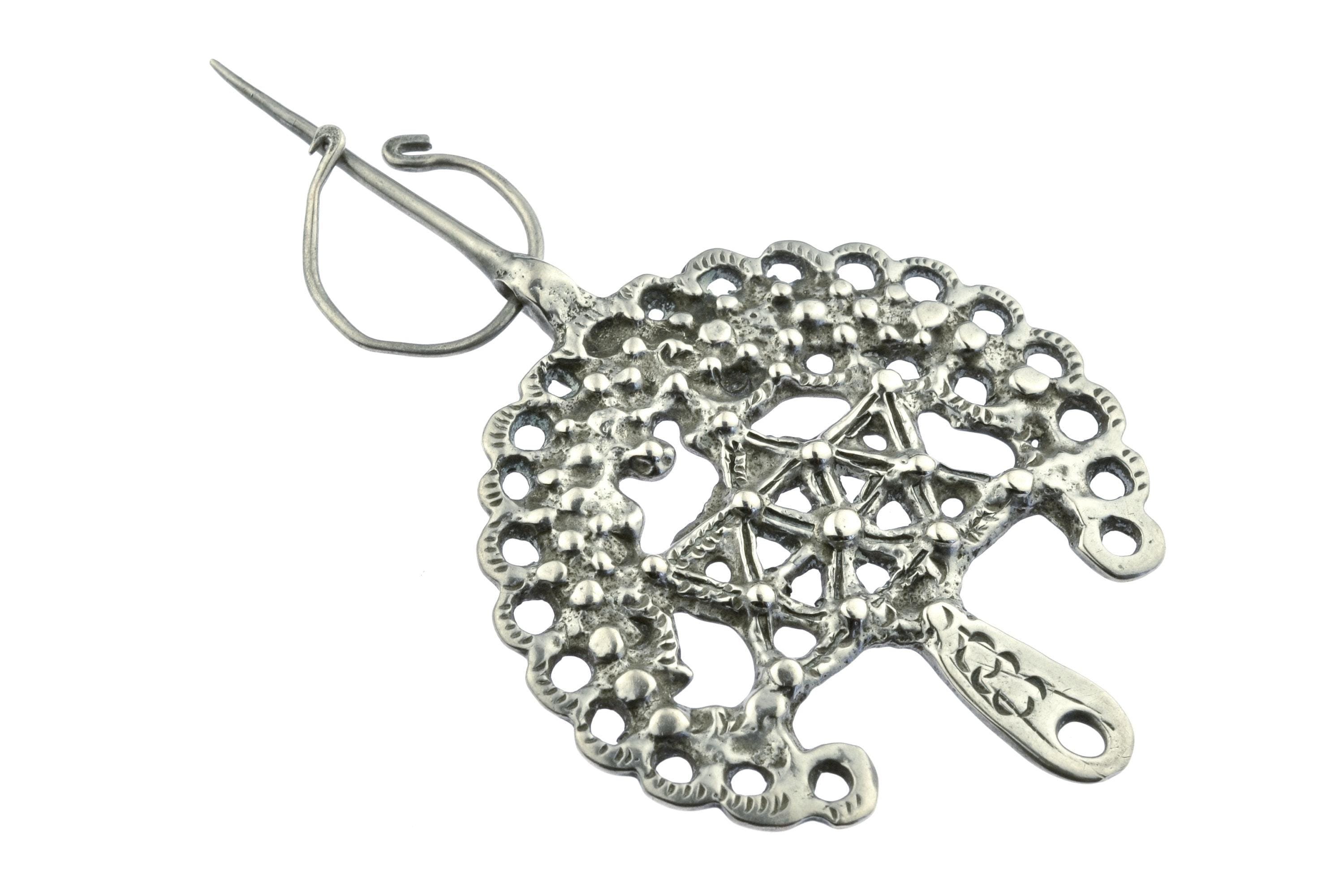 Openwork and chiseled high grade silver fibula with a crescent and star motif which helps ward off the evil eye.