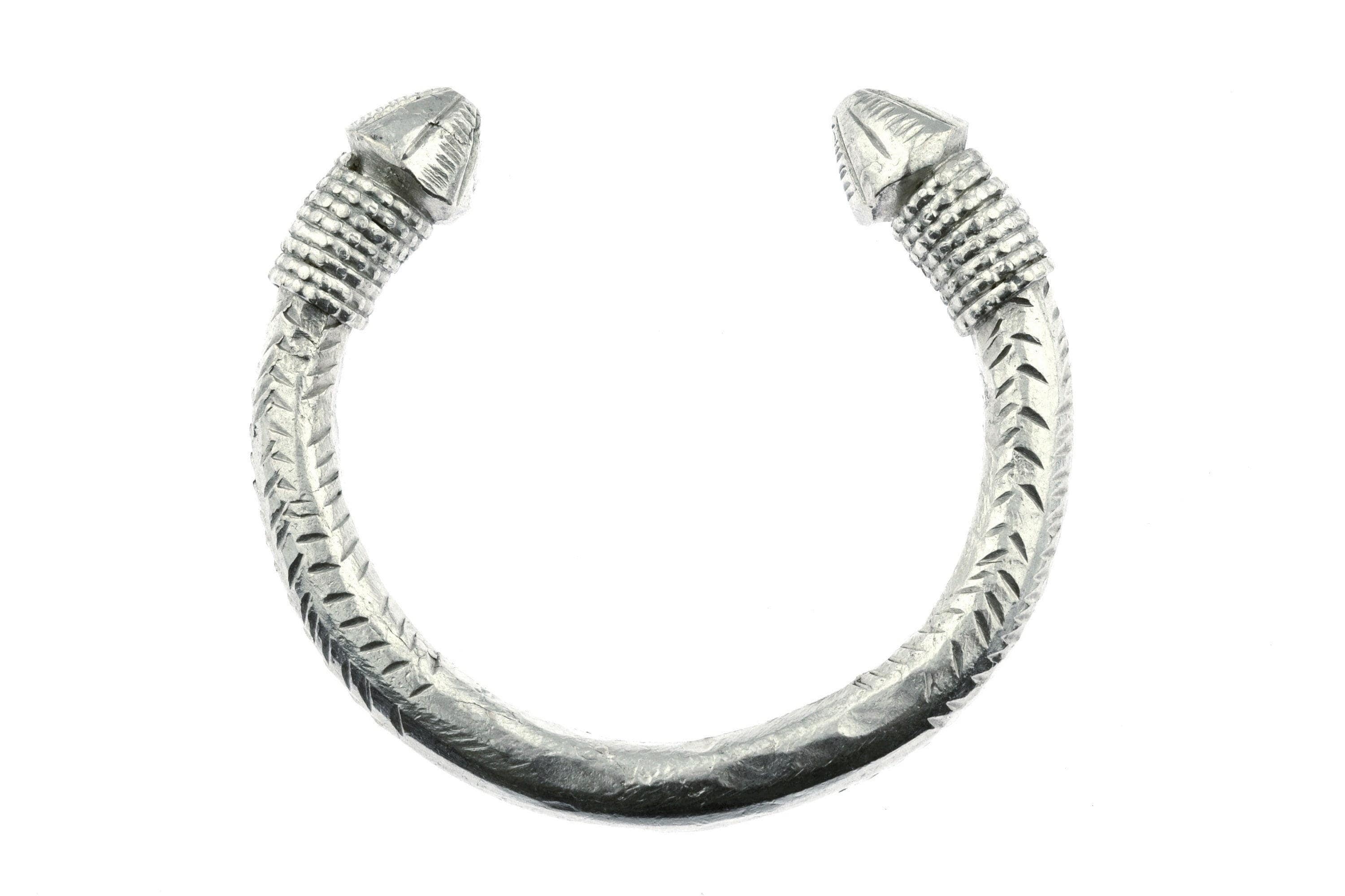The ends of these high grade silver bracelets are reminiscent of snake heads or flower buds. According to Heather Colyer Ross, these upper arm and ankle bracelets are always large in diameter. This one is relatively small and can be worn as a bracelet.