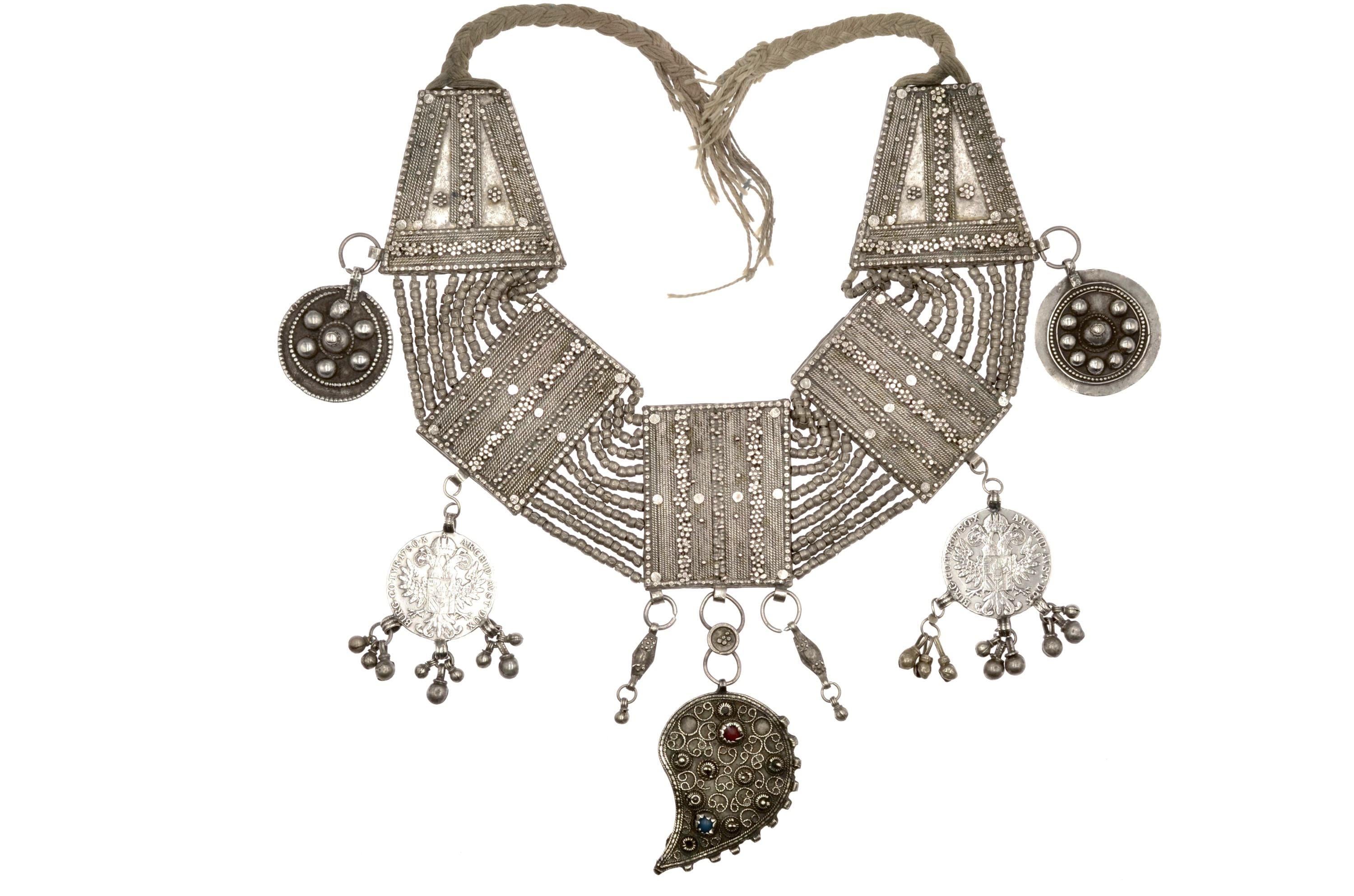 LAZIM necklace in silver, originating from the mountainous northern Yemen or southwestern Saudi Arabia. Featuring rectangular and triangular plates adorned with engraved motifs and silver filigree, it includes silver beads and pendants with Austrian thalers and a central paisley-shaped element set with red and blue glass. The necklace is secured with a braided cord, reflecting regional craftsmanship traditions.