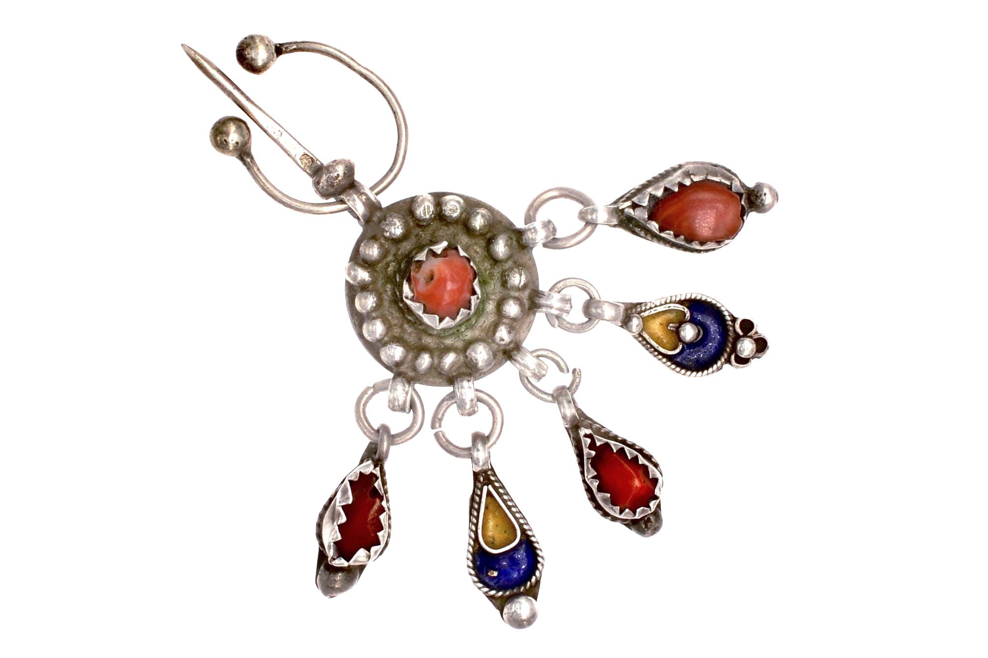 This five-pendant fibula in silver, coral, and enamel is made from a 19th-century French Napoleon III silver coin..