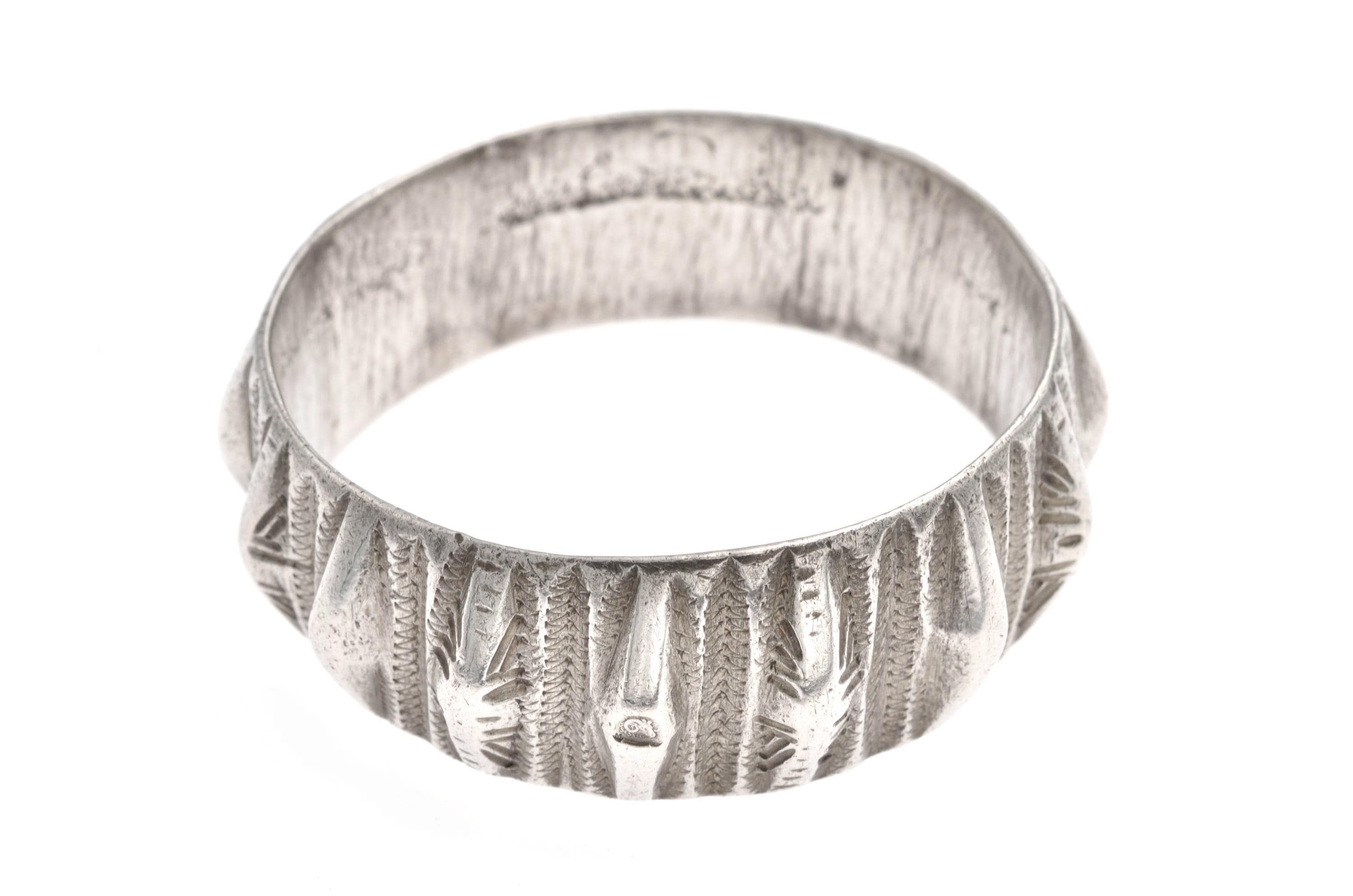 Heavy silver bracelet cast in sand, then finished with file and burin. The surface displays a repetitive pattern of raised and incised geometric motifs—chevrons, grooves, and triangular forms.