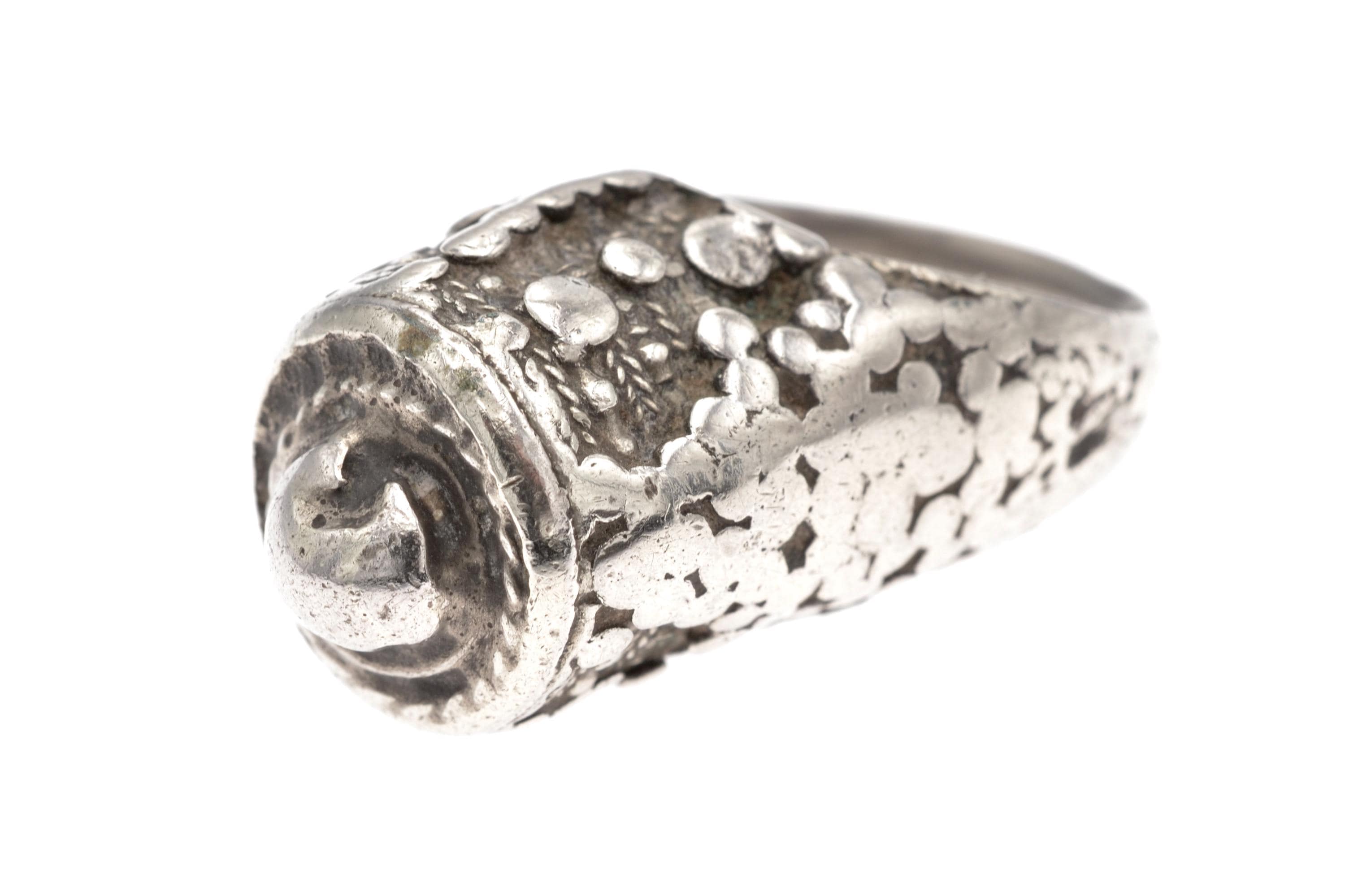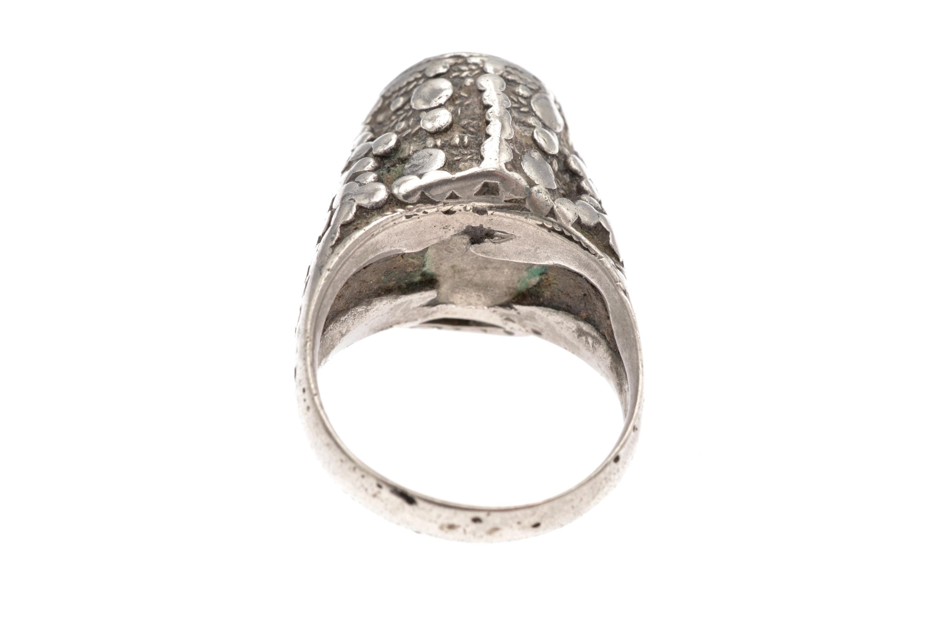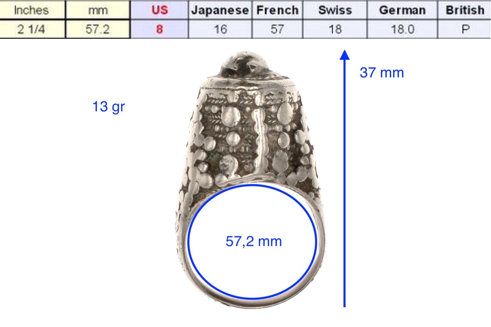 This ring features a prominent cylindrical shape. The top is adorned with circular relief patterns characteristic of Yemeni tribal designs. The body is decorated with evenly spaced horizontal ridges, resembling a drum. The material is traditional hammered silver. The "tower" shape reflects utilitarian and symbolic influences tied to Rashaida tribal identity and cultural wealth. Such rings were often gifted during important ceremonies or worn as protective talismans.