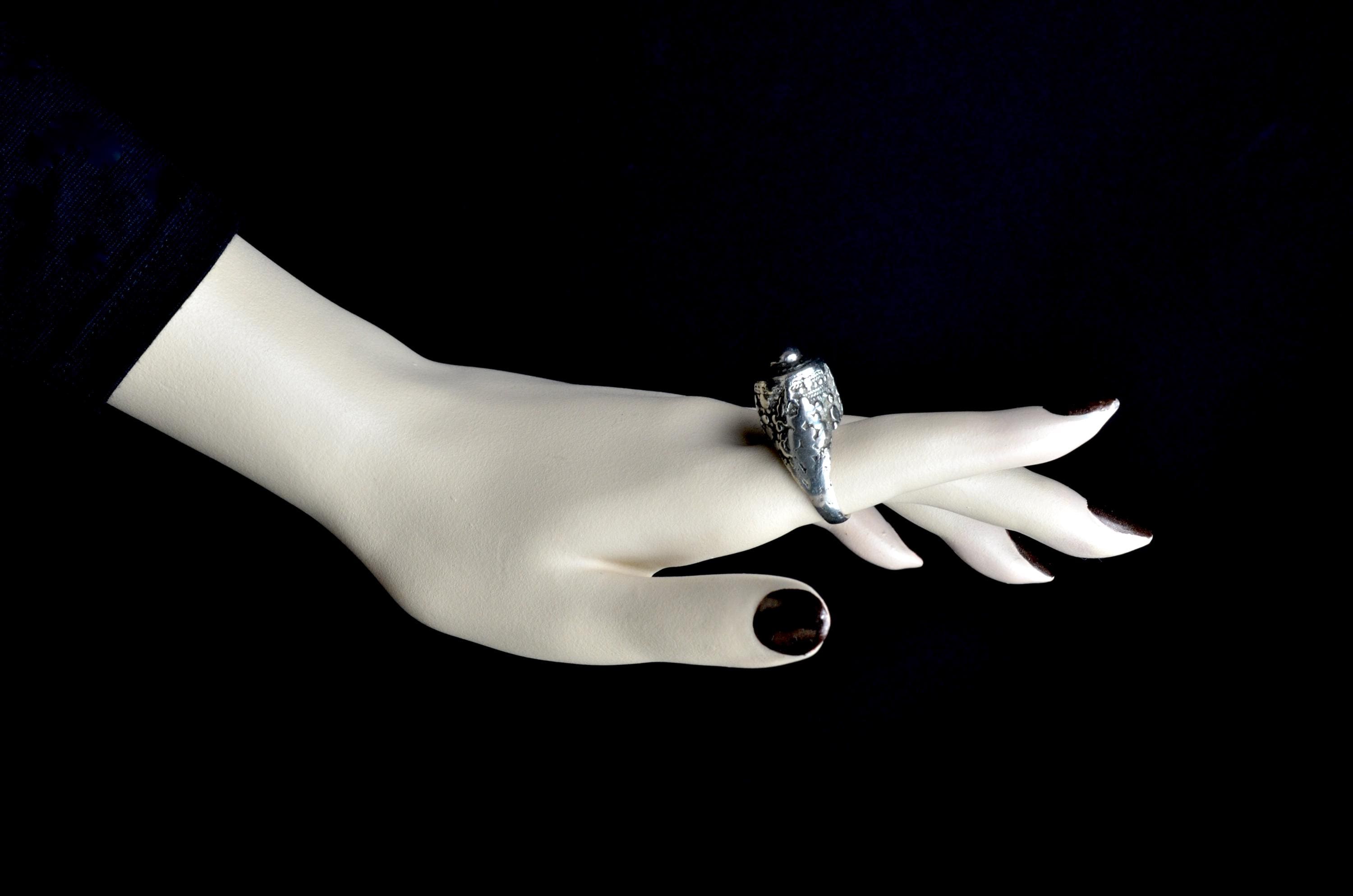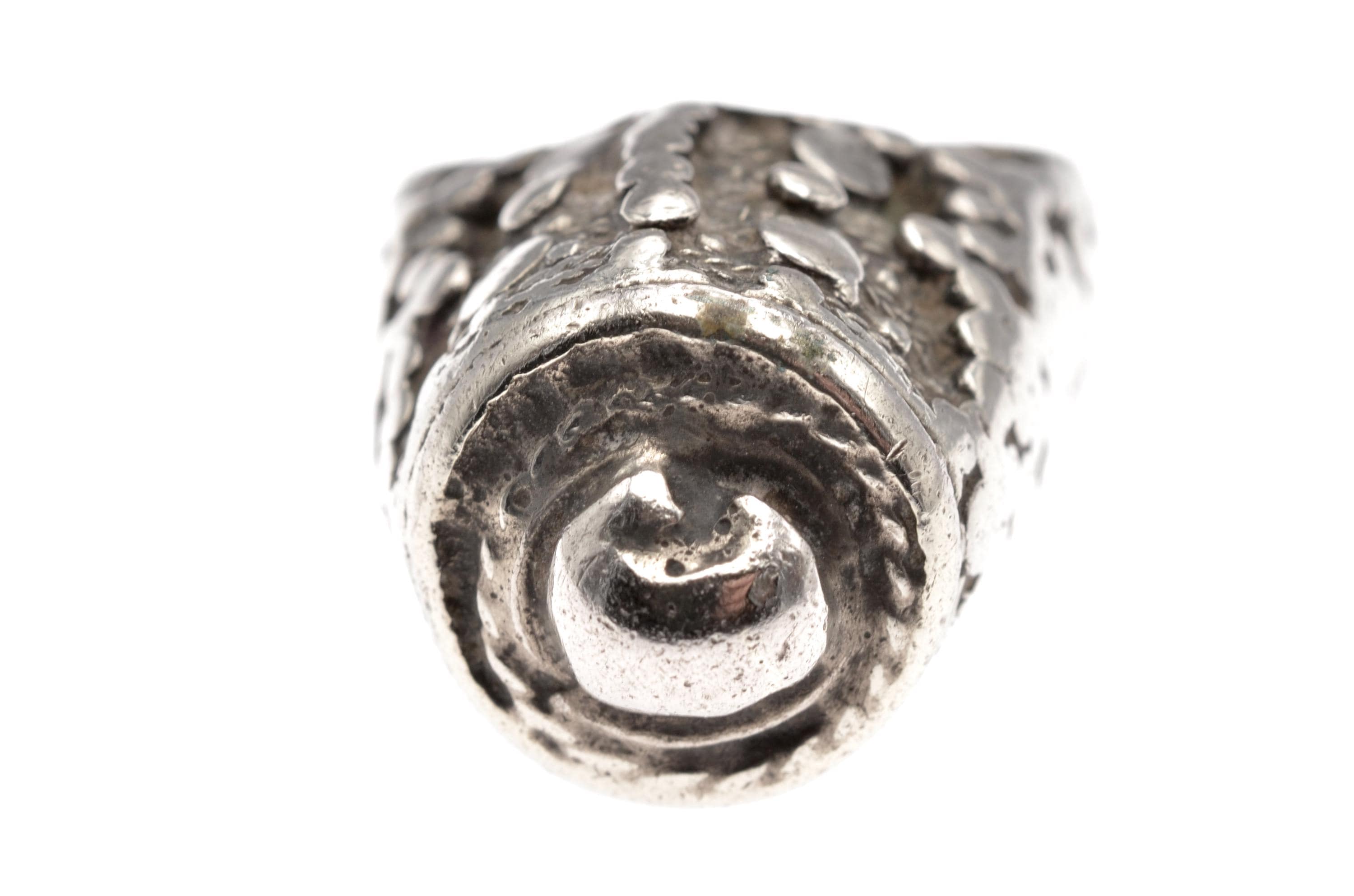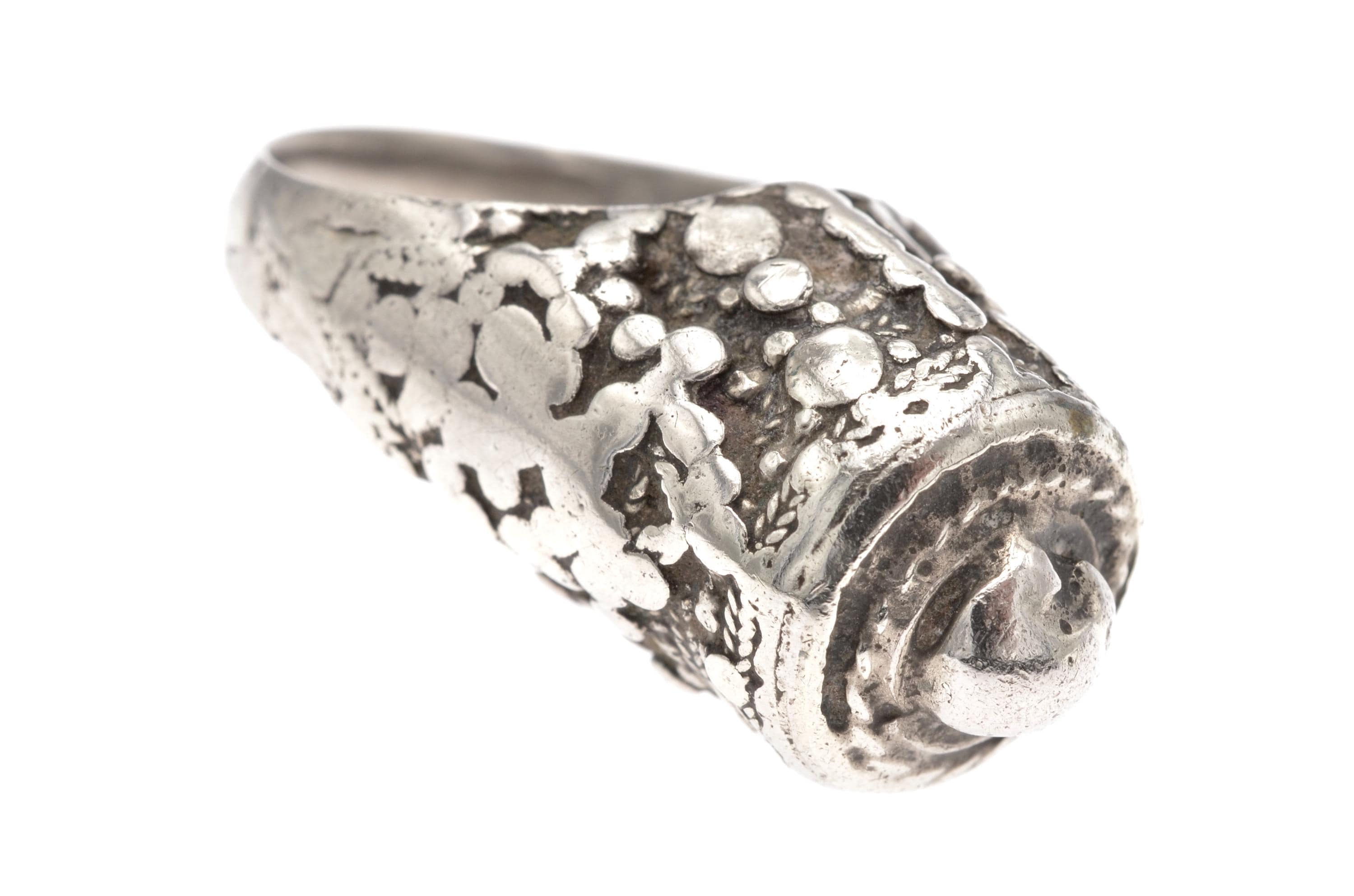 This ring features a prominent cylindrical shape. The top is adorned with circular relief patterns characteristic of Yemeni tribal designs. The body is decorated with evenly spaced horizontal ridges, resembling a drum. The material is traditional hammered silver. The "tower" shape reflects utilitarian and symbolic influences tied to Rashaida tribal identity and cultural wealth. Such rings were often gifted during important ceremonies or worn as protective talismans.