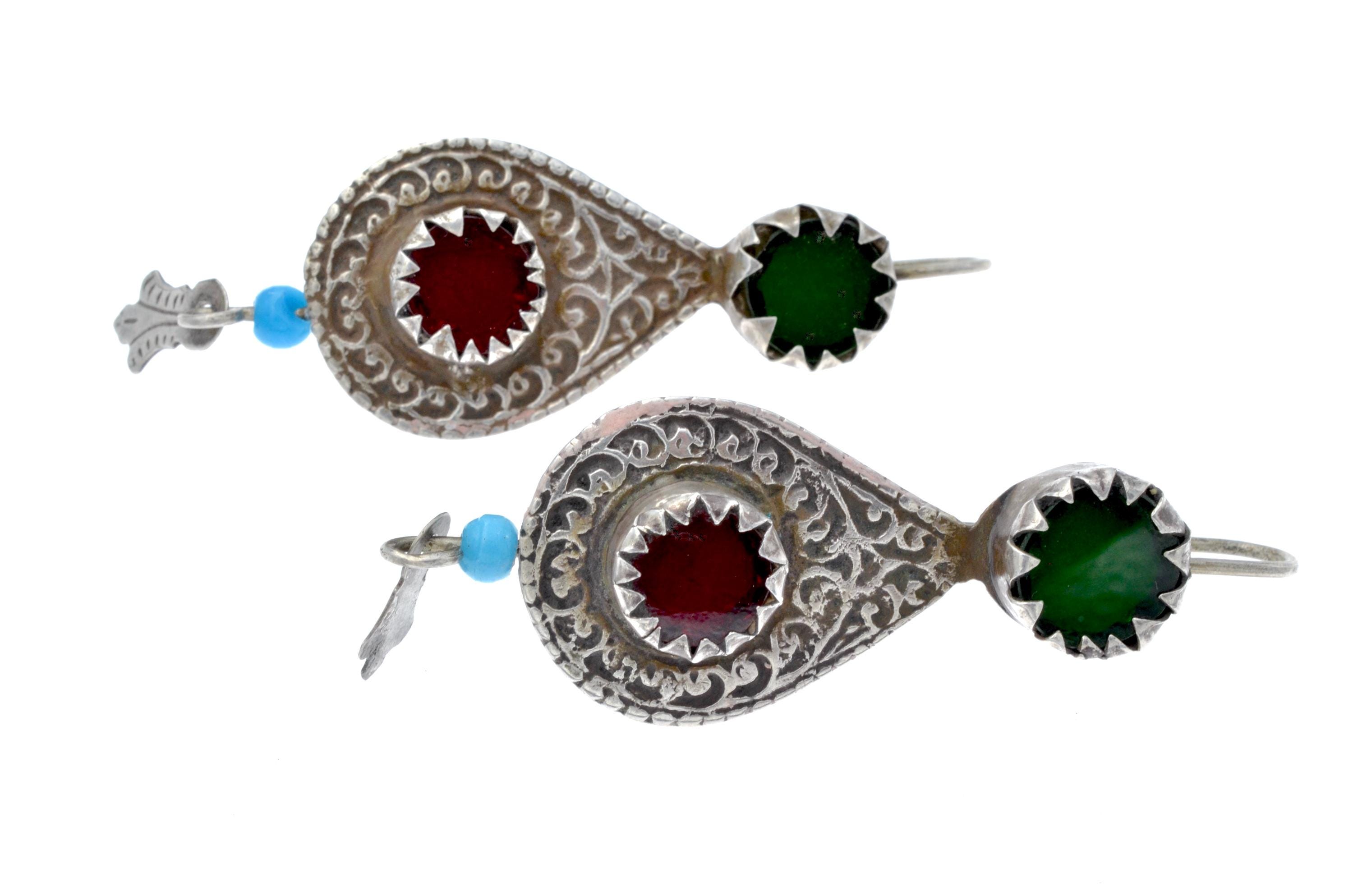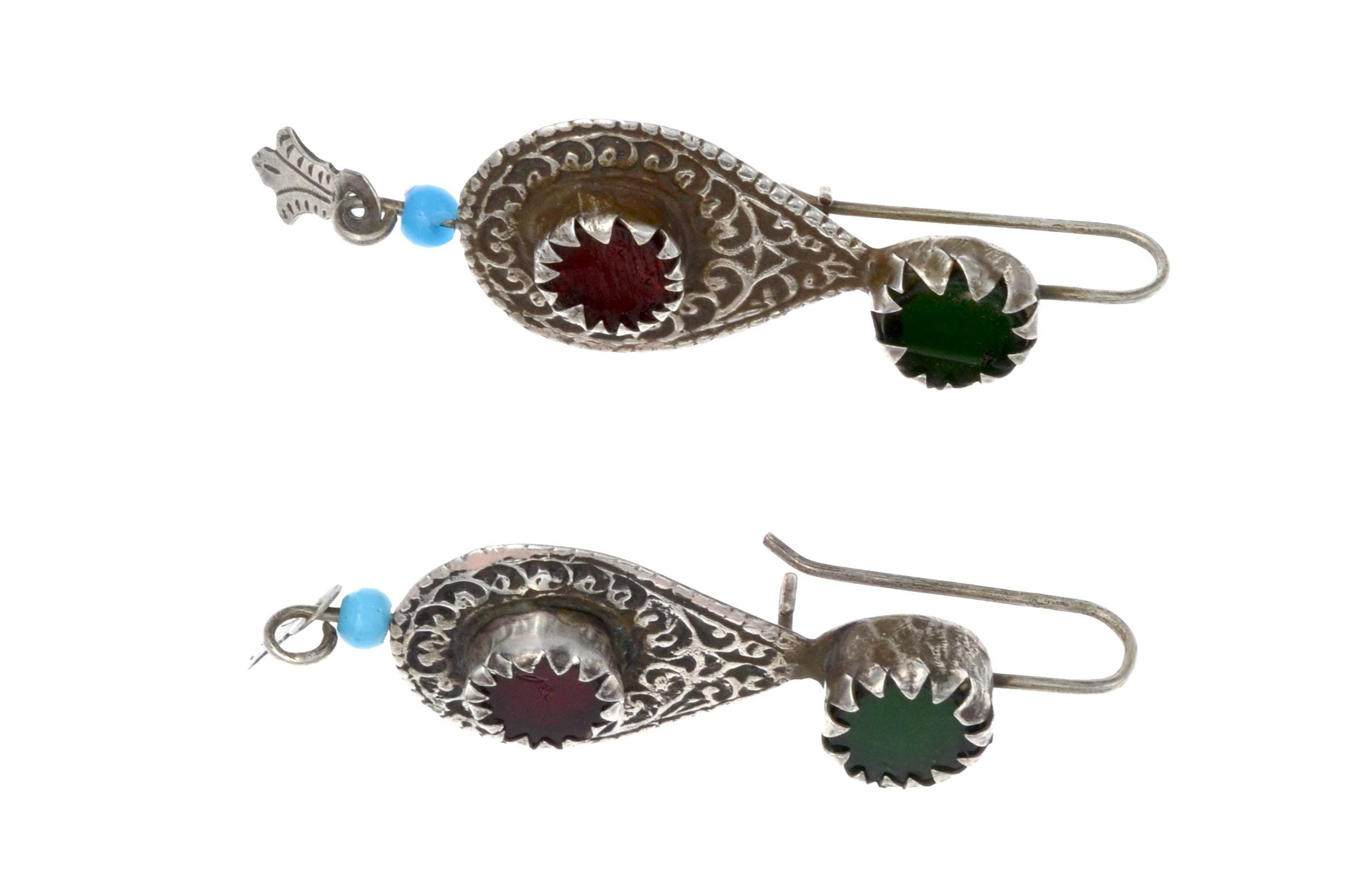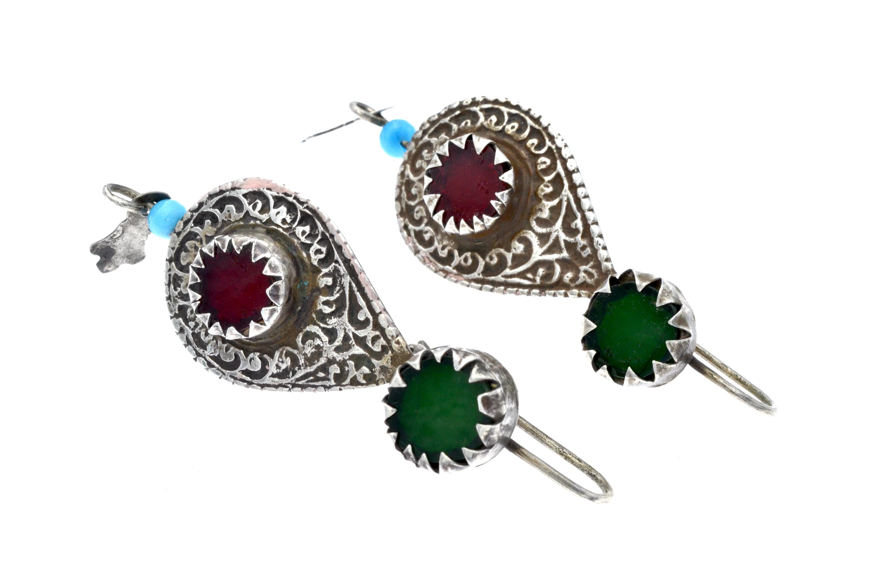 Pair of earrings from Imi n’Tanout, western High Atlas, Morocco, late 19th – early 20th century. Hand-shaped silver structure with elongated almond-shaped main plate engraved with all-over stylized curvilinear motifs. Central red glass cabochon set in a serrated bezel. Lower movable disc set with a green glass cabochon in a serrated bezel. Small protective blue bead and stylized terminal element. Old attachment system with long U-shaped wire. Surface shows patina and wear consistent with age. Amazigh female adornment from the western High Atlas combining ornament and protective function.
