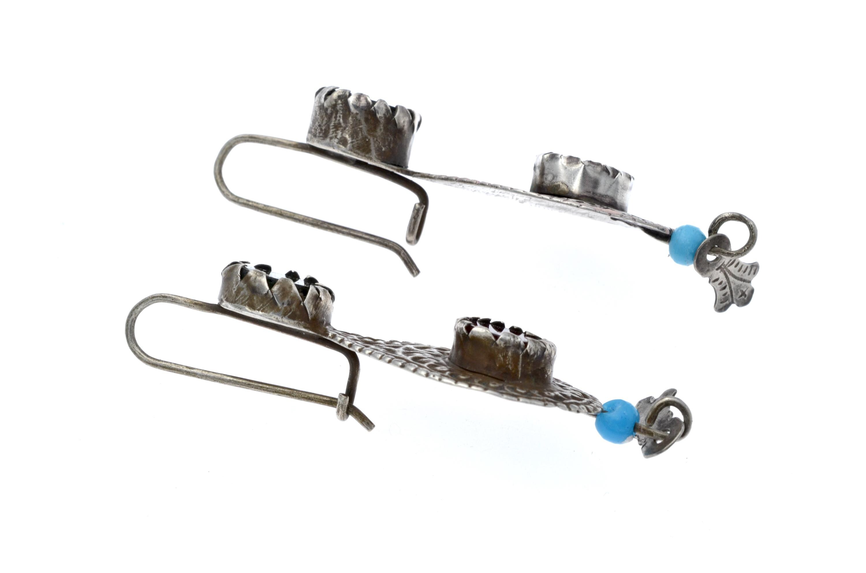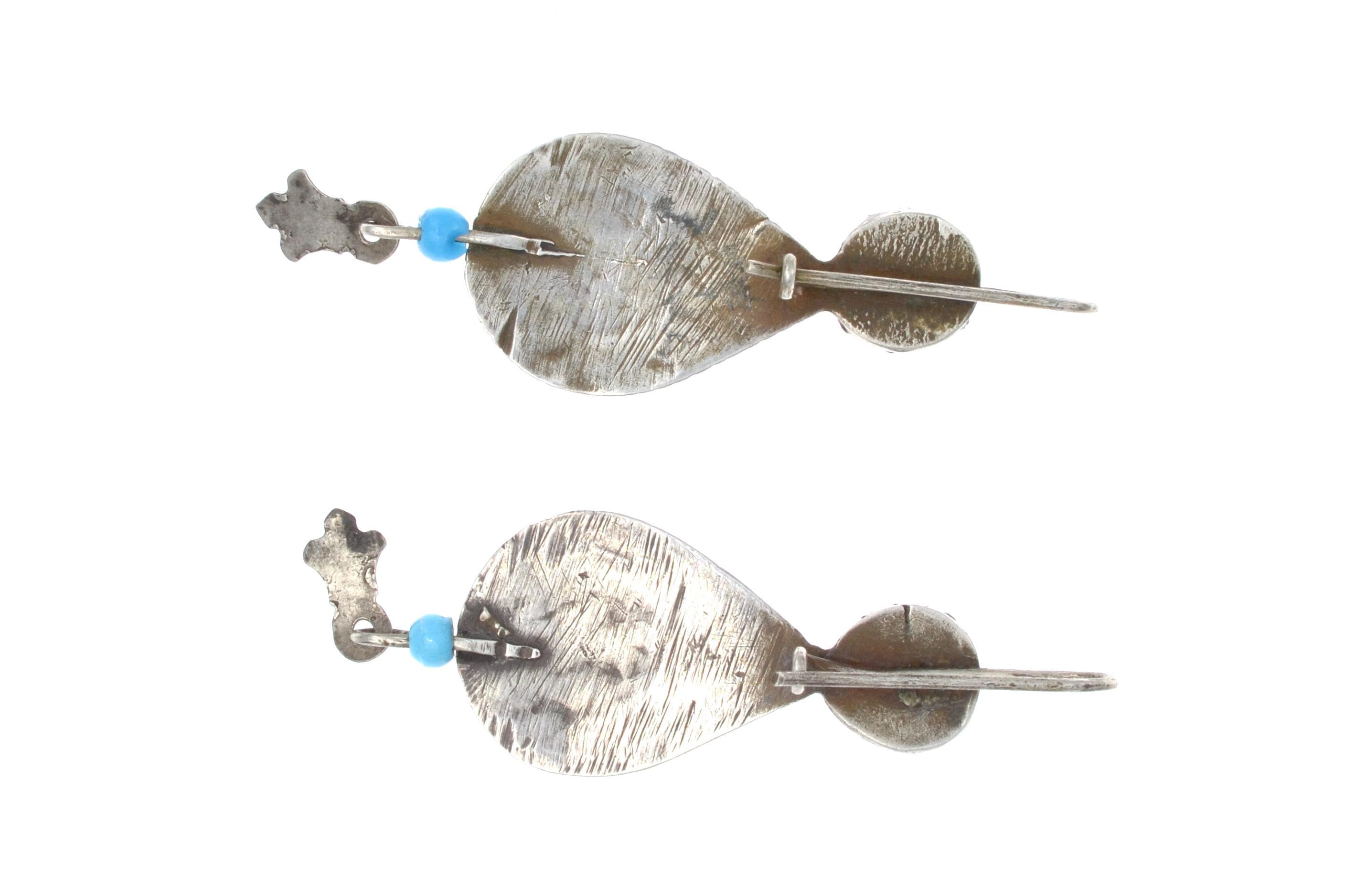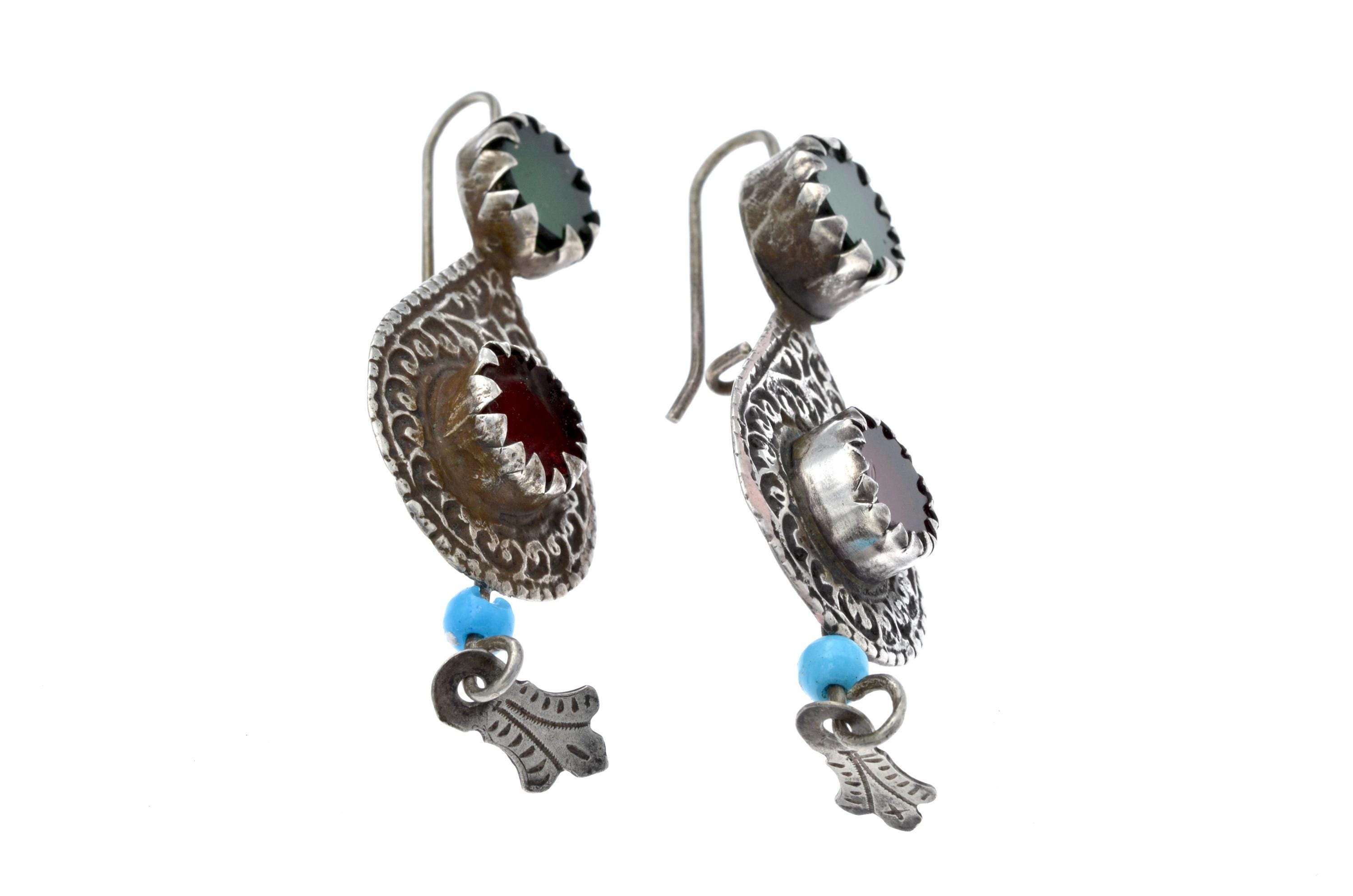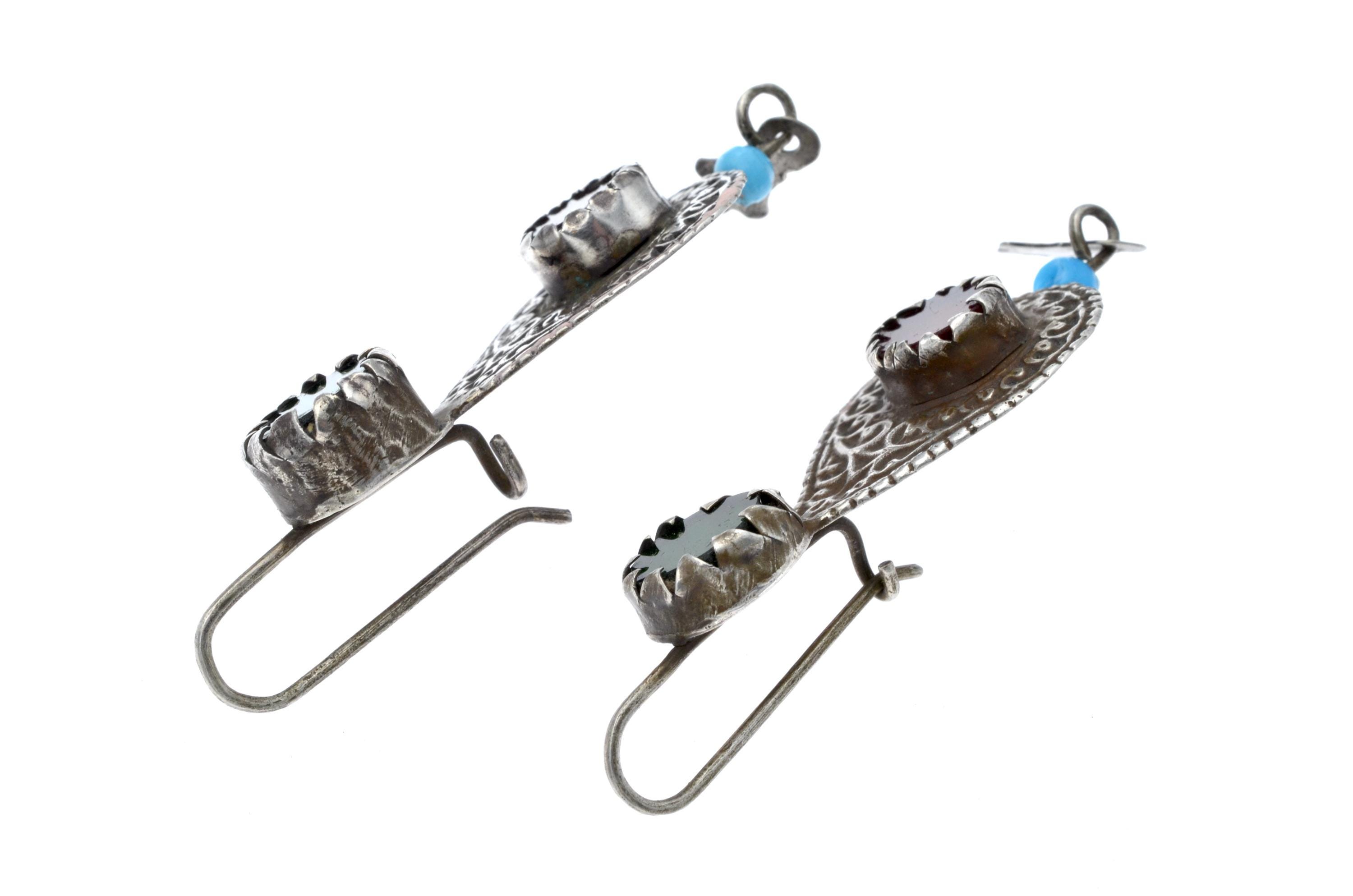 Pair of earrings from Imi n’Tanout, western High Atlas, Morocco, late 19th – early 20th century. Hand-shaped silver structure with elongated almond-shaped main plate engraved with all-over stylized curvilinear motifs. Central red glass cabochon set in a serrated bezel. Lower movable disc set with a green glass cabochon in a serrated bezel. Small protective blue bead and stylized terminal element. Old attachment system with long U-shaped wire. Surface shows patina and wear consistent with age. Amazigh female adornment from the western High Atlas combining ornament and protective function.