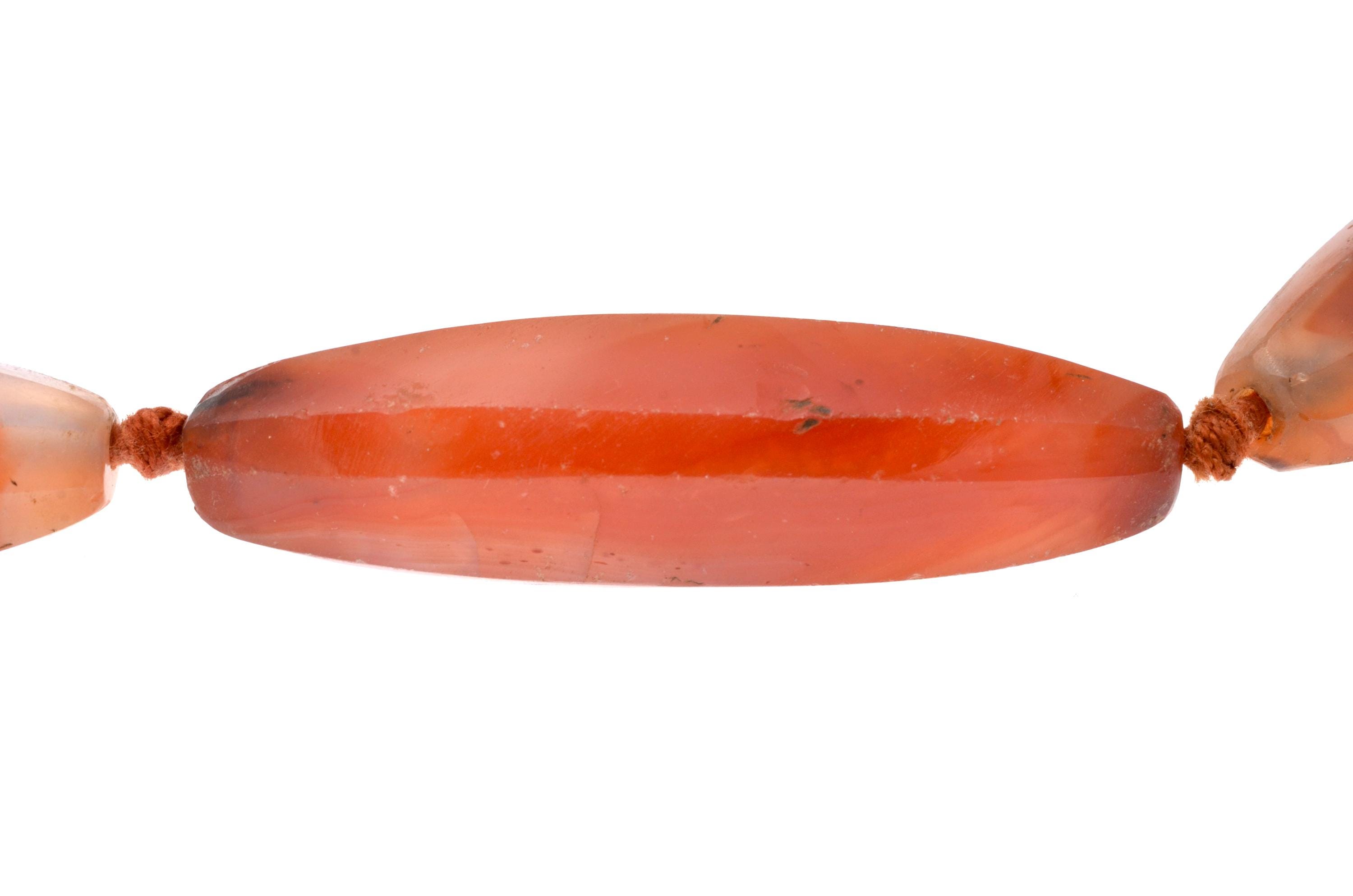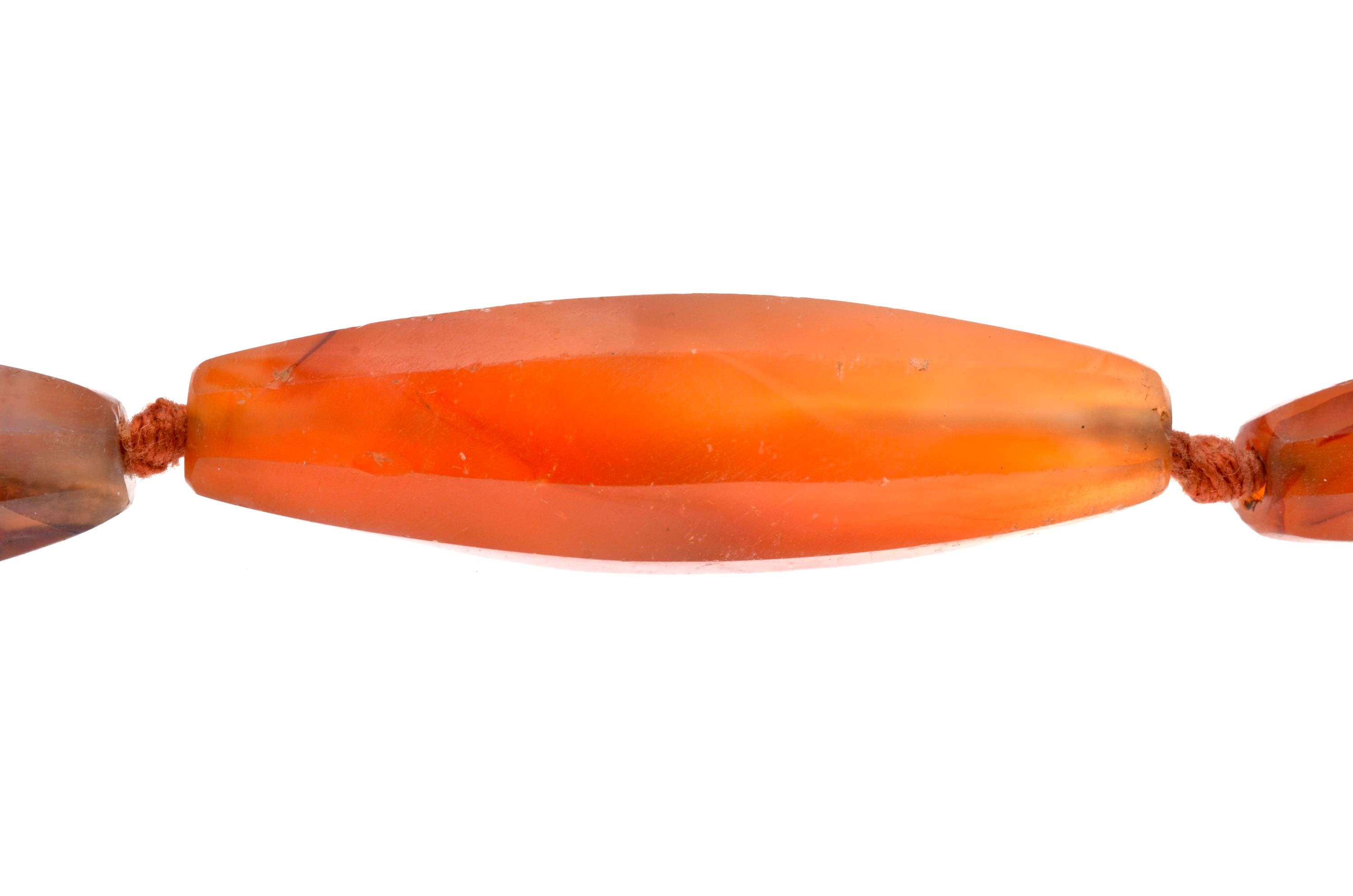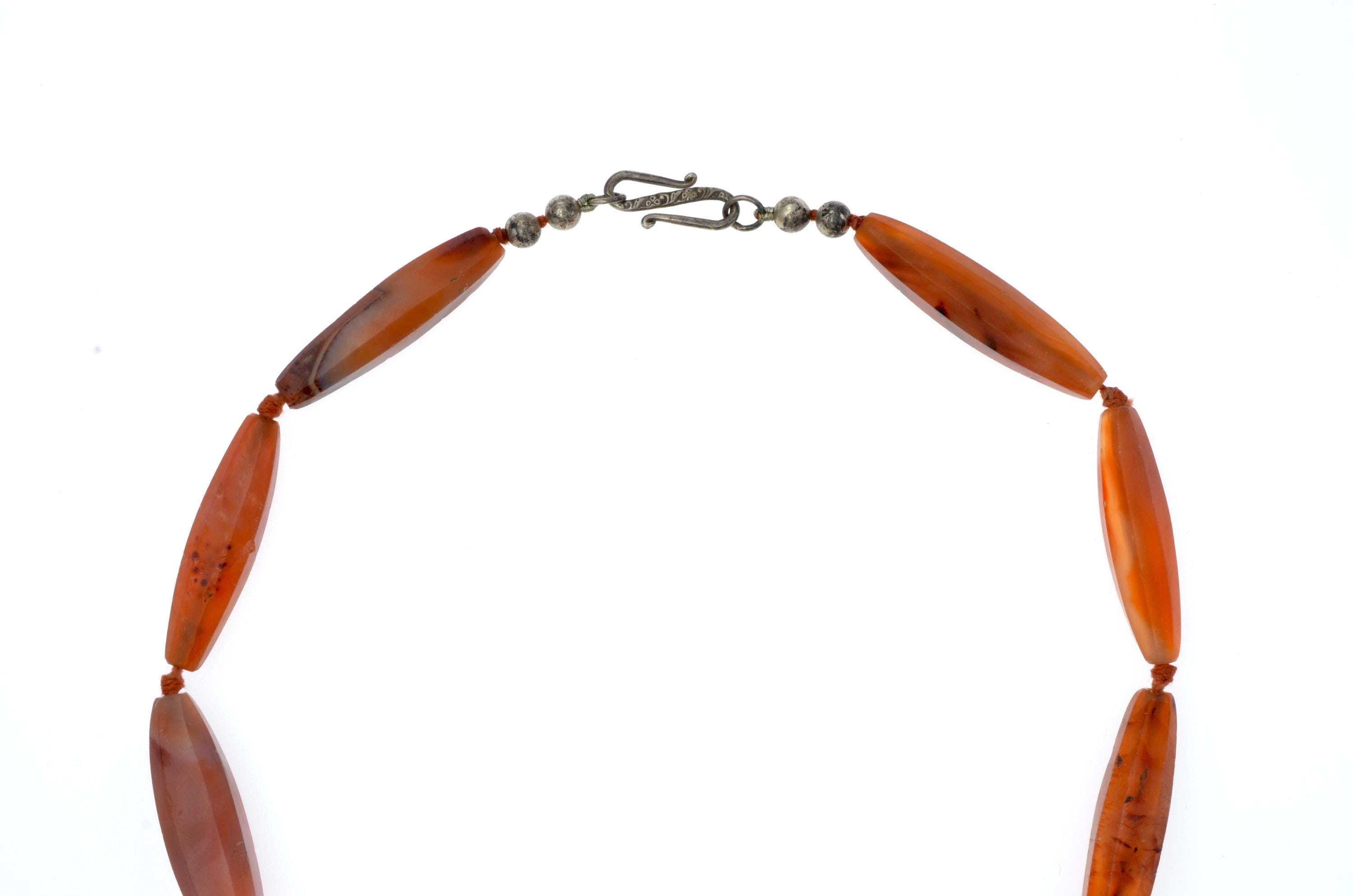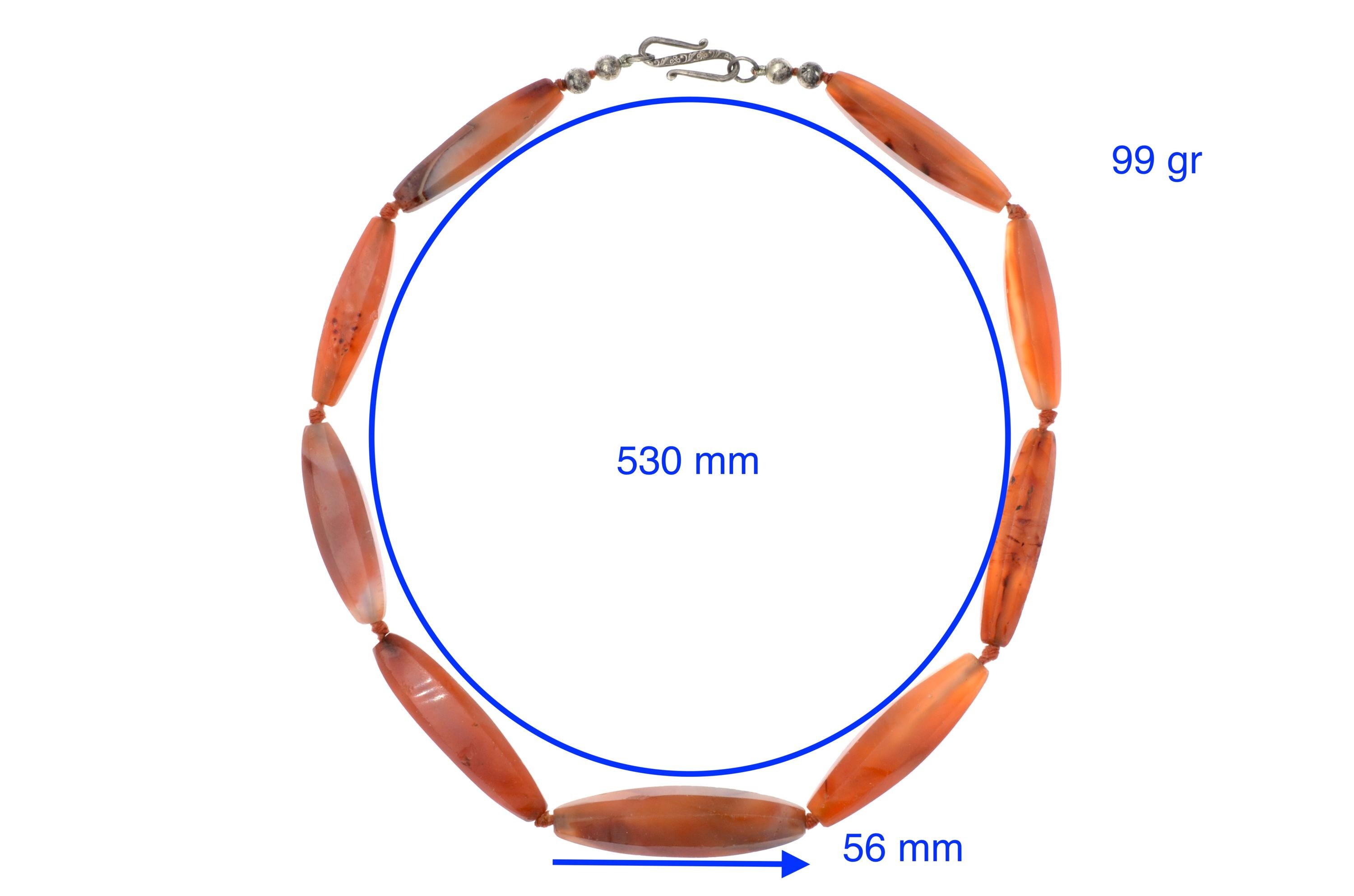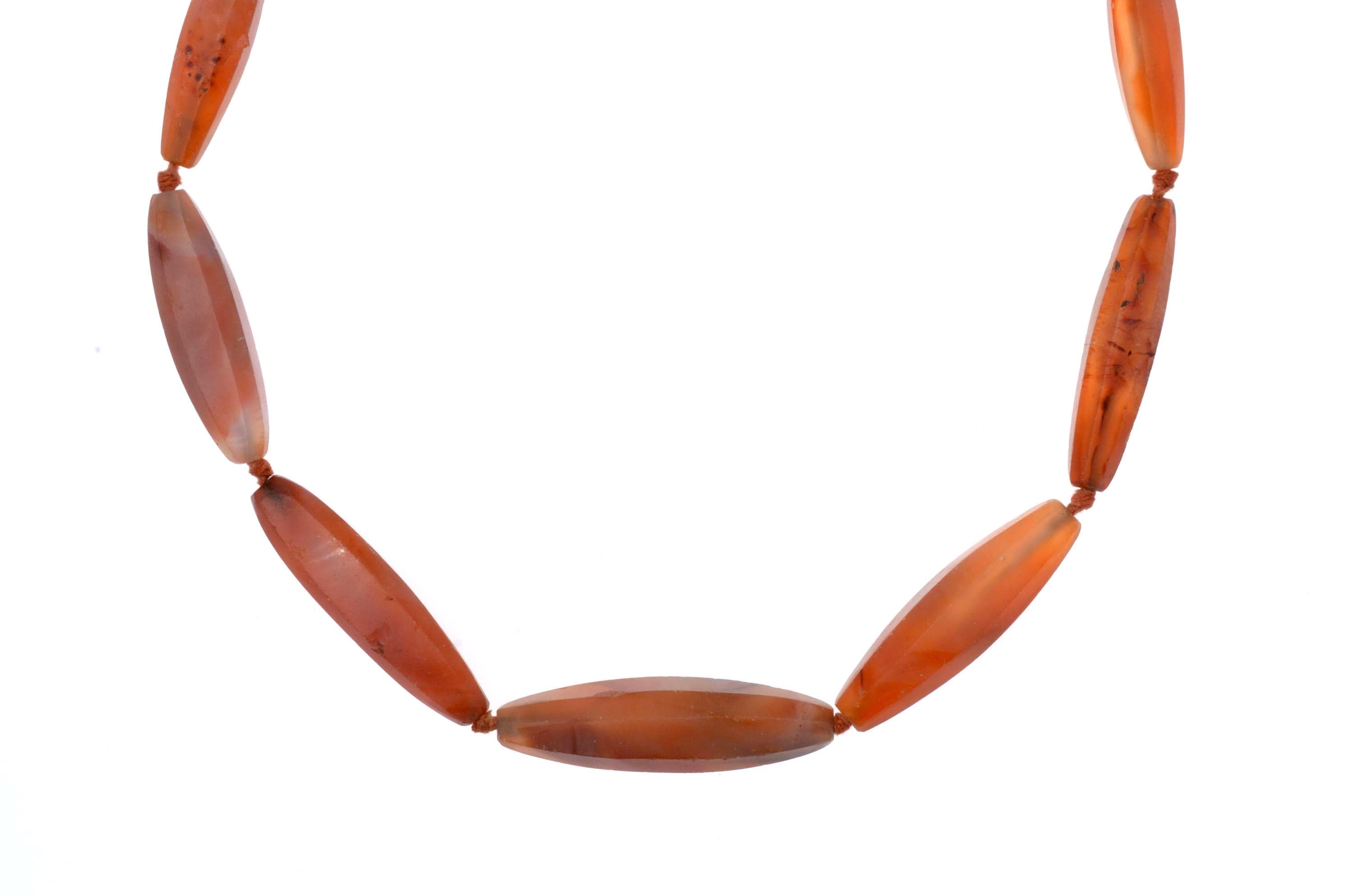 Necklace composed of carnelian beads from the North African and trans-Saharan sphere, late 19th – early 20th century. Set of elongated fusiform beads with longitudinal facets, hand-cut and shaped according to an Indian cutting tradition (Gujarat region). Natural orange-red tones with visible internal inclusions and color variations. Surfaces show wear, small impact marks and patina consistent with age and use. Beads separated by knots in a traditional stringing method. Metal clasp added later. Female adornment integrated into North African ornamental traditions and trans-Saharan trade networks.