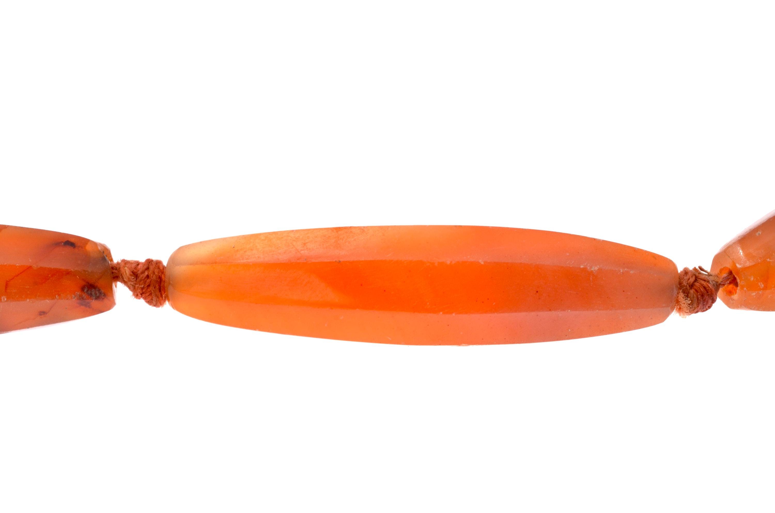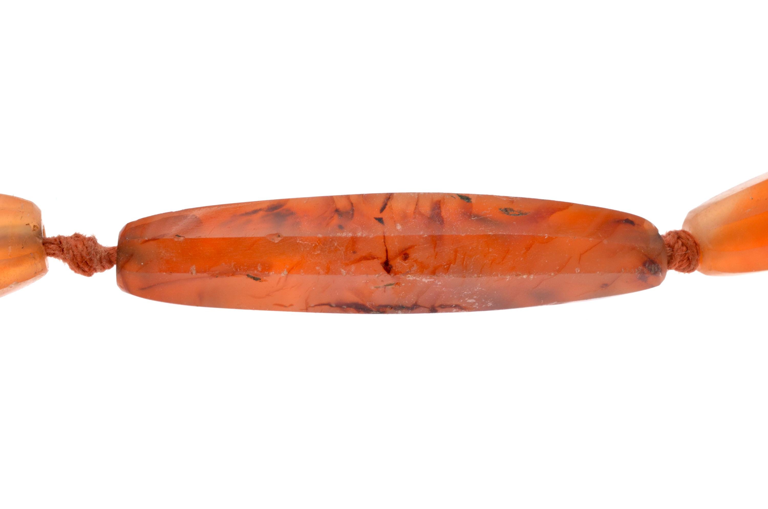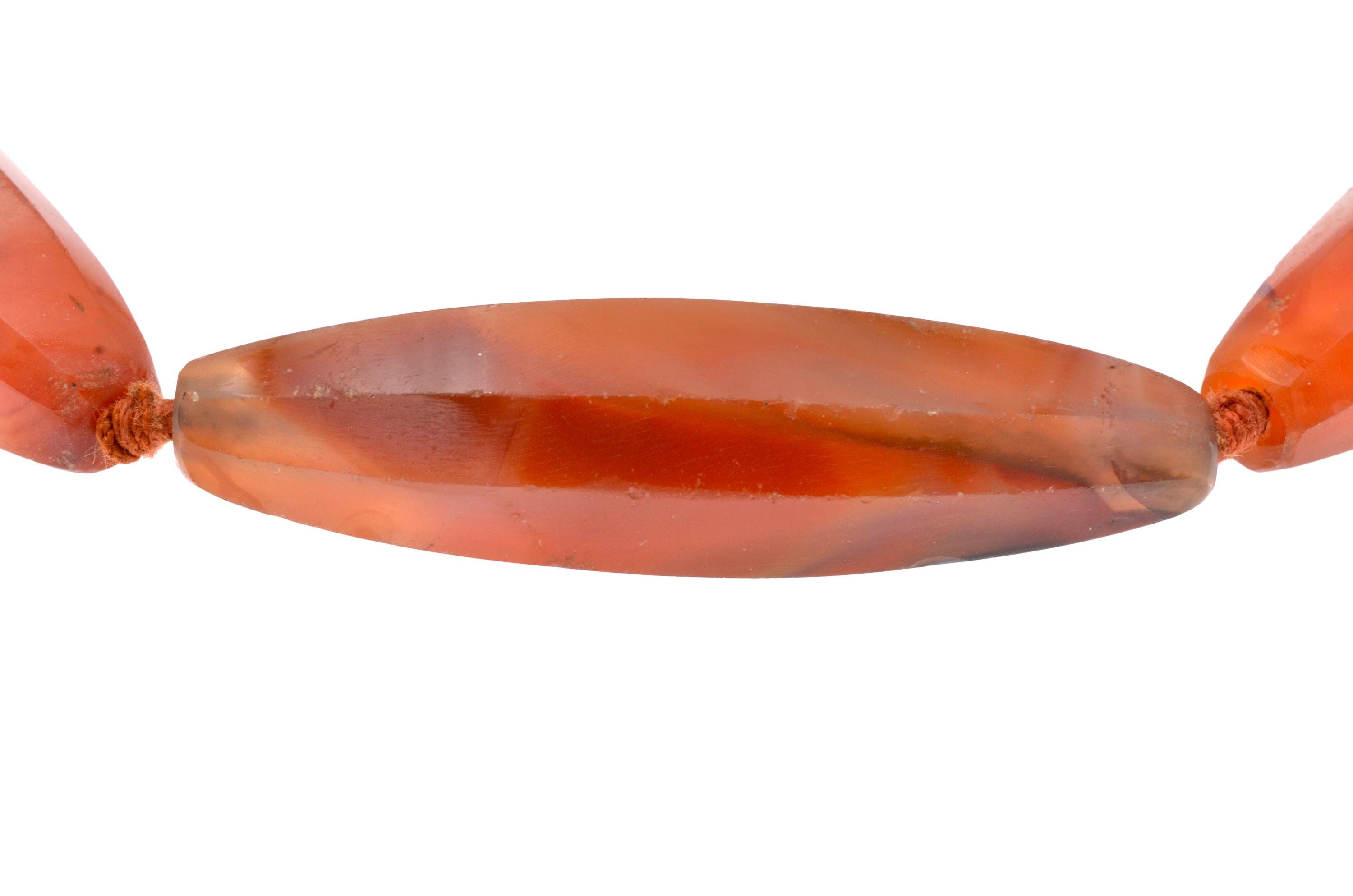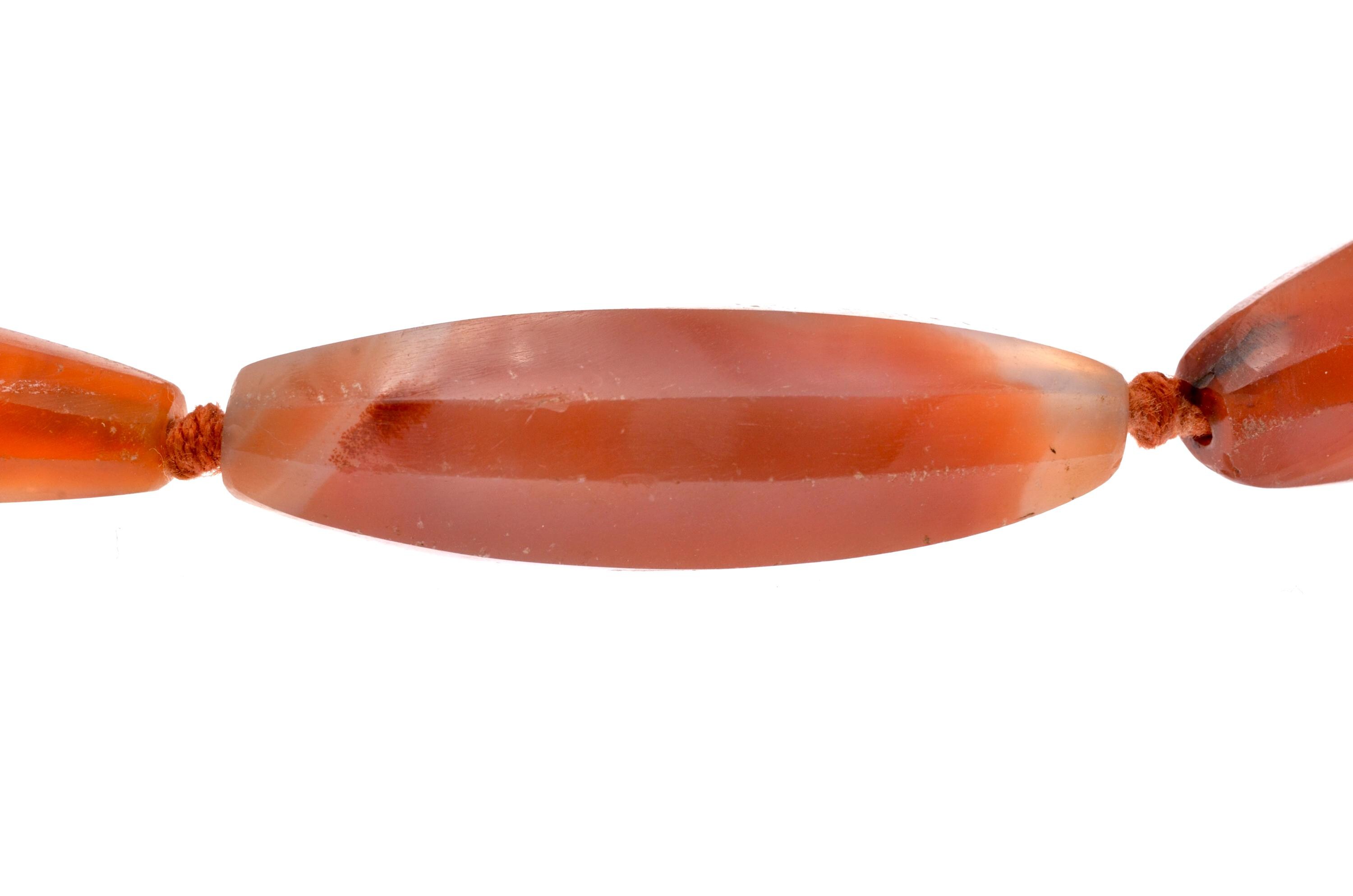 Necklace composed of carnelian beads from the North African and trans-Saharan sphere, late 19th – early 20th century. Set of elongated fusiform beads with longitudinal facets, hand-cut and shaped according to an Indian cutting tradition (Gujarat region). Natural orange-red tones with visible internal inclusions and color variations. Surfaces show wear, small impact marks and patina consistent with age and use. Beads separated by knots in a traditional stringing method. Metal clasp added later. Female adornment integrated into North African ornamental traditions and trans-Saharan trade networks.