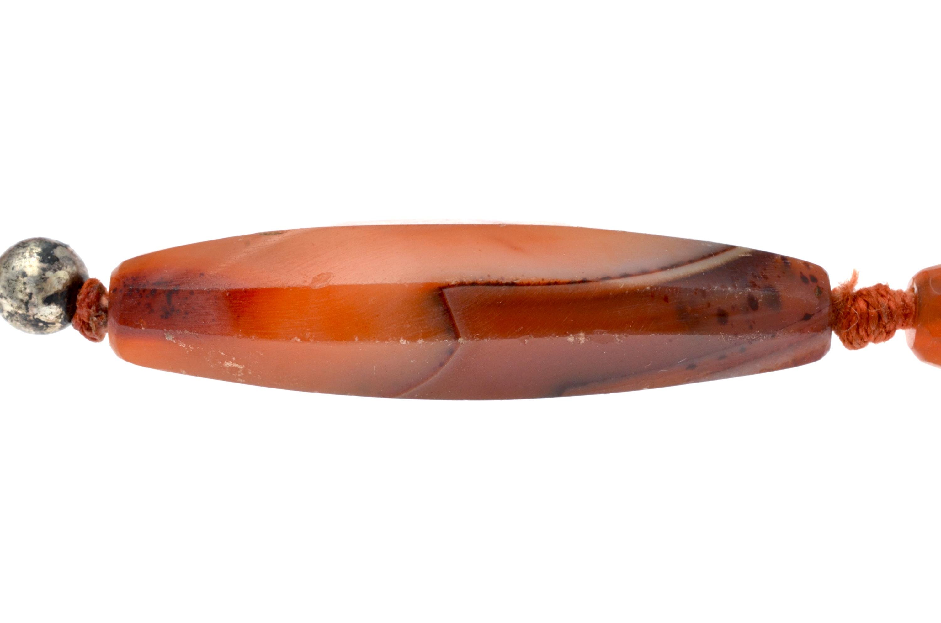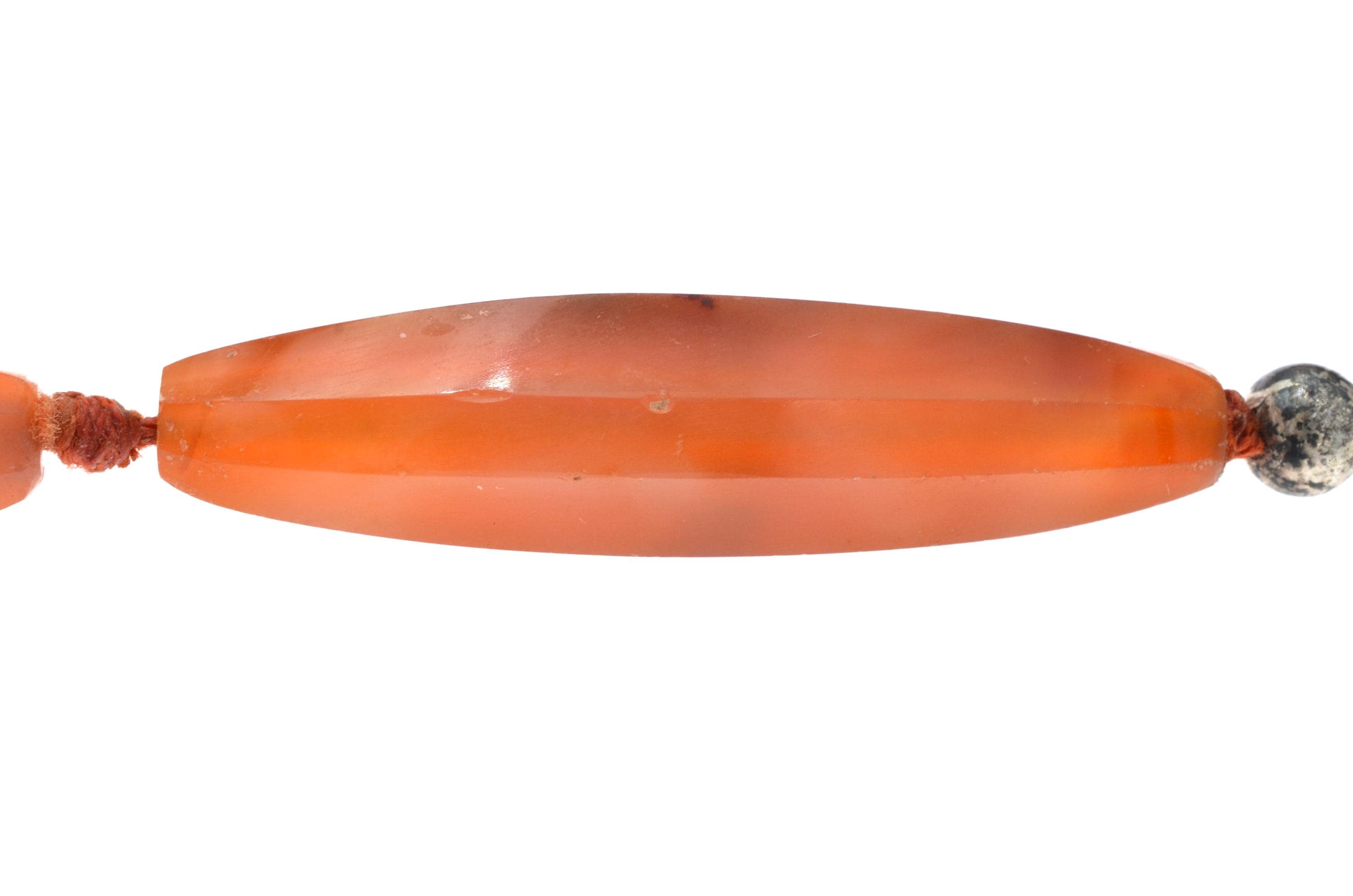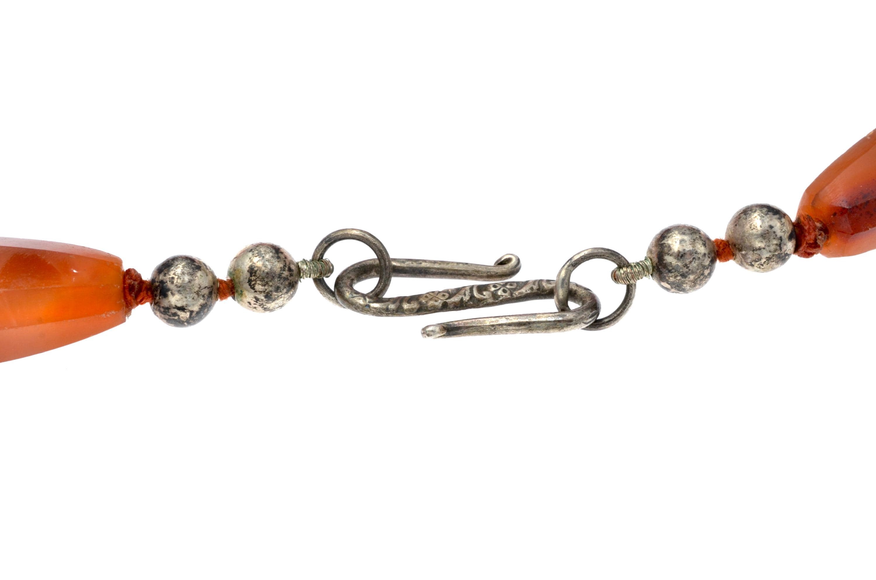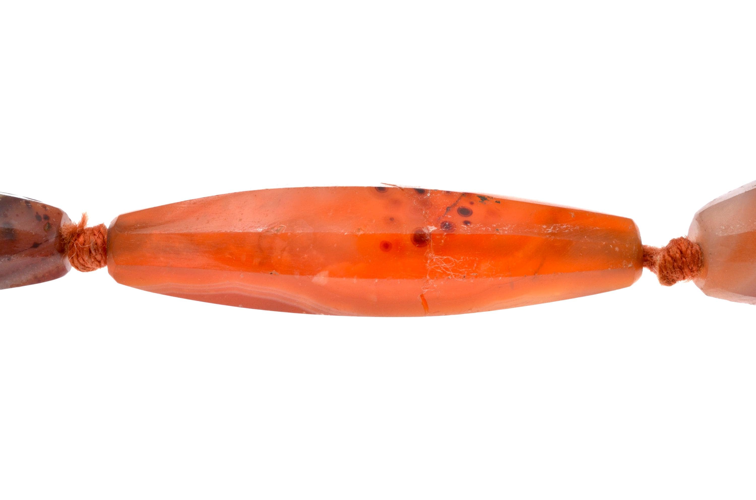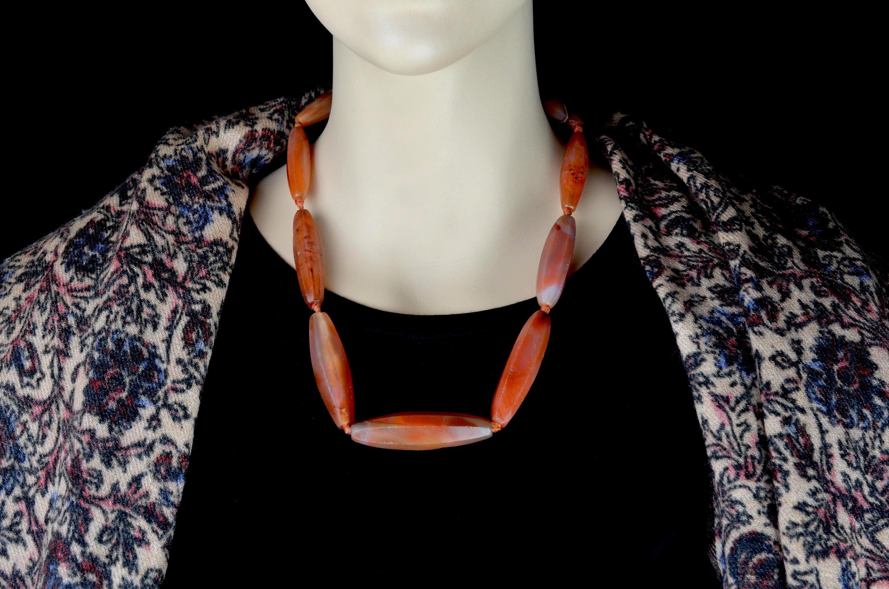Necklace composed of carnelian beads from the North African and trans-Saharan sphere, late 19th – early 20th century. Set of elongated fusiform beads with longitudinal facets, hand-cut and shaped according to an Indian cutting tradition (Gujarat region). Natural orange-red tones with visible internal inclusions and color variations. Surfaces show wear, small impact marks and patina consistent with age and use. Beads separated by knots in a traditional stringing method. Metal clasp added later. Female adornment integrated into North African ornamental traditions and trans-Saharan trade networks.