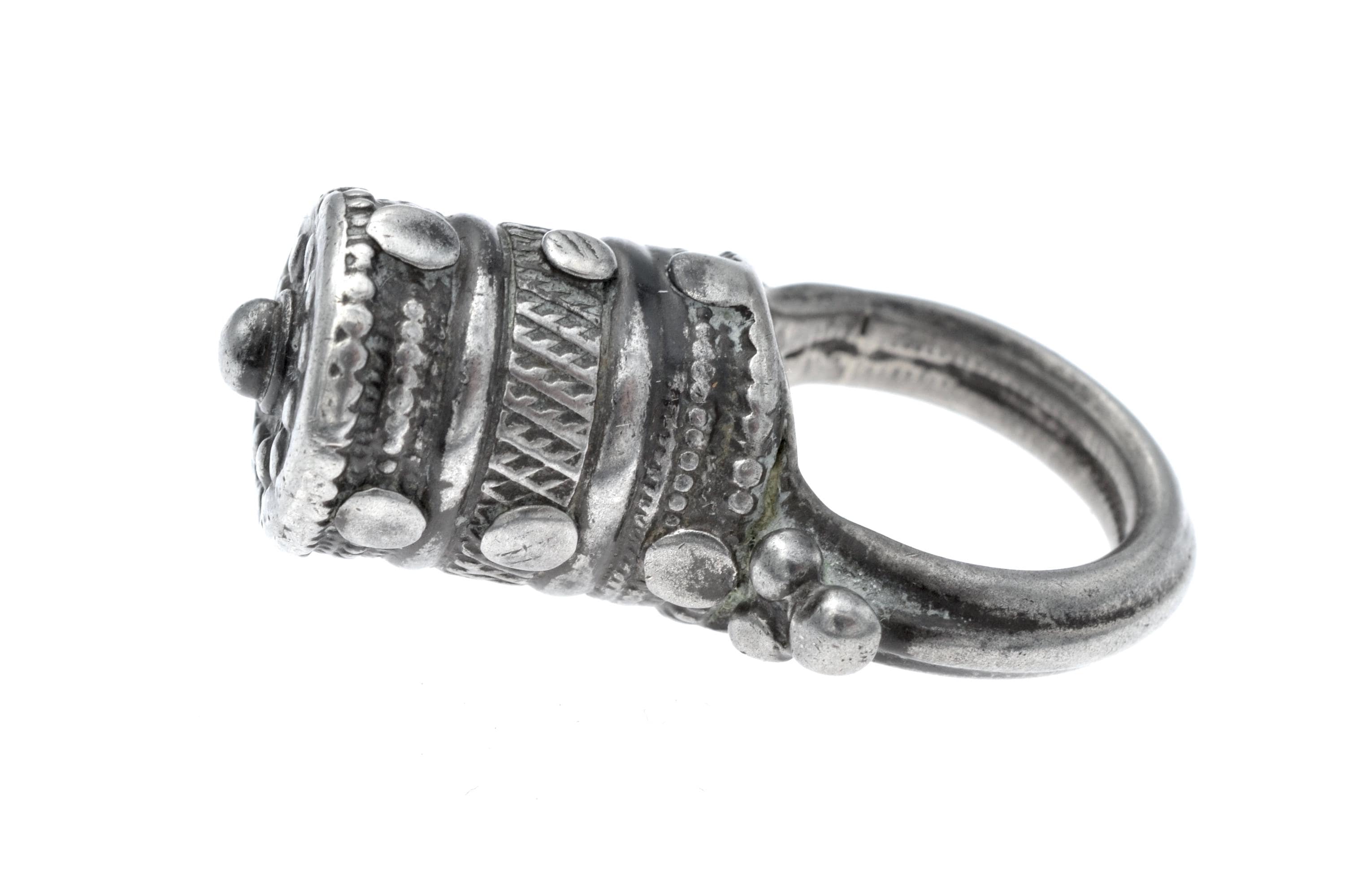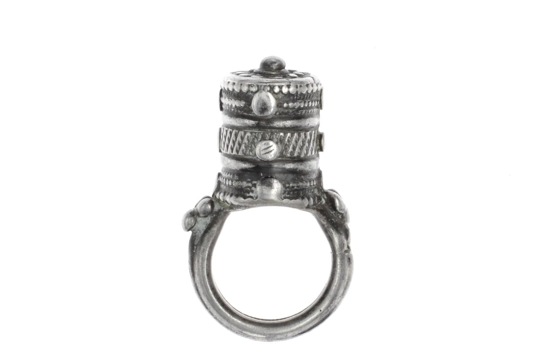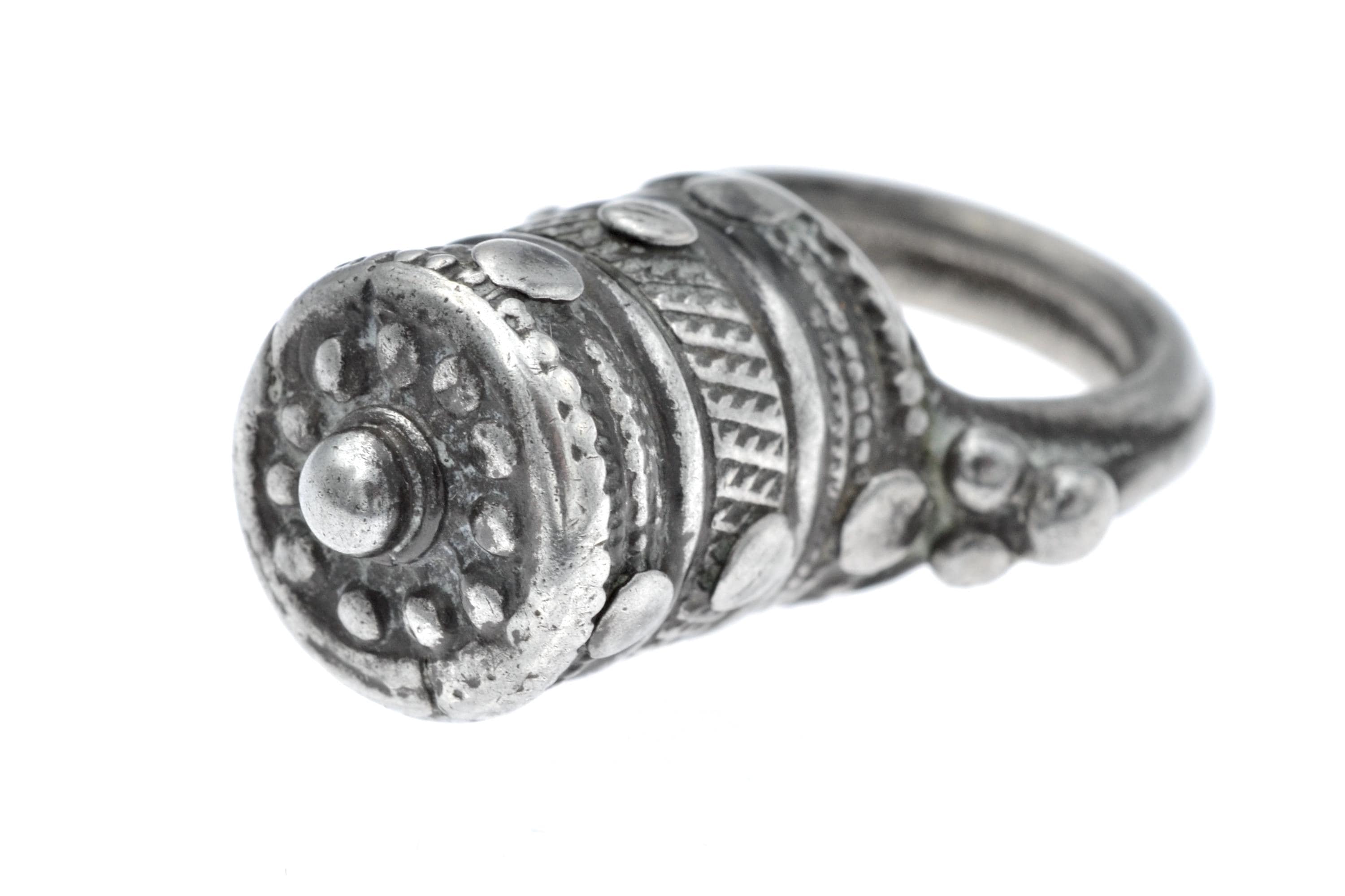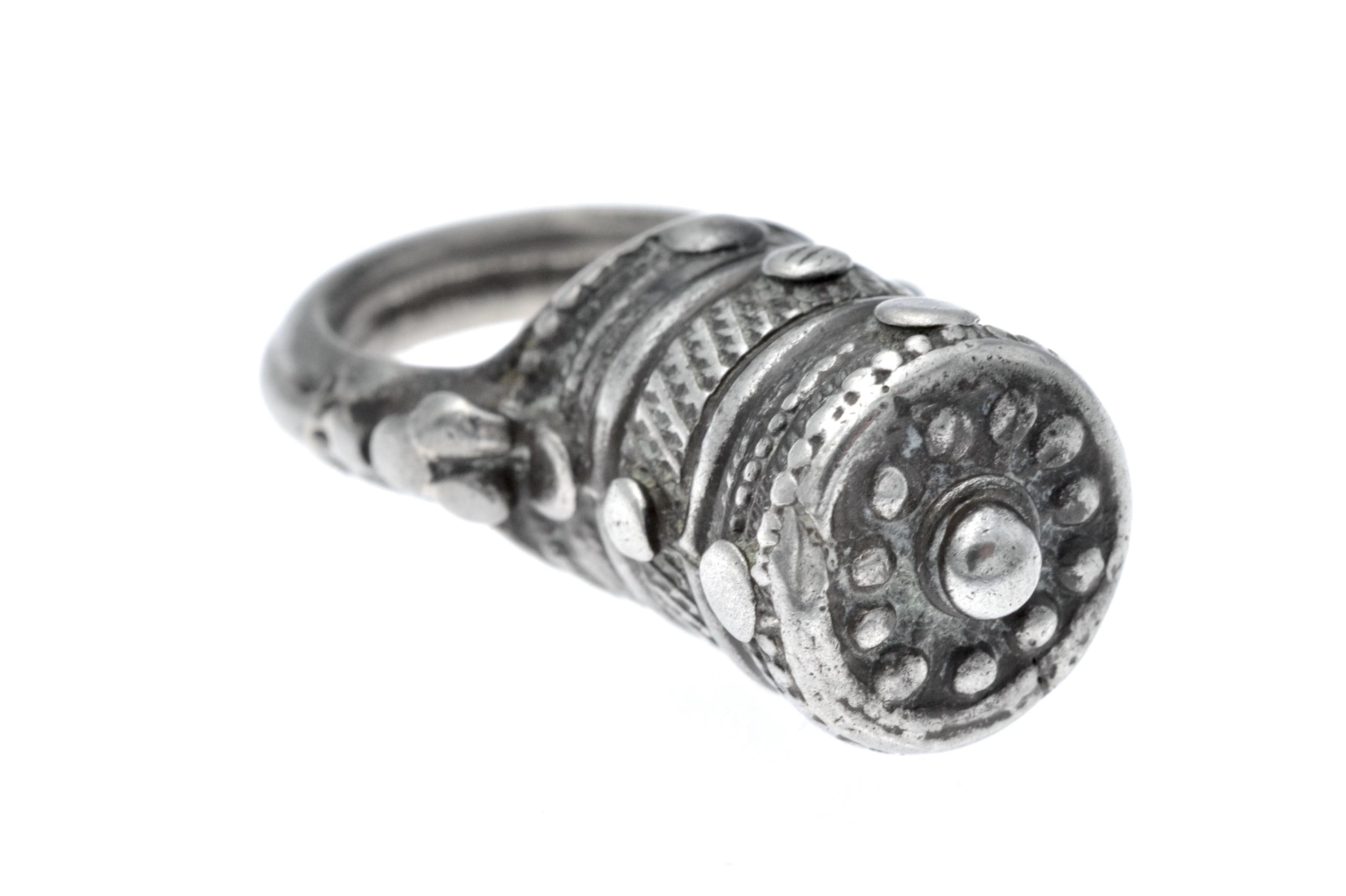 This ring features a prominent cylindrical shape. The top is adorned with circular relief patterns characteristic of Yemeni tribal designs. The body is decorated with evenly spaced horizontal ridges, resembling a drum. The material is traditional hammered silver. The "tower" shape reflects utilitarian and symbolic influences tied to Rashaida tribal identity and cultural wealth. Such rings were often gifted during important ceremonies or worn as protective talismans.