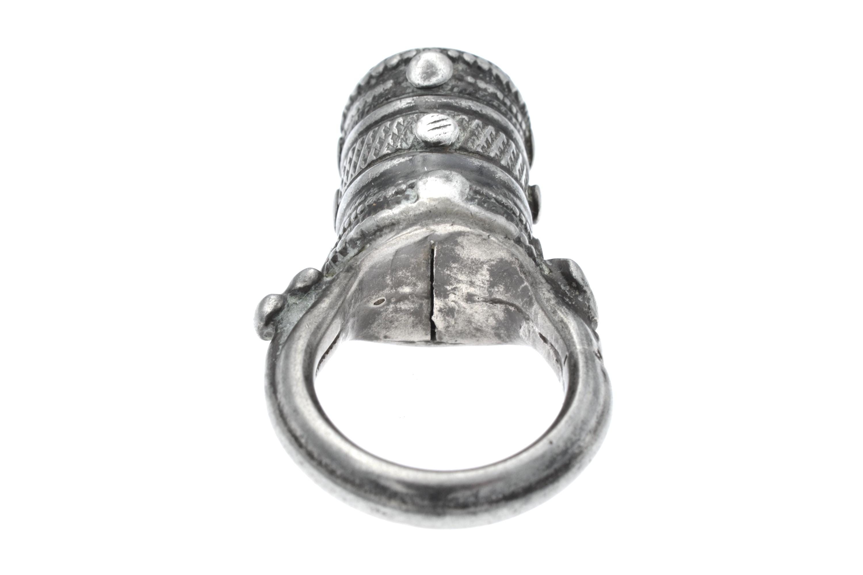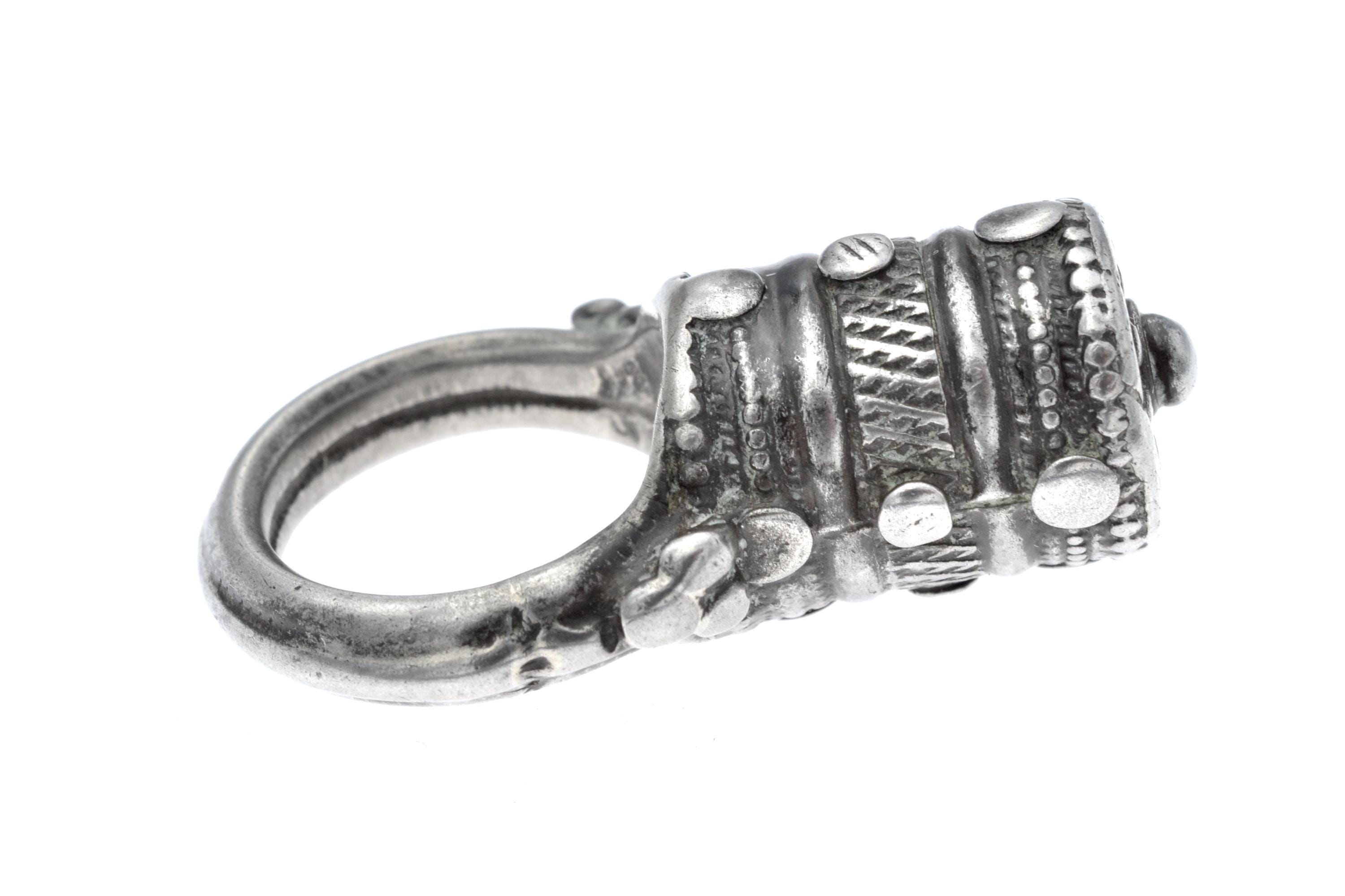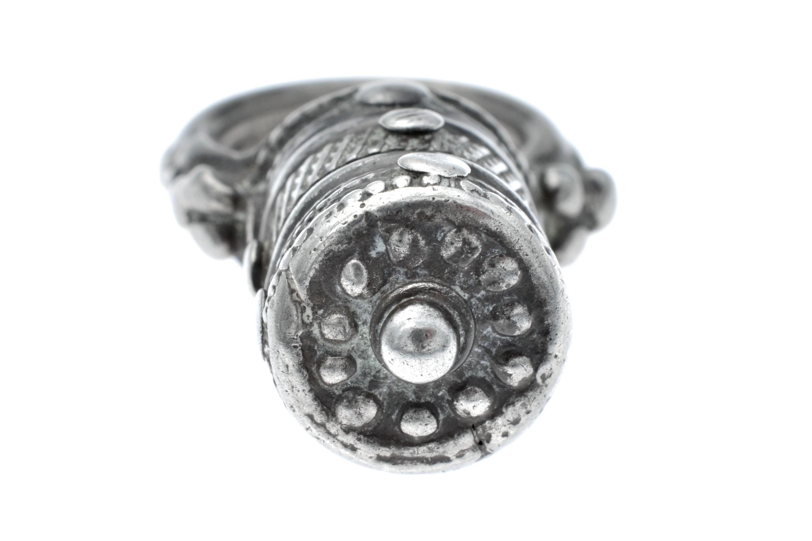 This ring features a prominent cylindrical shape. The top is adorned with circular relief patterns characteristic of Yemeni tribal designs. The body is decorated with evenly spaced horizontal ridges, resembling a drum. The material is traditional hammered silver. The "tower" shape reflects utilitarian and symbolic influences tied to Rashaida tribal identity and cultural wealth. Such rings were often gifted during important ceremonies or worn as protective talismans.
