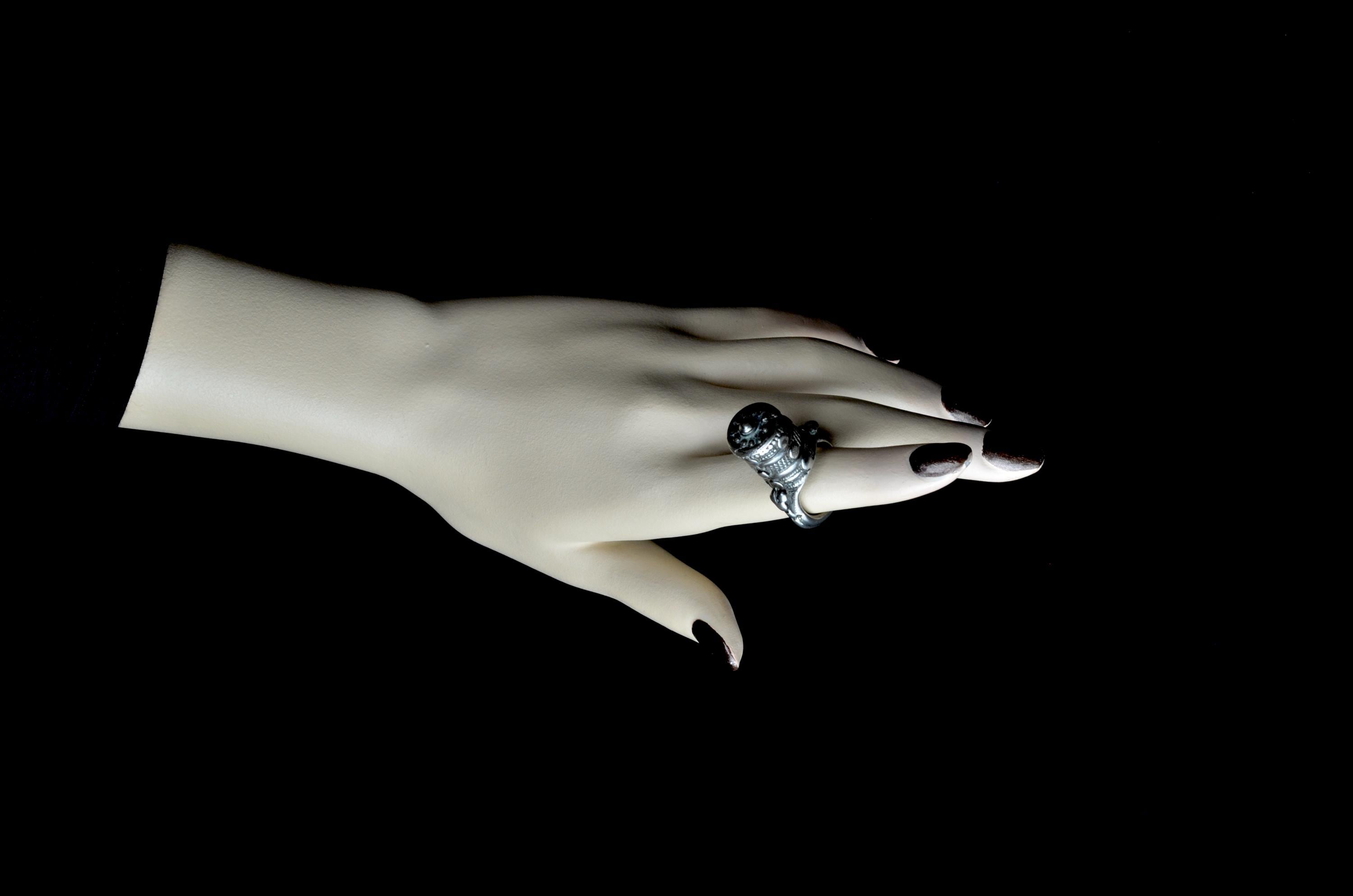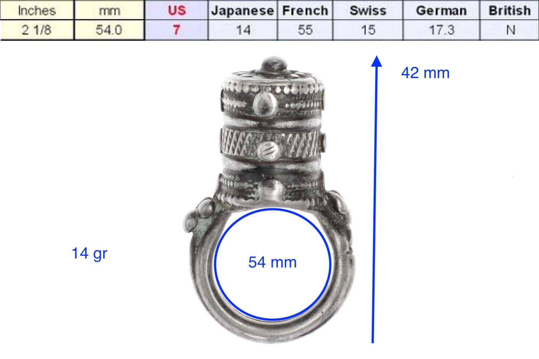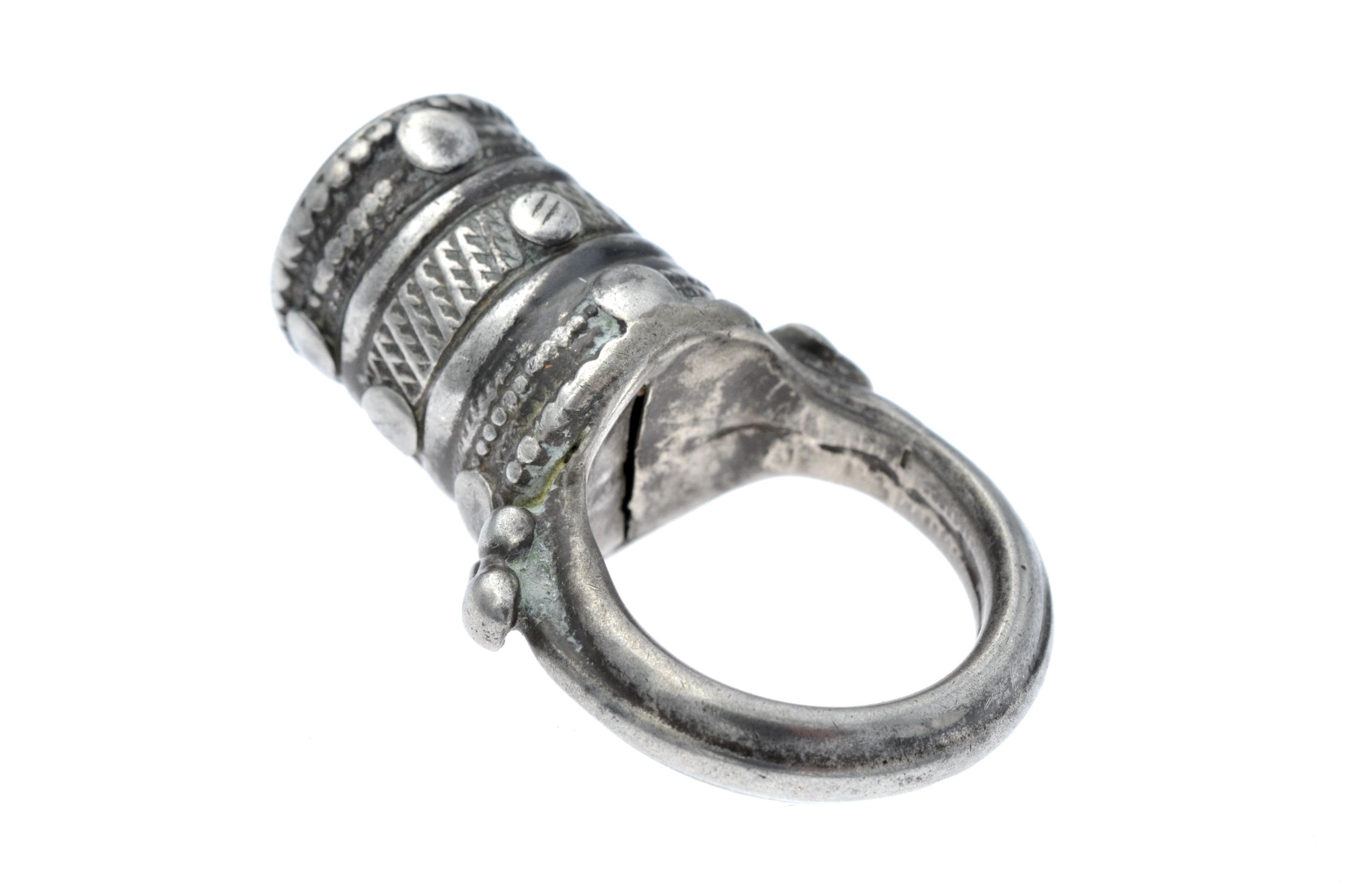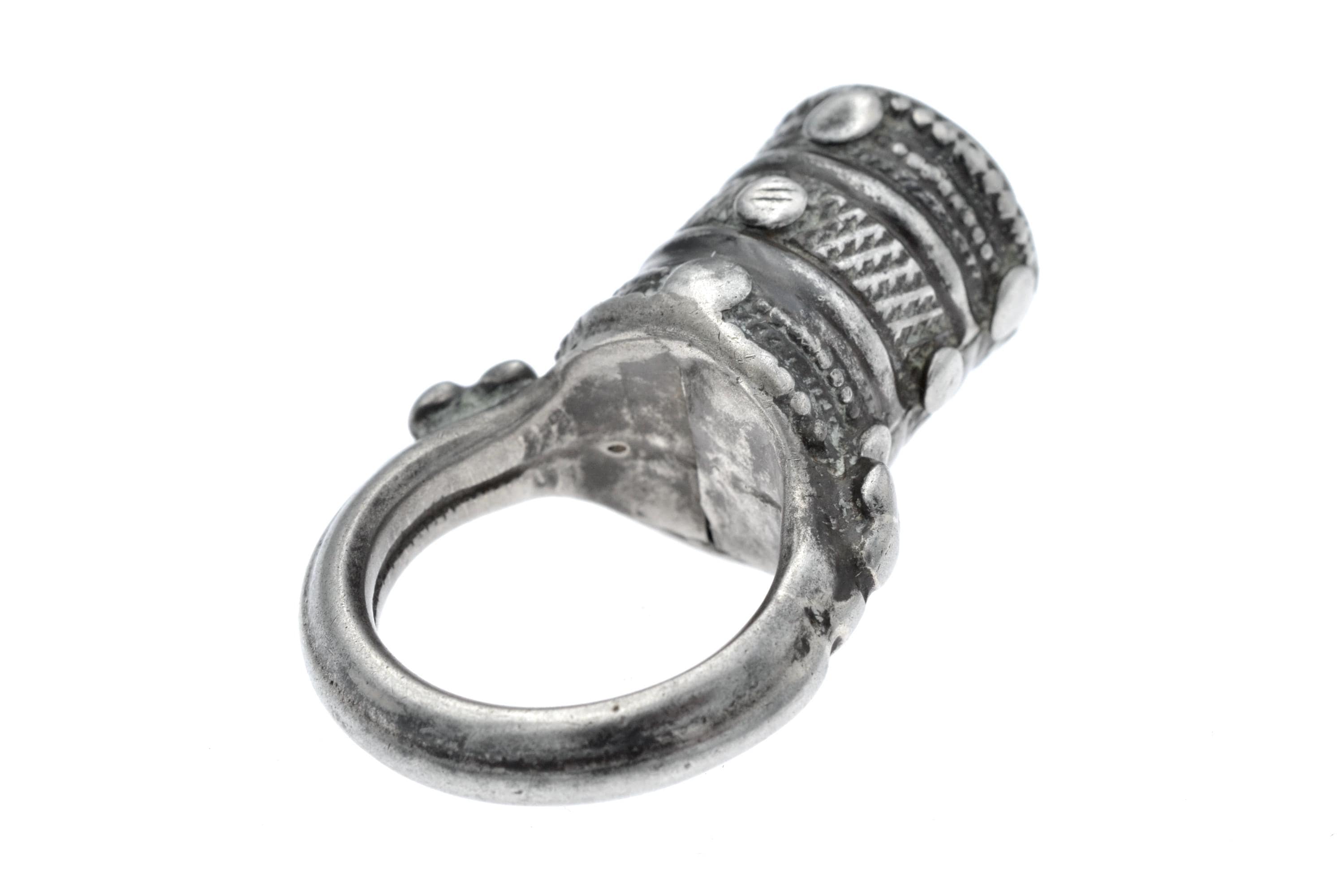 This ring features a prominent cylindrical shape. The top is adorned with circular relief patterns characteristic of Yemeni tribal designs. The body is decorated with evenly spaced horizontal ridges, resembling a drum. The material is traditional hammered silver. The "tower" shape reflects utilitarian and symbolic influences tied to Rashaida tribal identity and cultural wealth. Such rings were often gifted during important ceremonies or worn as protective talismans.