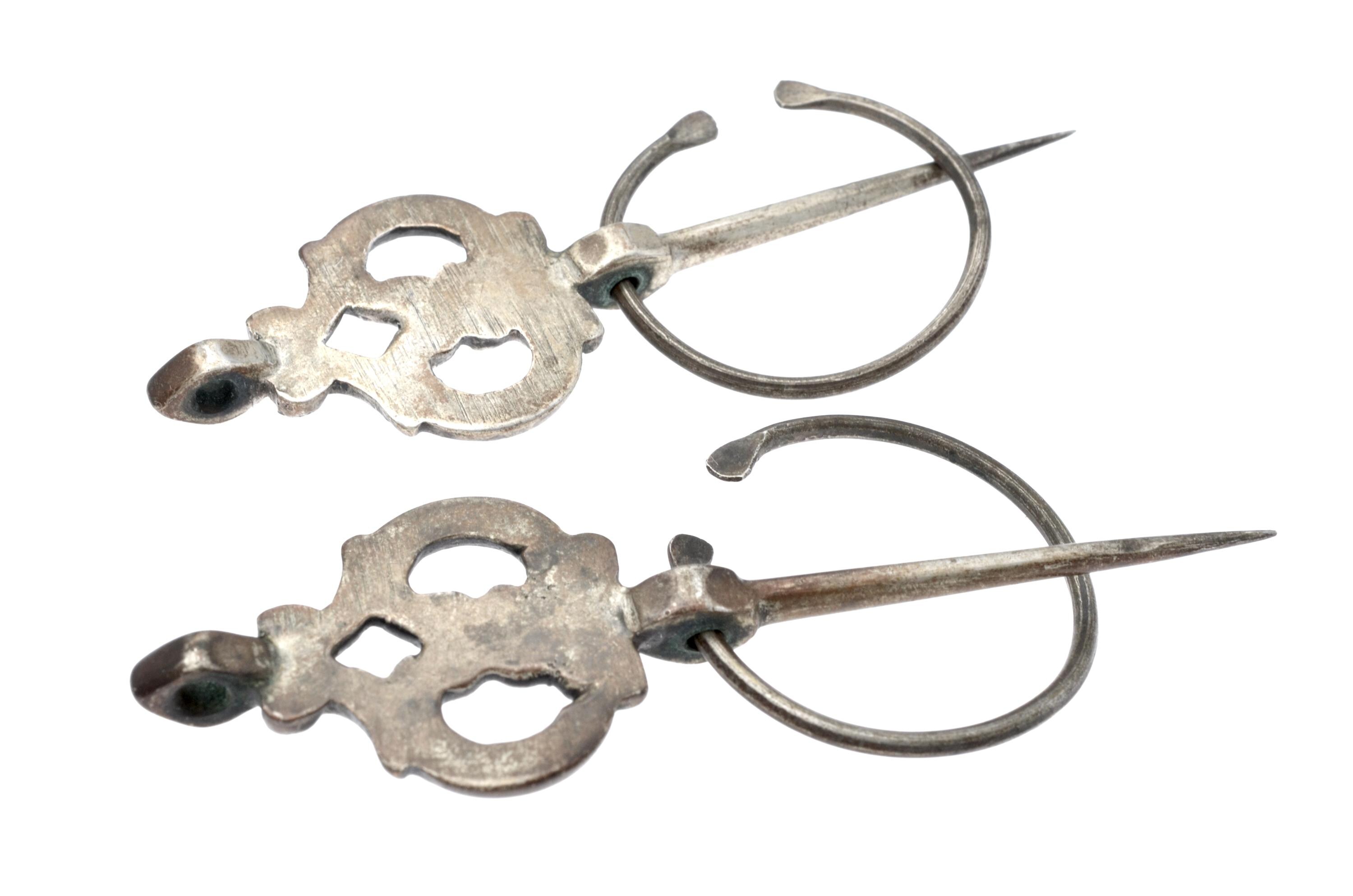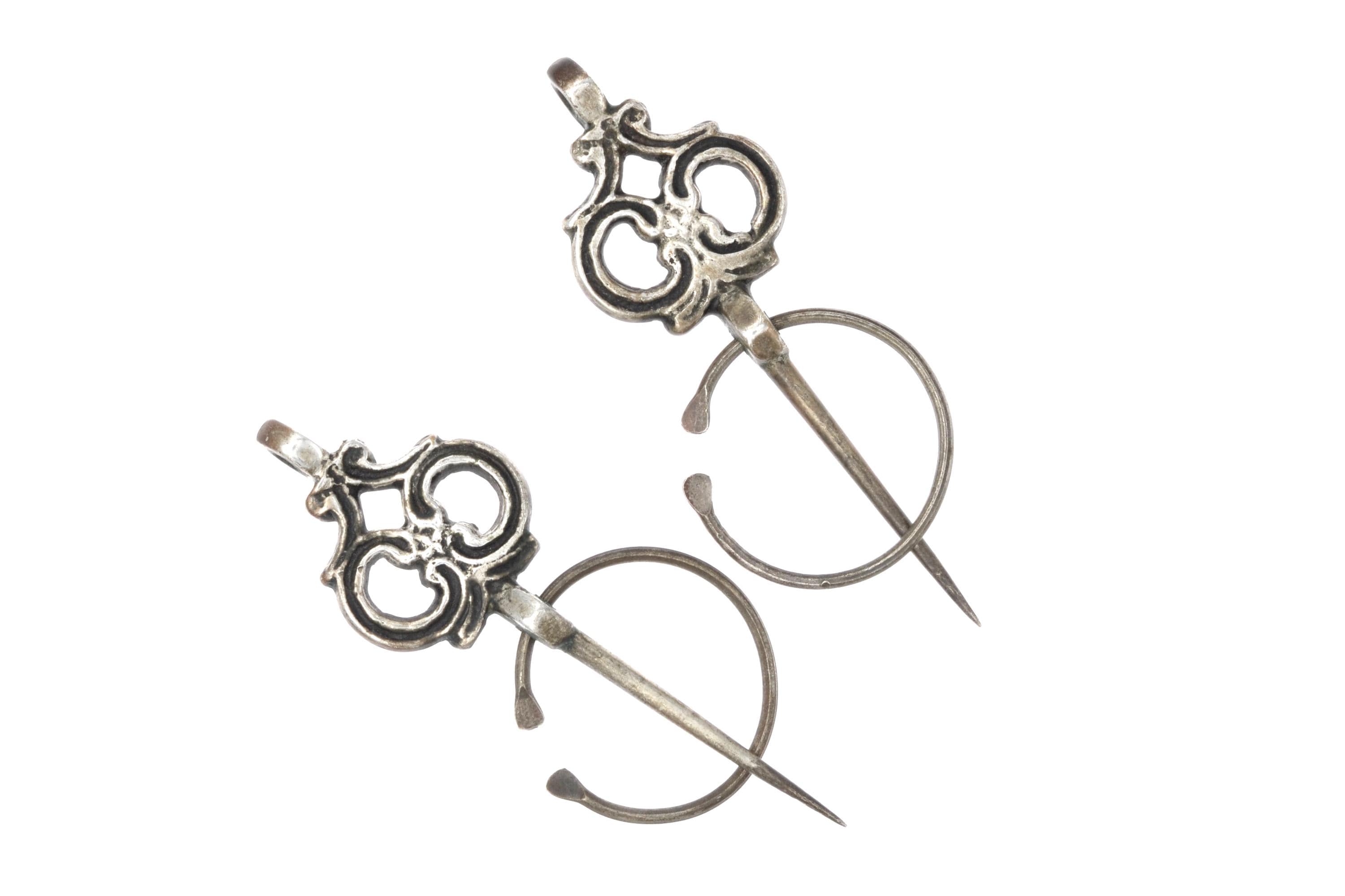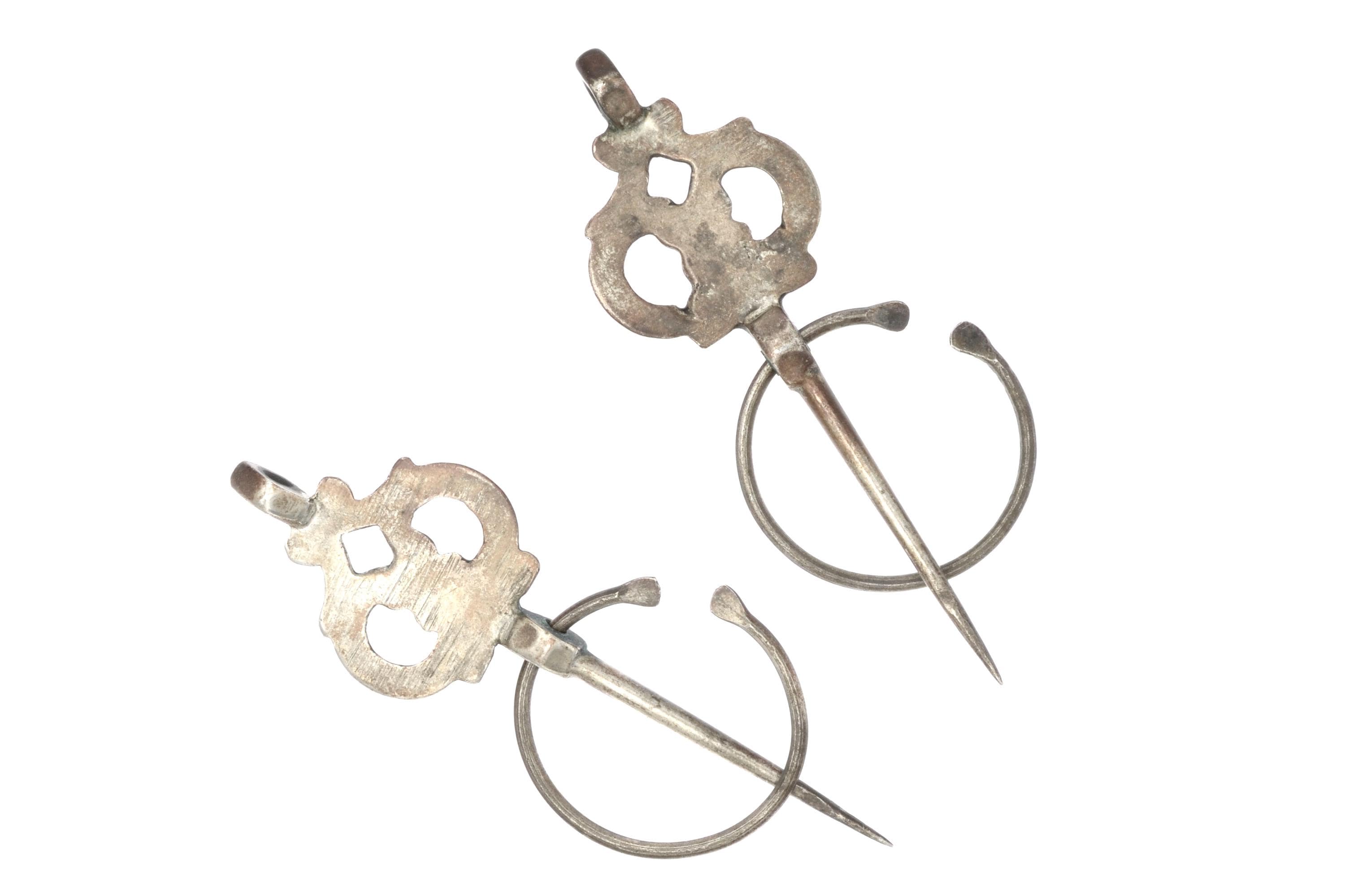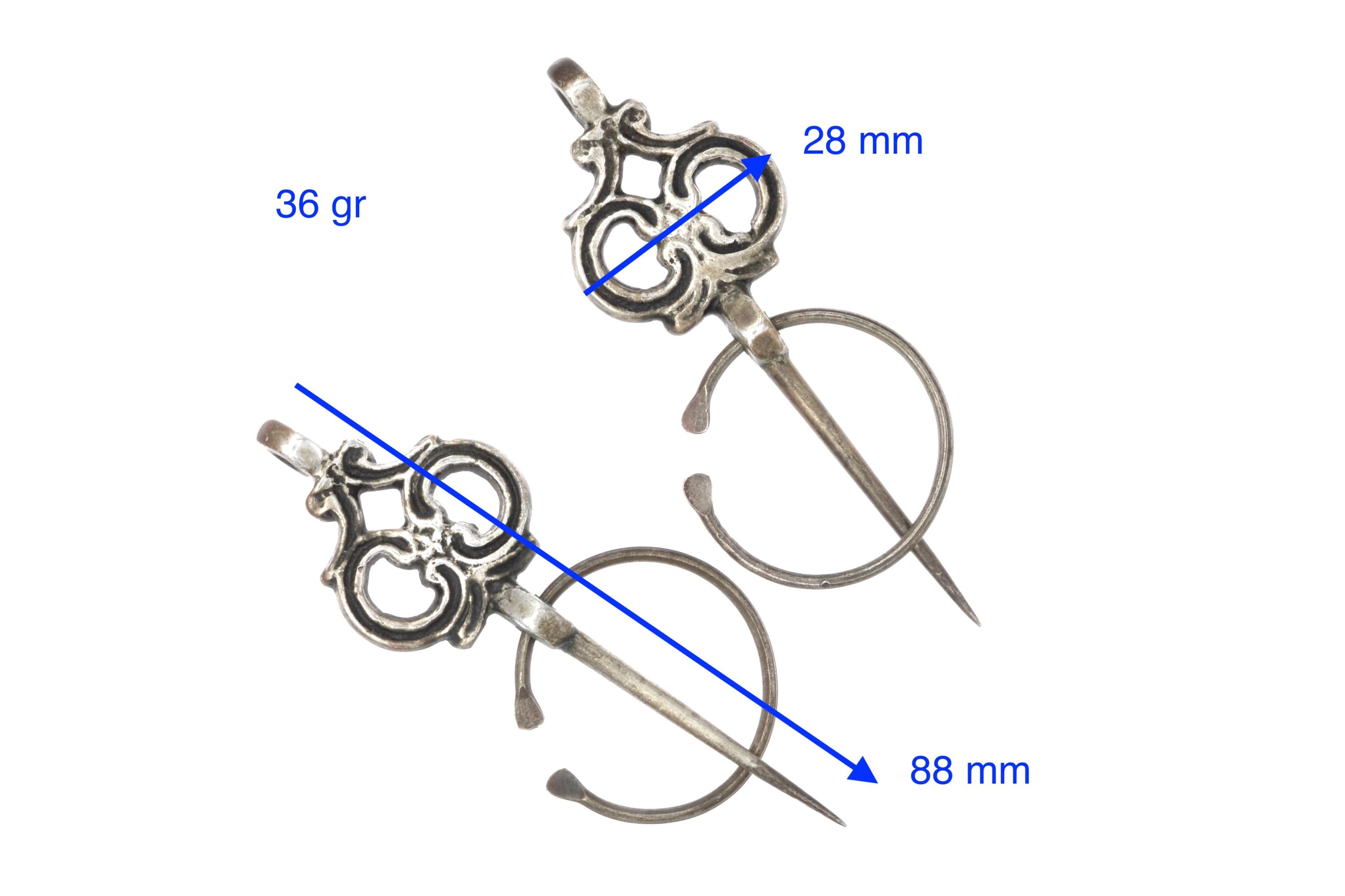 Fibula (tazerzit) from the Ait Baha area, Souss, western Anti-Atlas, Morocco, late 19th – early 20th century. Cast silver subsequently hand-finished. Openwork trilobed/quadrilobed plaque with symmetrical curvilinear relief decoration. Lower rounded terminal. Long straight tapered pin with circular movable ring. Surface shows patina and wear consistent with age. Amazigh female garment fastener from the Souss region.