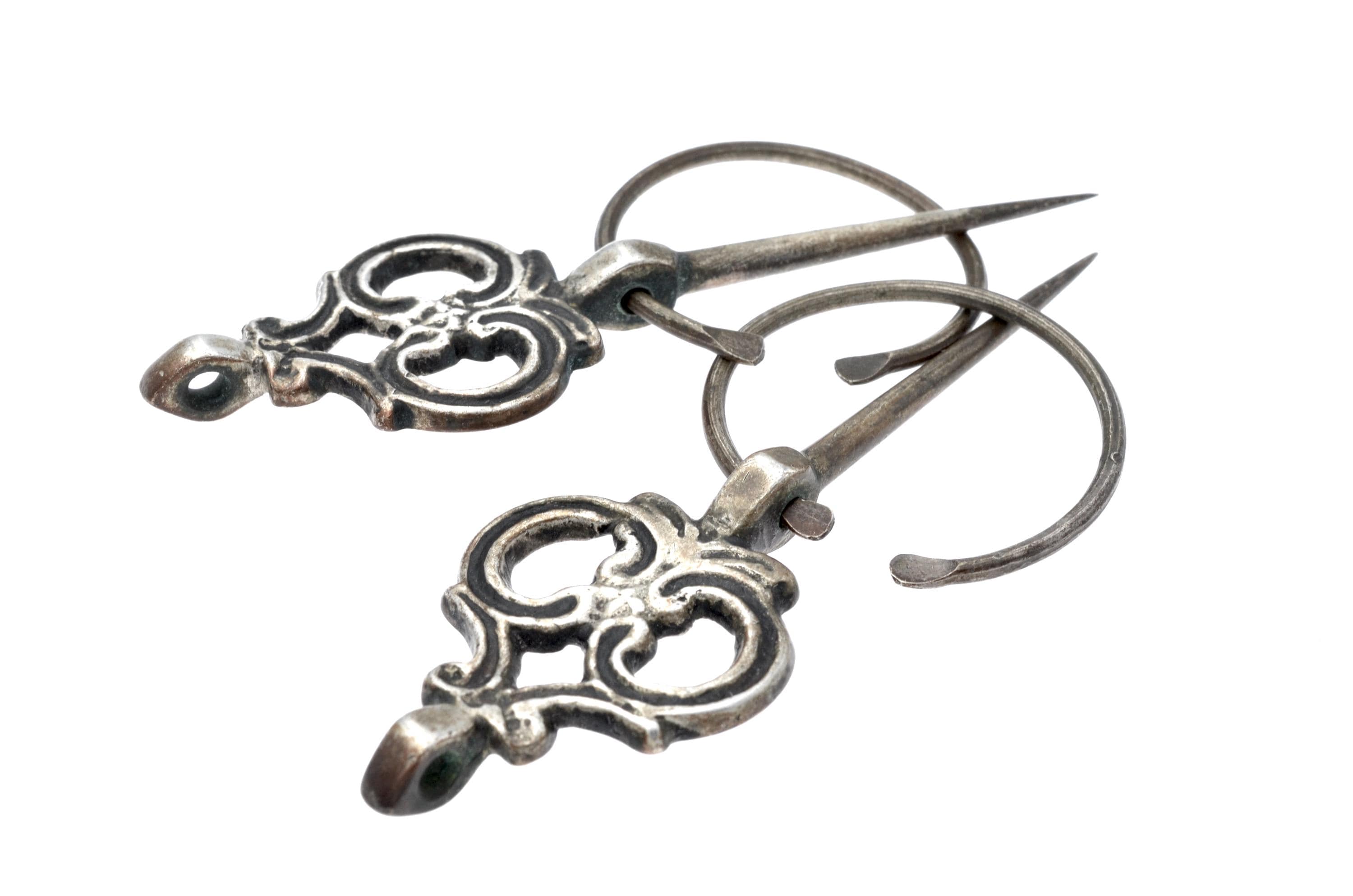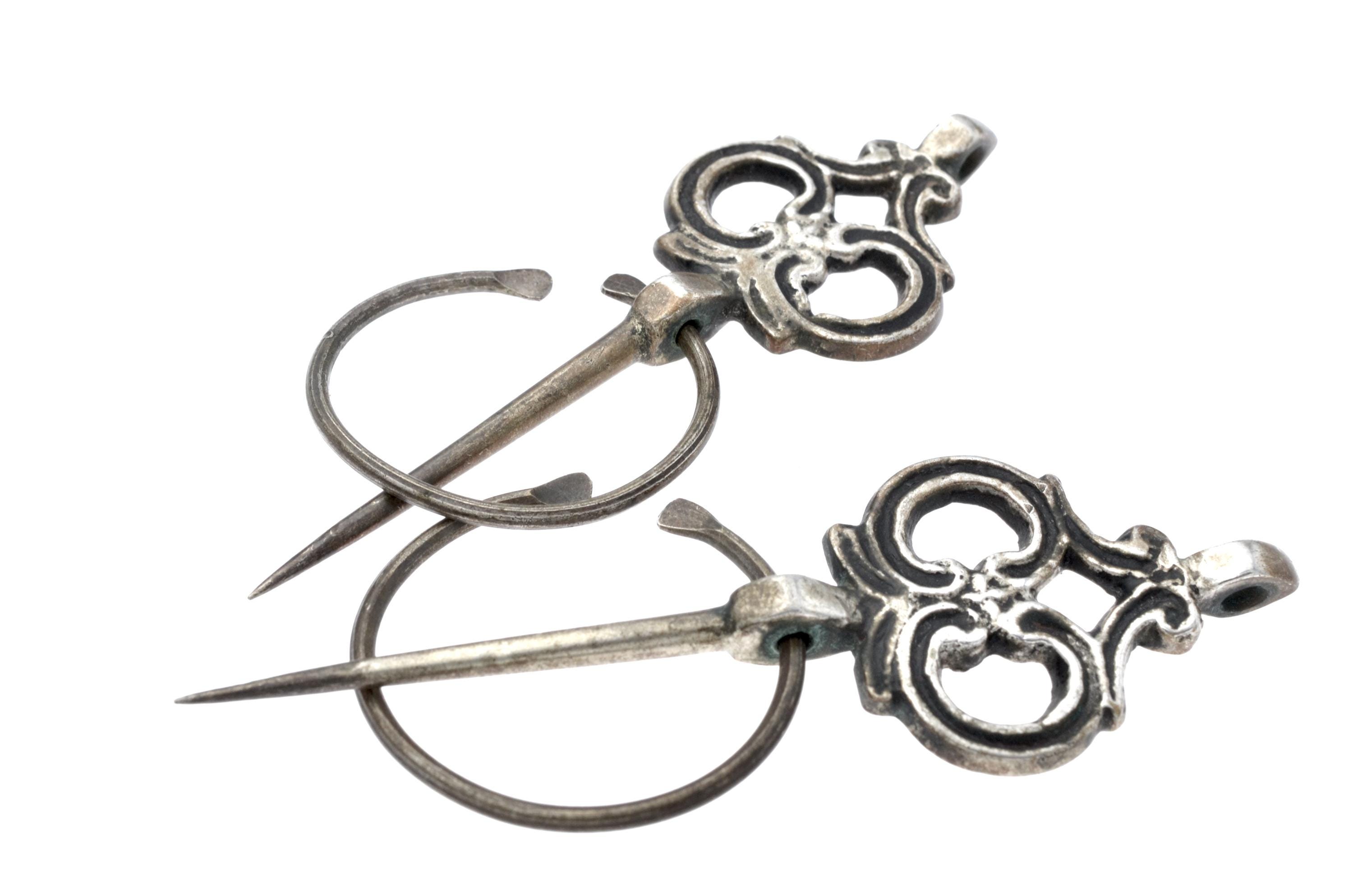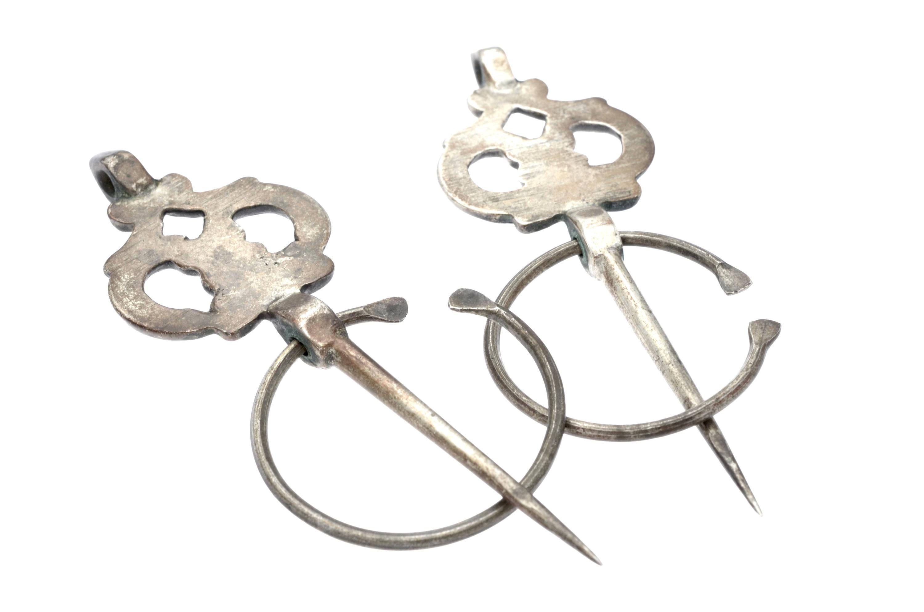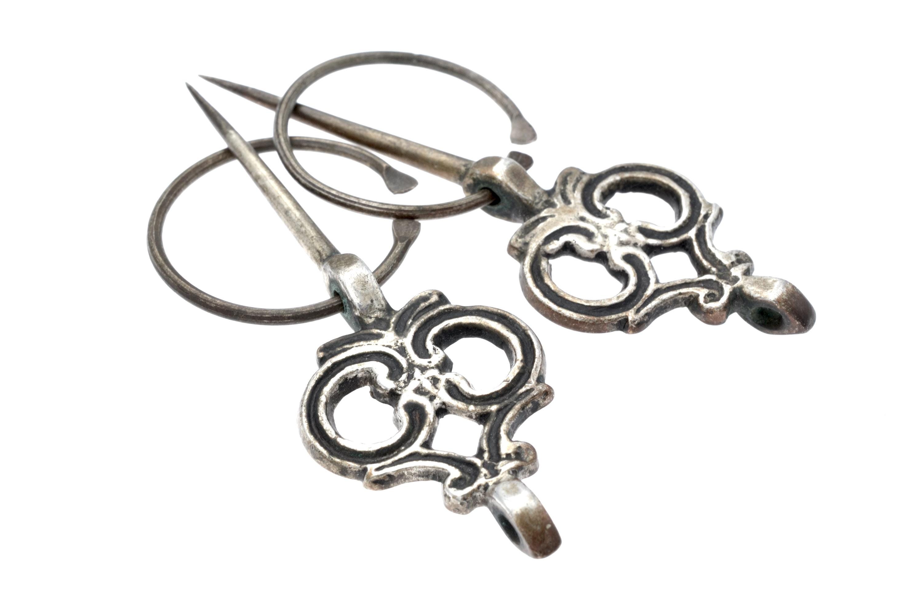 Fibula (tazerzit) from the Ait Baha area, Souss, western Anti-Atlas, Morocco, late 19th – early 20th century. Cast silver subsequently hand-finished. Openwork trilobed/quadrilobed plaque with symmetrical curvilinear relief decoration. Lower rounded terminal. Long straight tapered pin with circular movable ring. Surface shows patina and wear consistent with age. Amazigh female garment fastener from the Souss region.