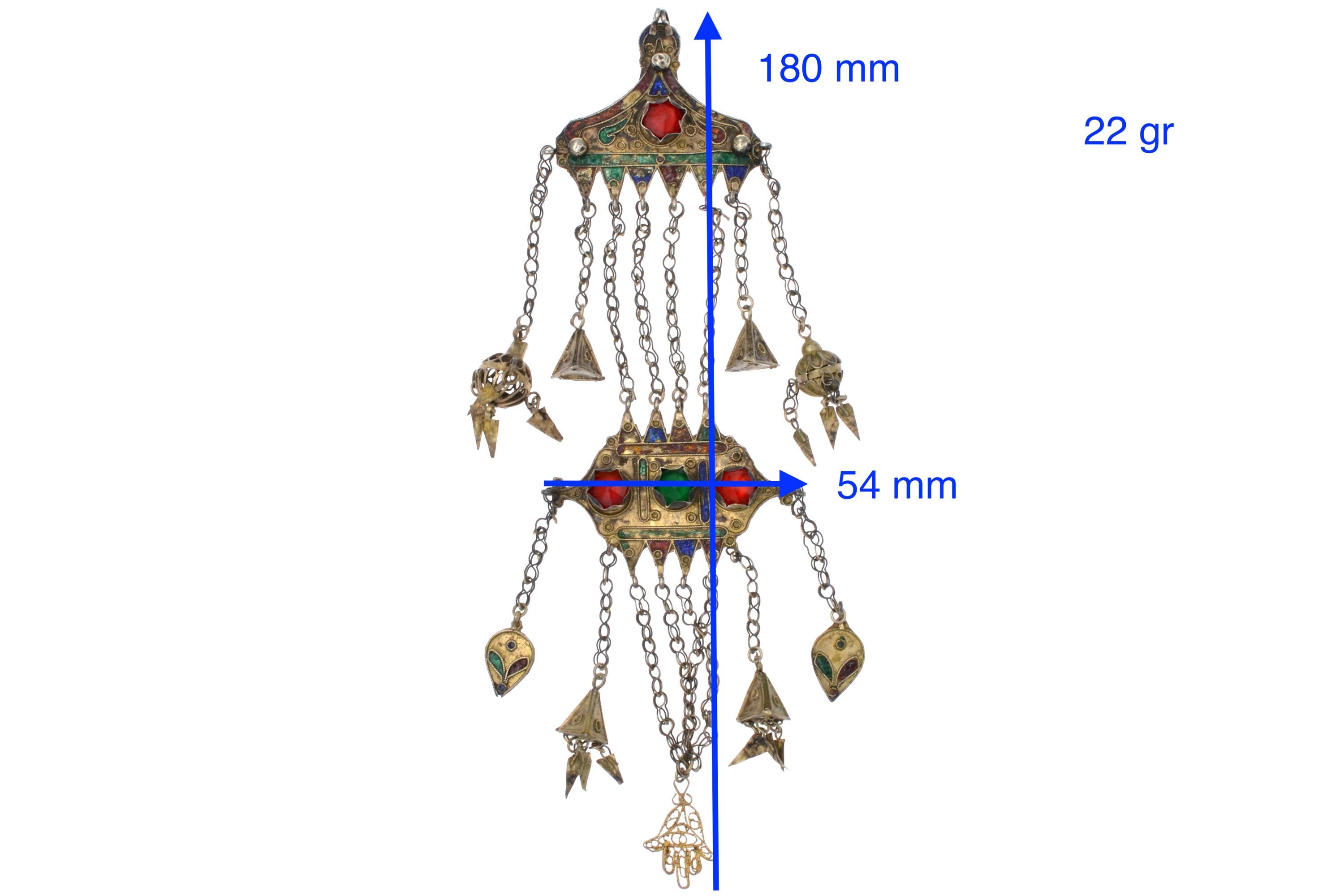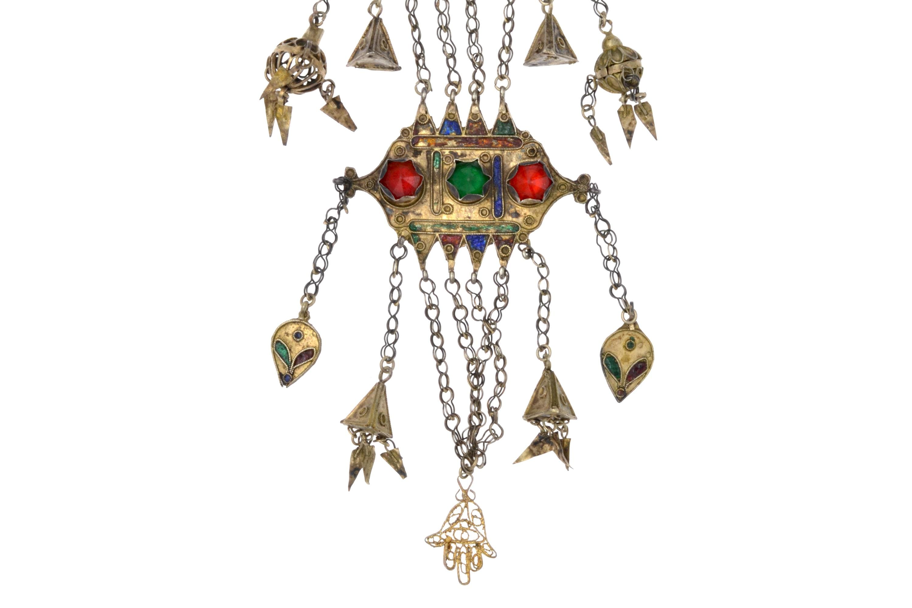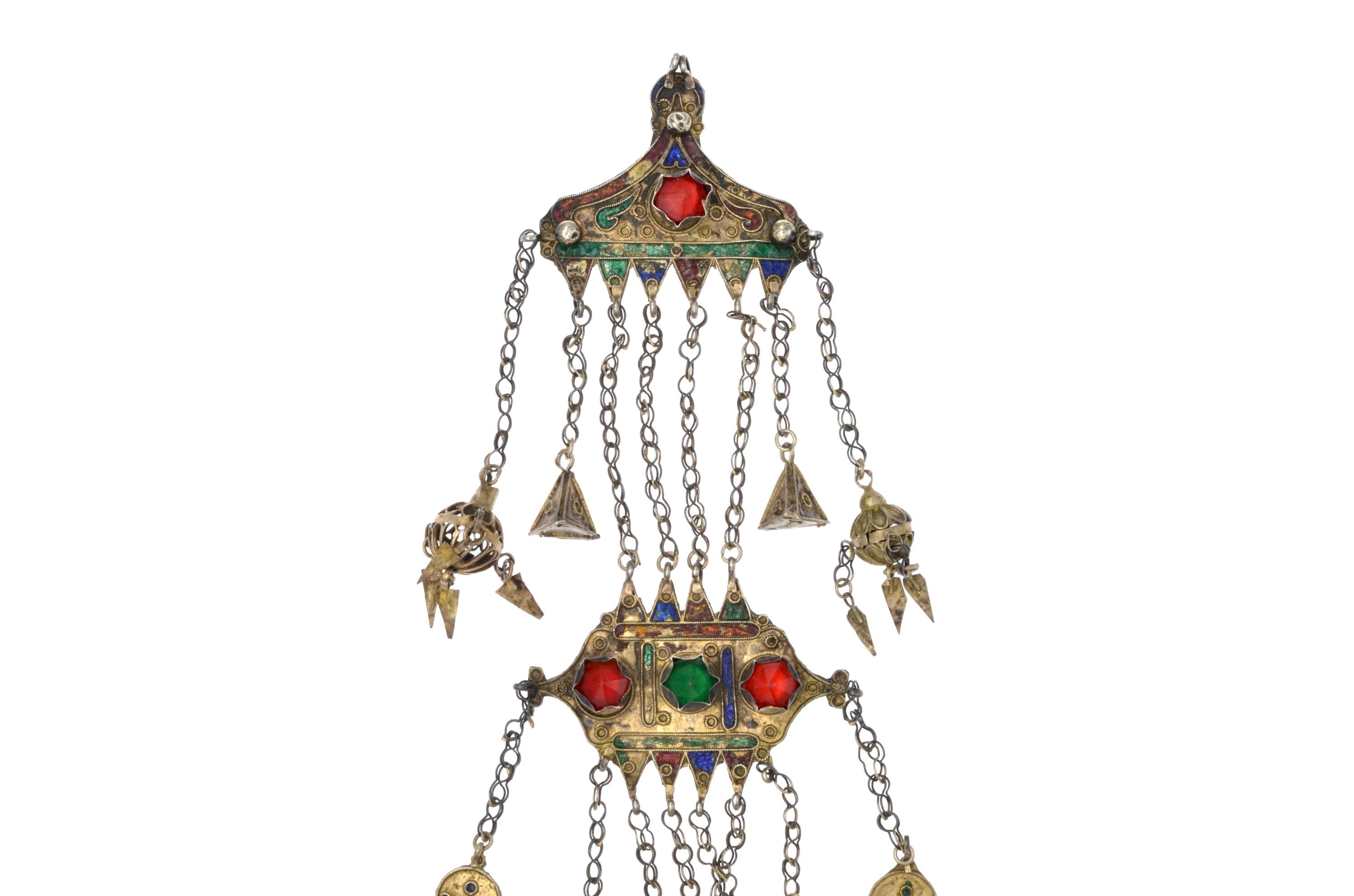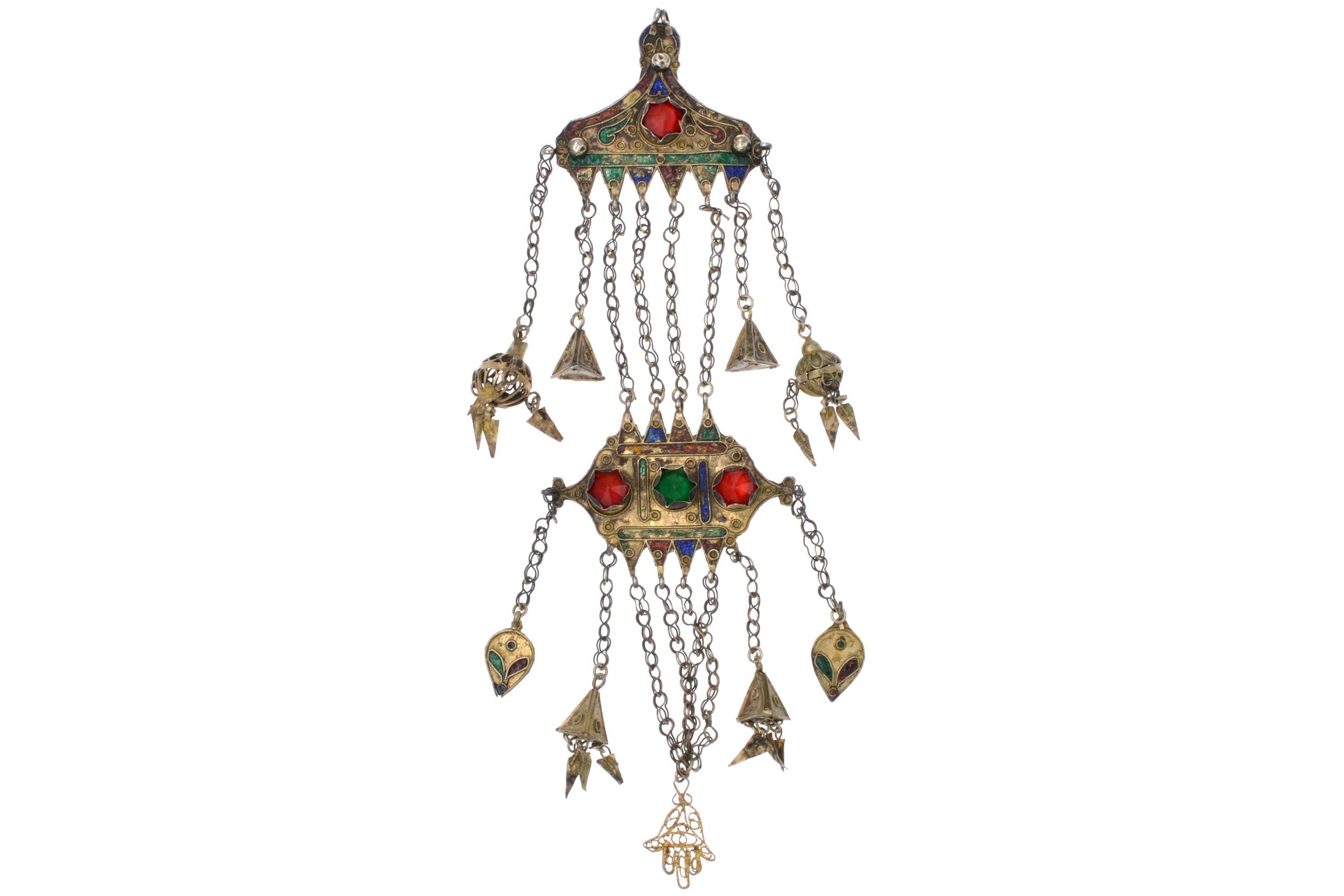 Female temporal ornament of the MNAJECH WESH type, coastal Tunisia, attributable to Mahdia or Djerba, first half of the 20th century. Partially gilded silver with polychrome enamel decoration and raised bezel-set glass cabochons. Constructed in superimposed registers connected by multiple chain strands with conical pendants. Openwork KHAMSA terminal. Ornament fixed to the veil and worn singly on the left temple.