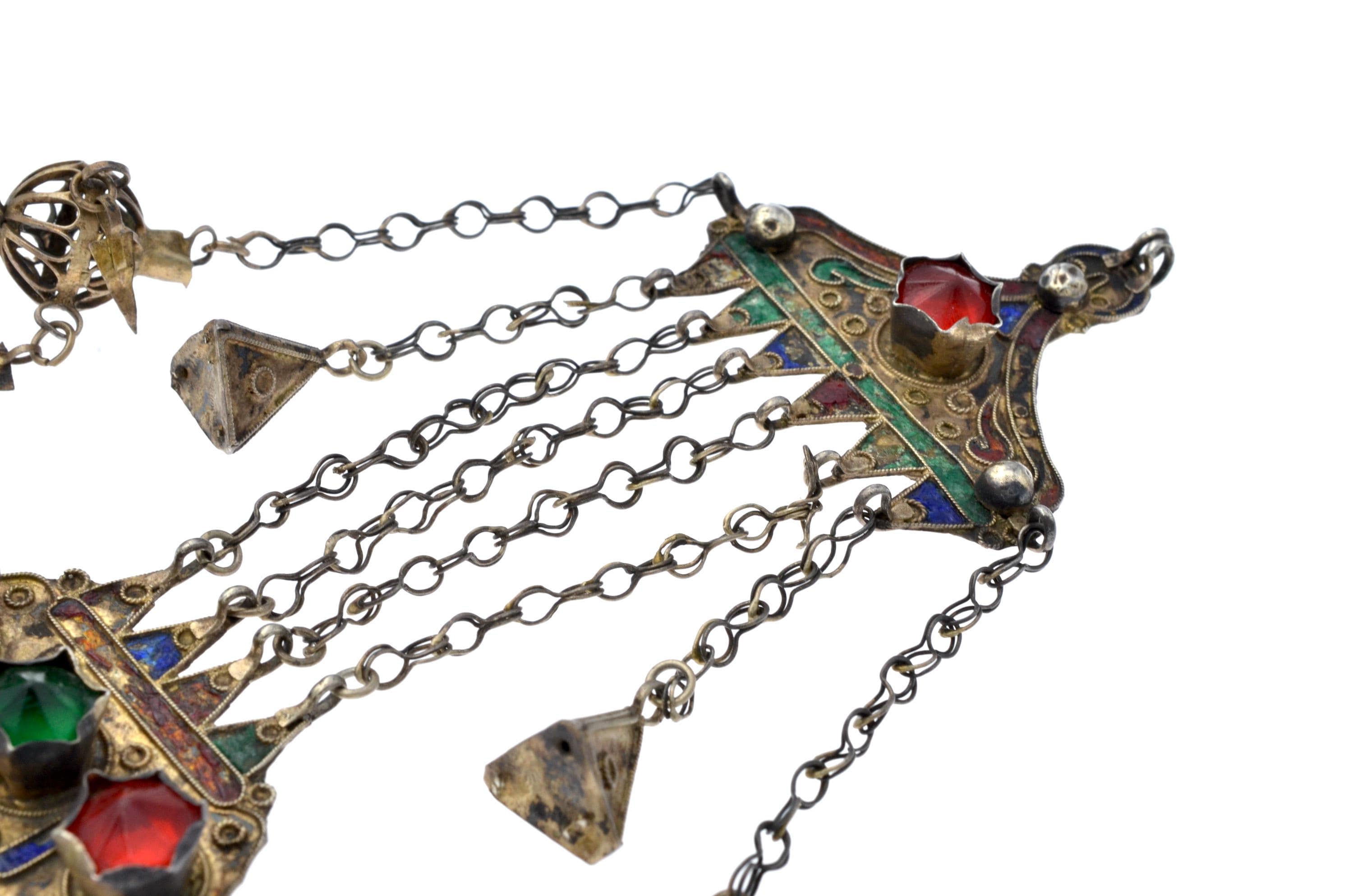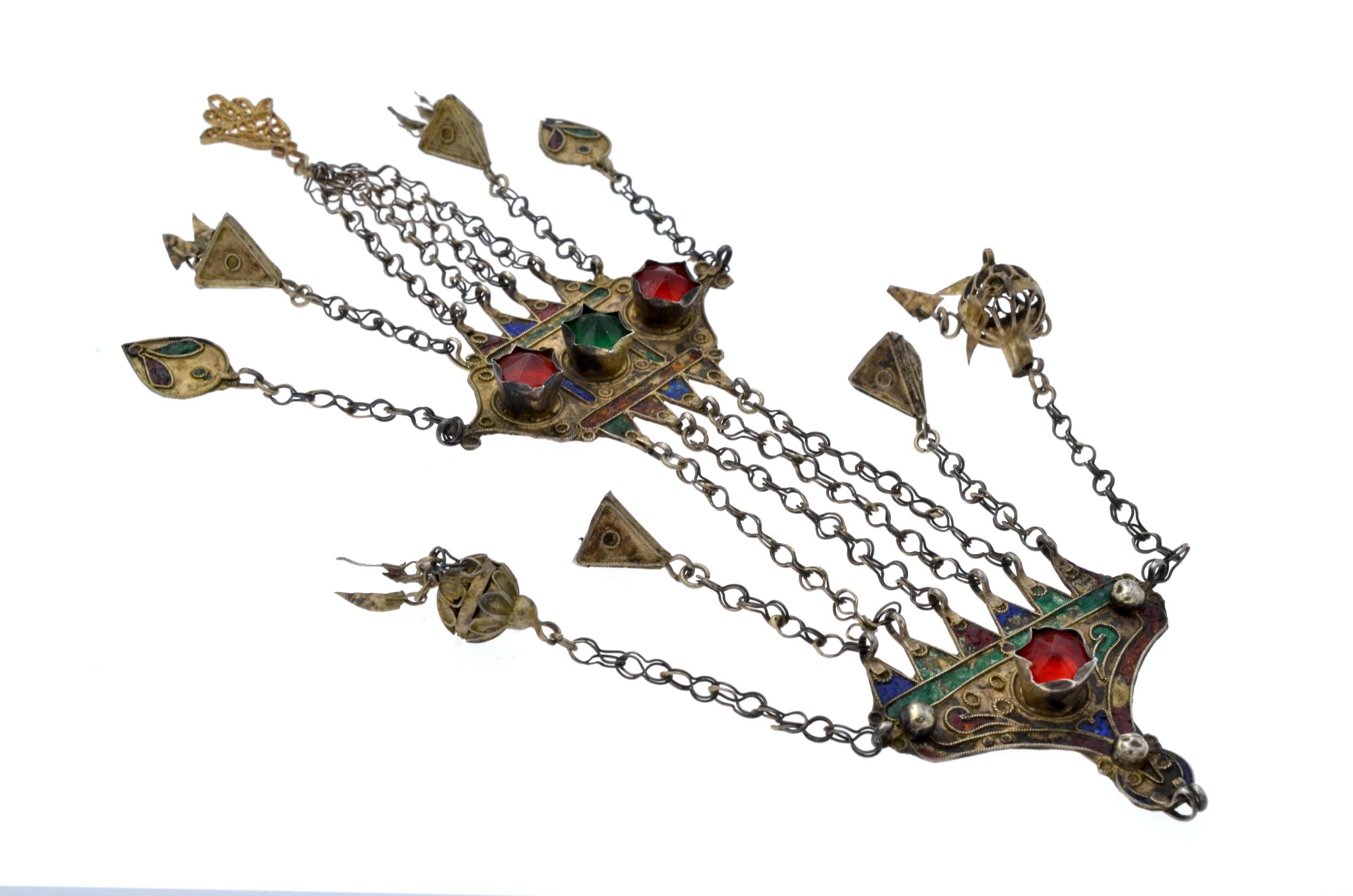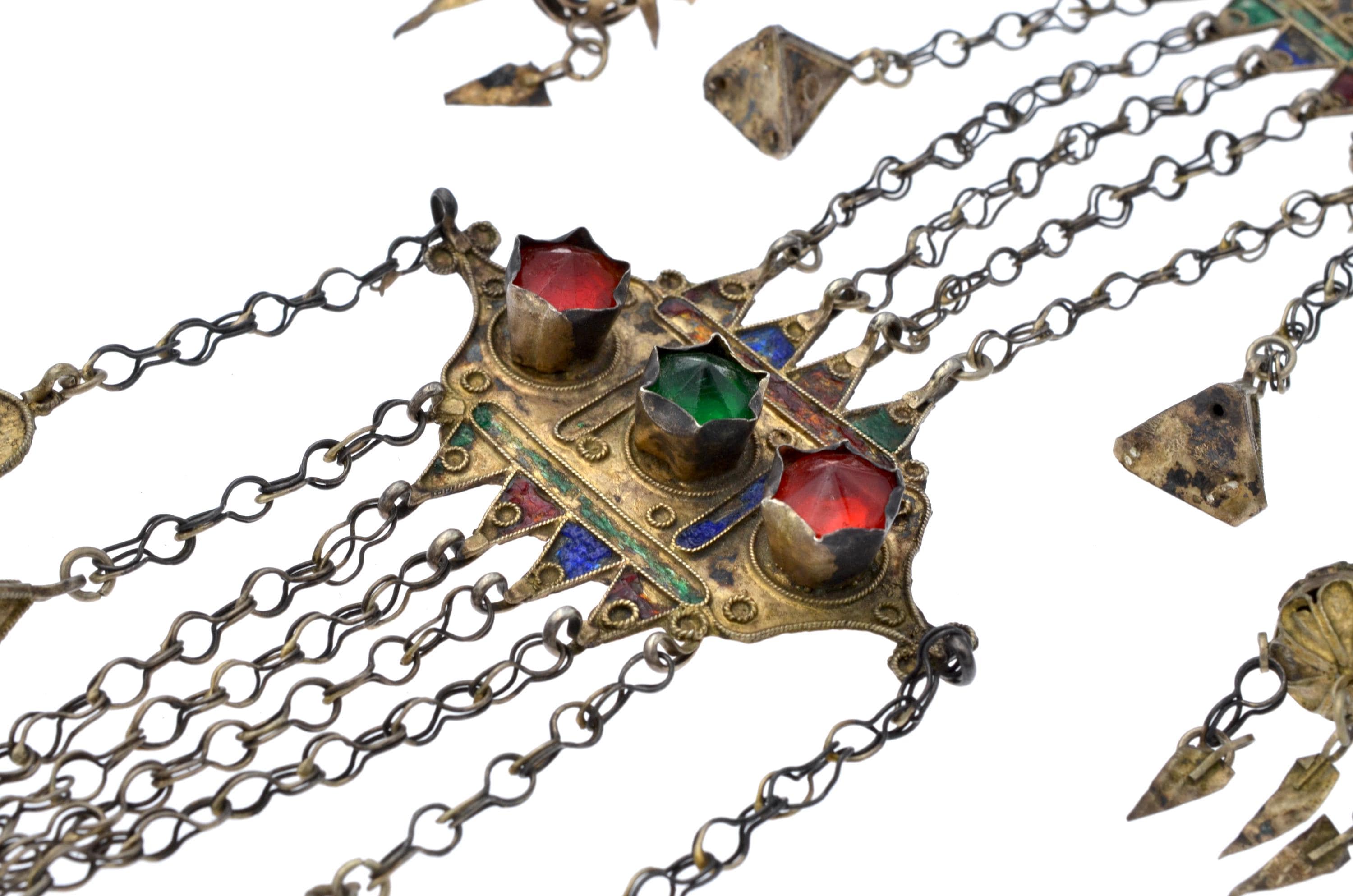 Female temporal ornament of the MNAJECH WESH type, coastal Tunisia, attributable to Mahdia or Djerba, first half of the 20th century. Partially gilded silver with polychrome enamel decoration and raised bezel-set glass cabochons. Constructed in superimposed registers connected by multiple chain strands with conical pendants. Openwork KHAMSA terminal. Ornament fixed to the veil and worn singly on the left temple.