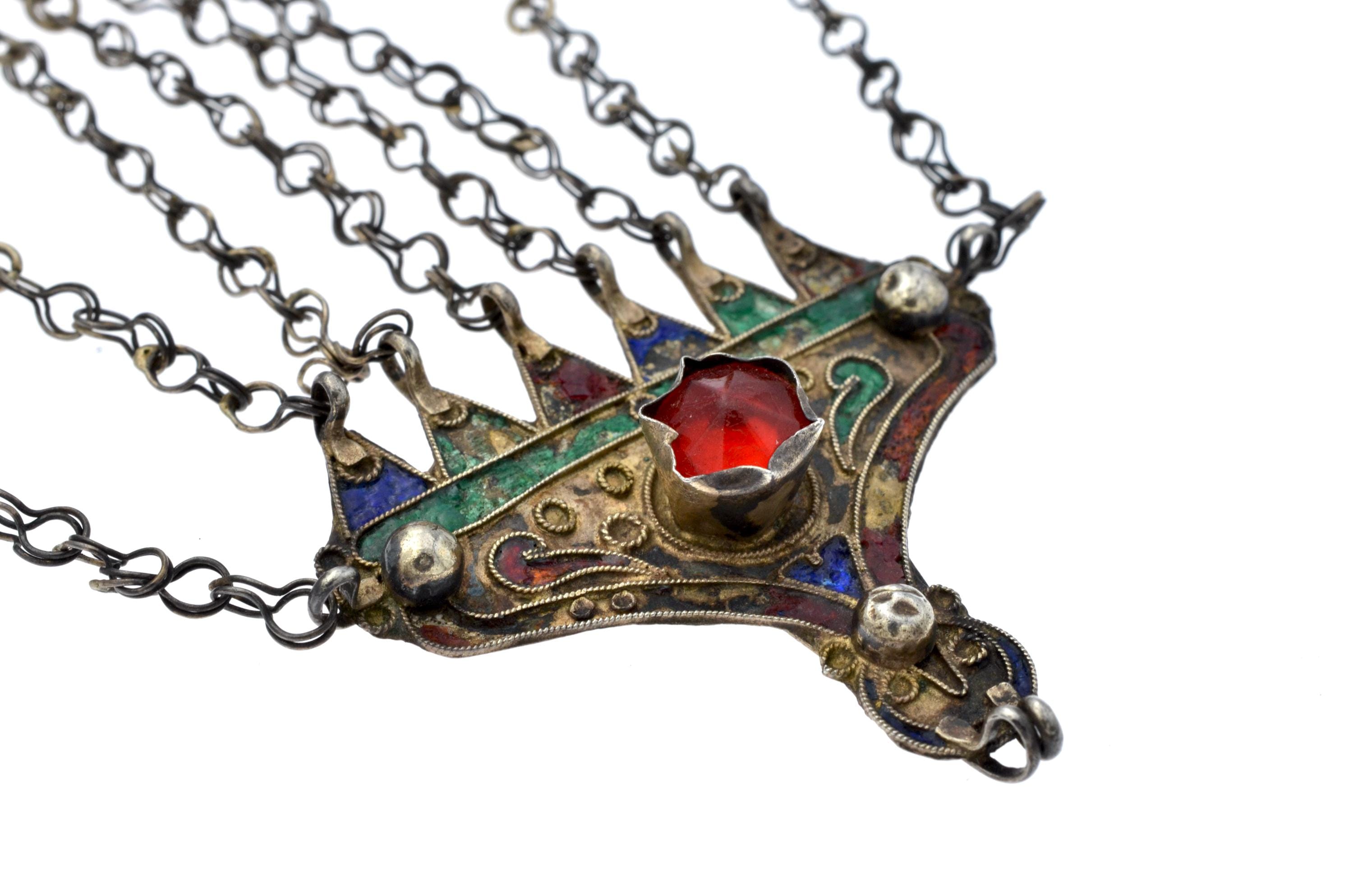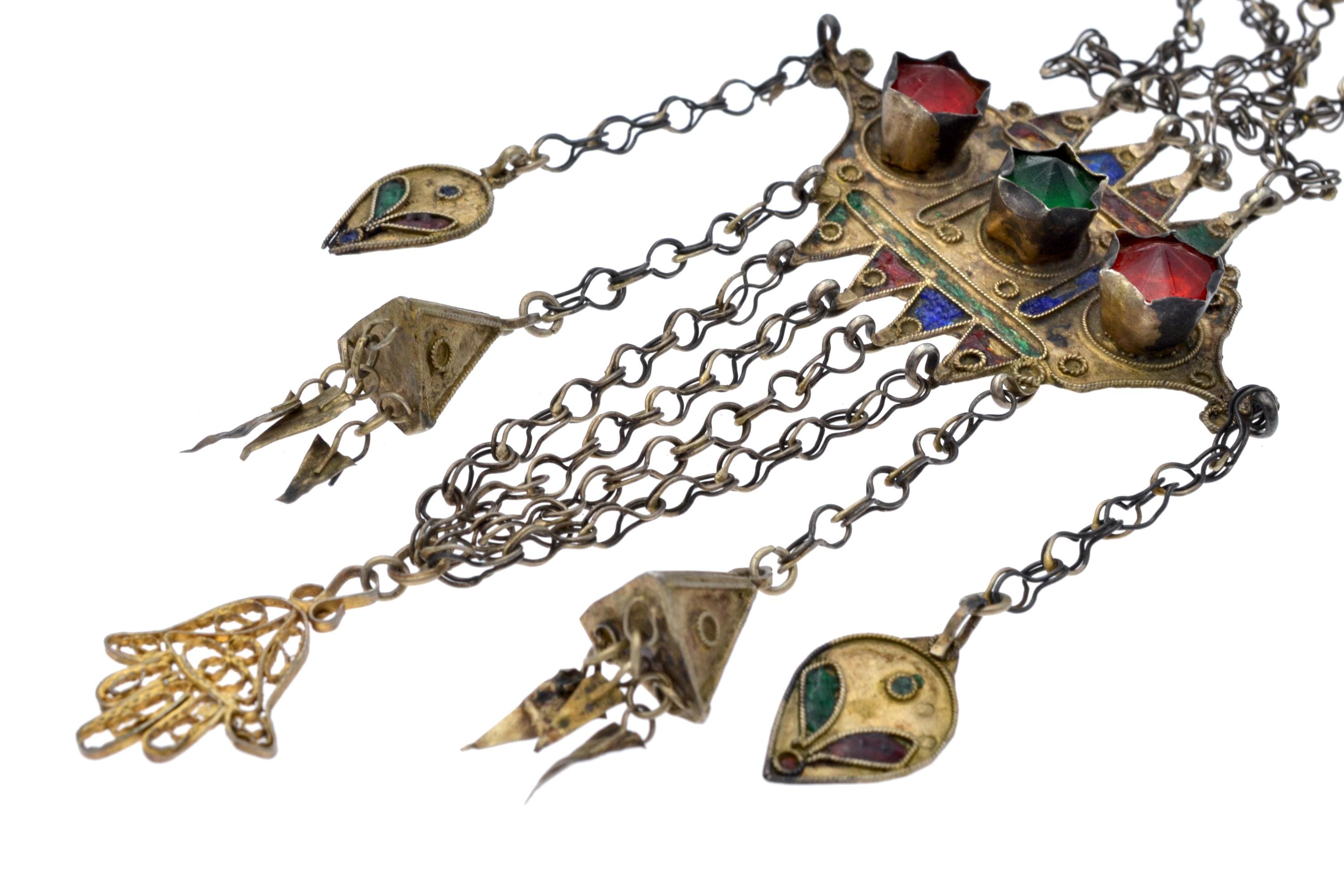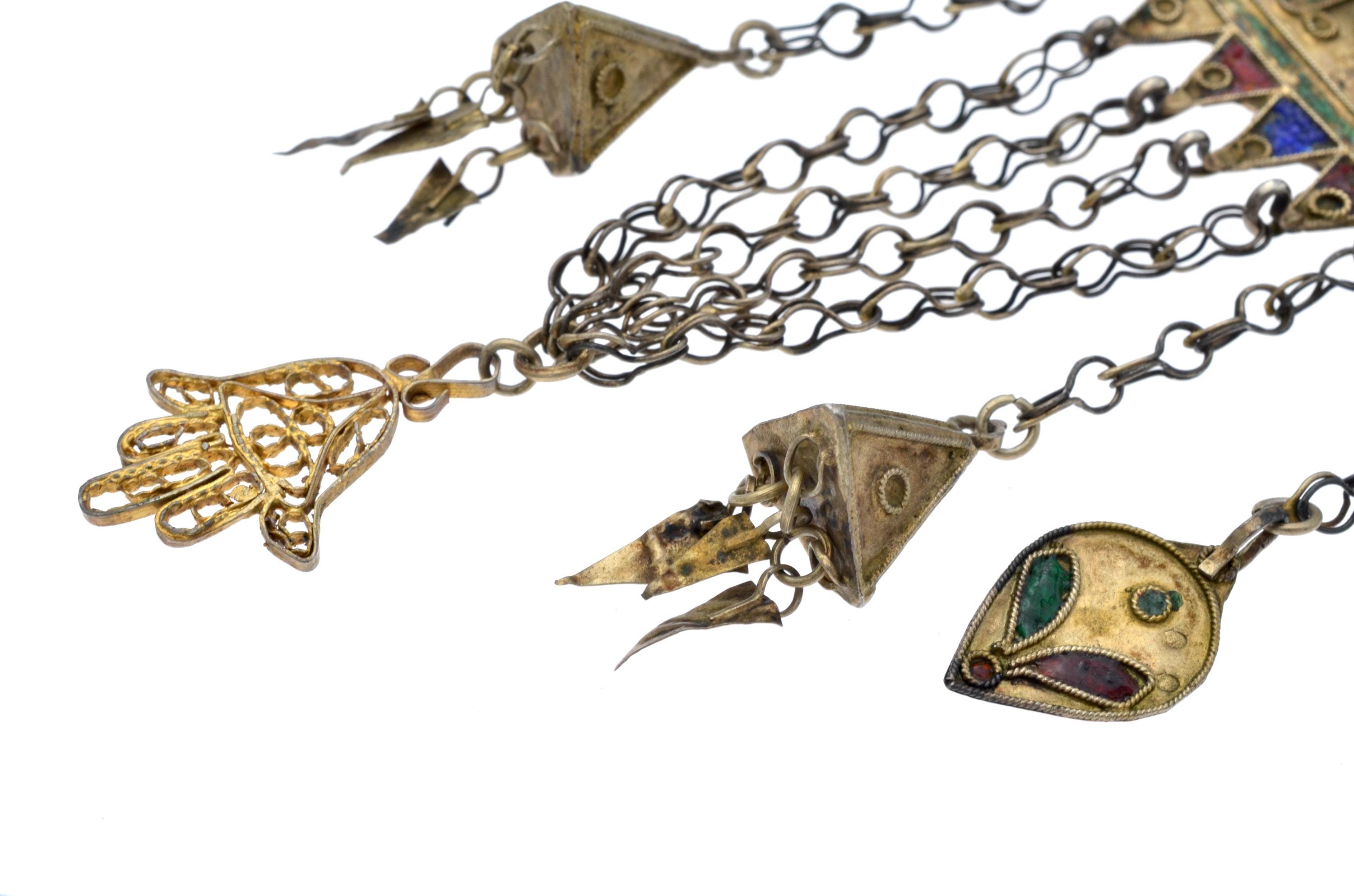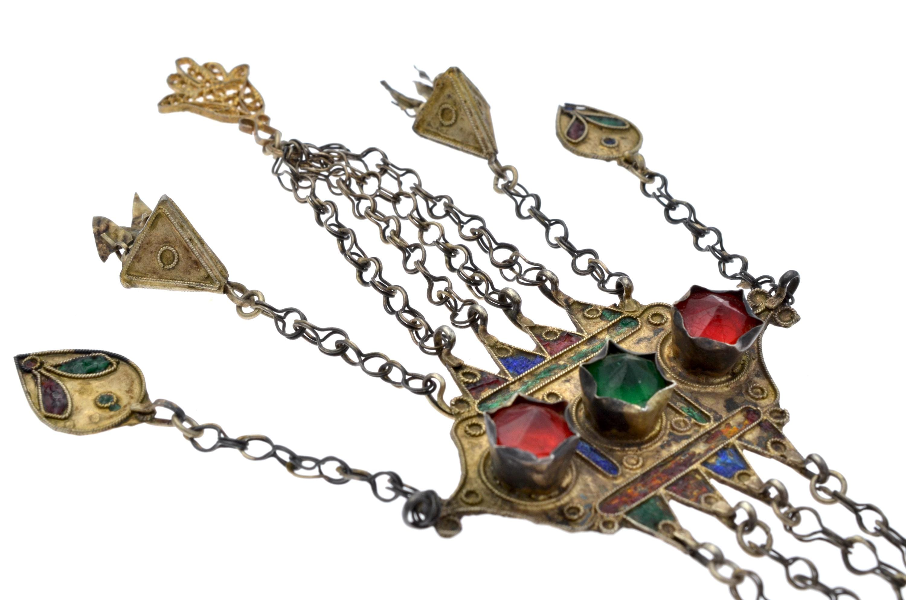 Female temporal ornament of the MNAJECH WESH type, coastal Tunisia, attributable to Mahdia or Djerba, first half of the 20th century. Partially gilded silver with polychrome enamel decoration and raised bezel-set glass cabochons. Constructed in superimposed registers connected by multiple chain strands with conical pendants. Openwork KHAMSA terminal. Ornament fixed to the veil and worn singly on the left temple.
