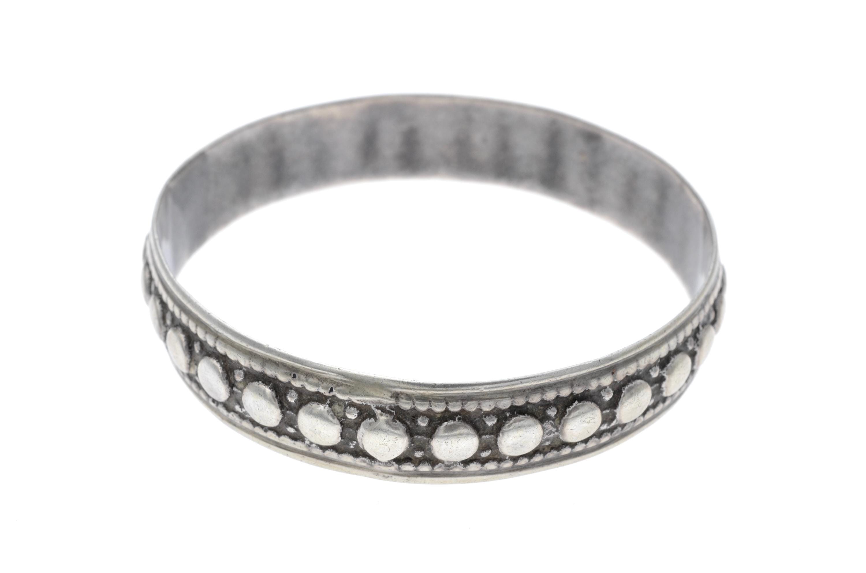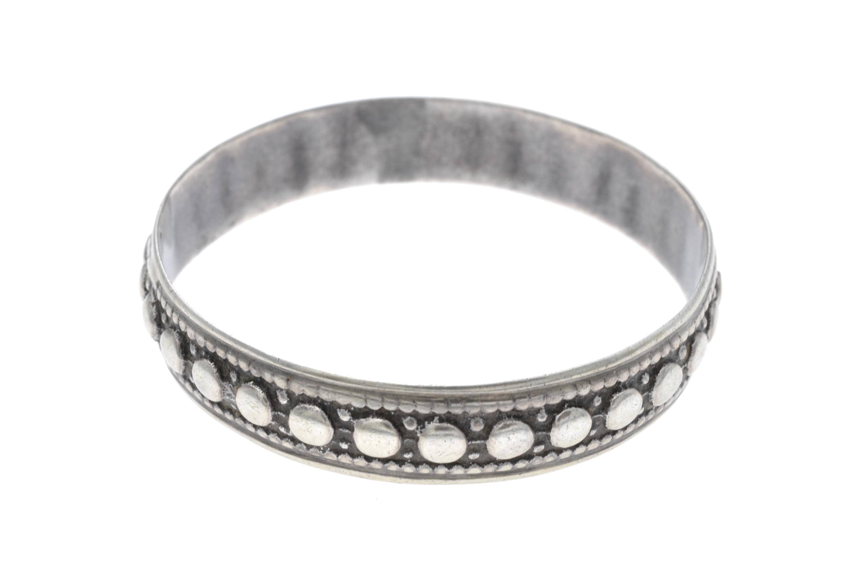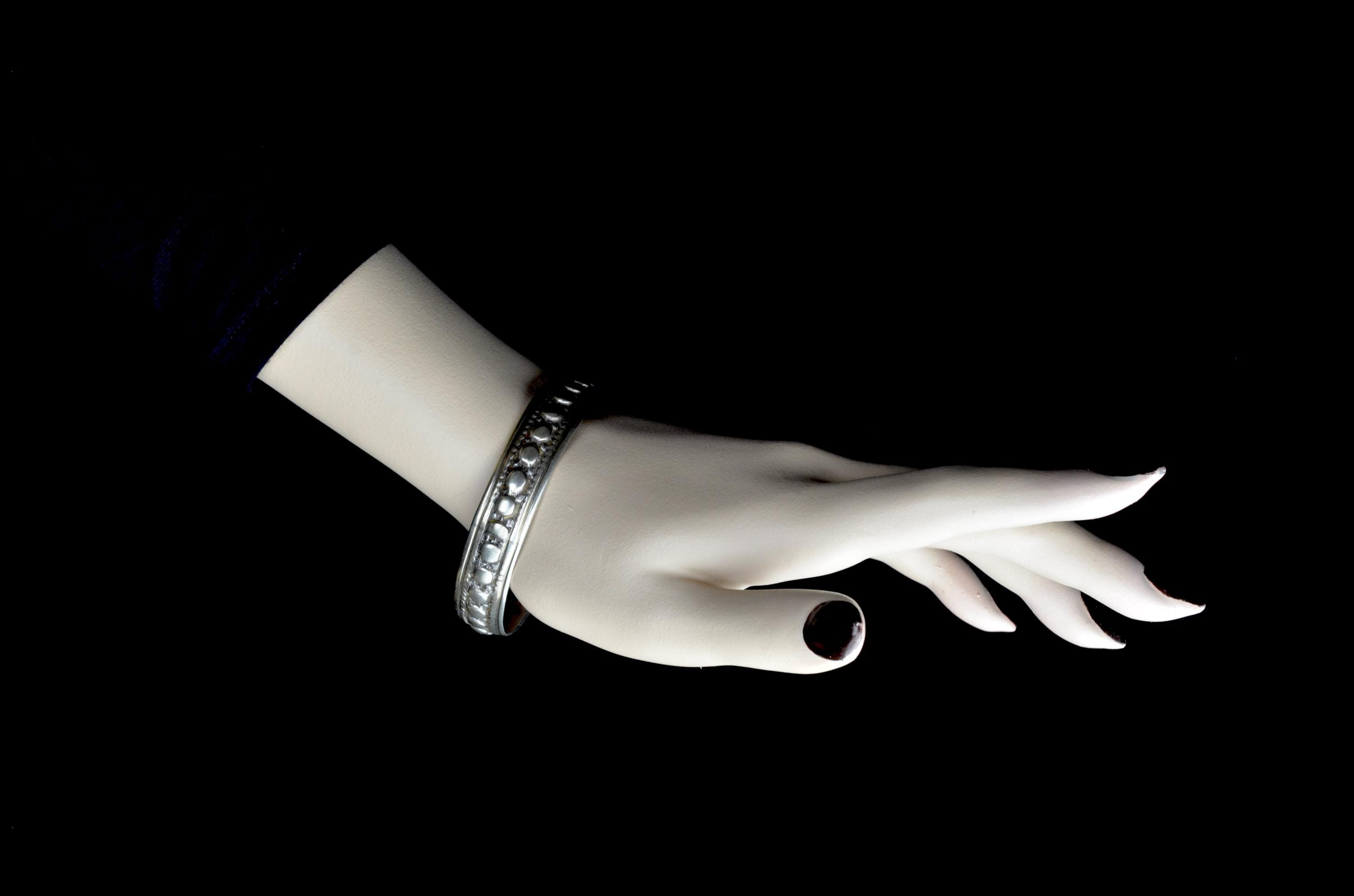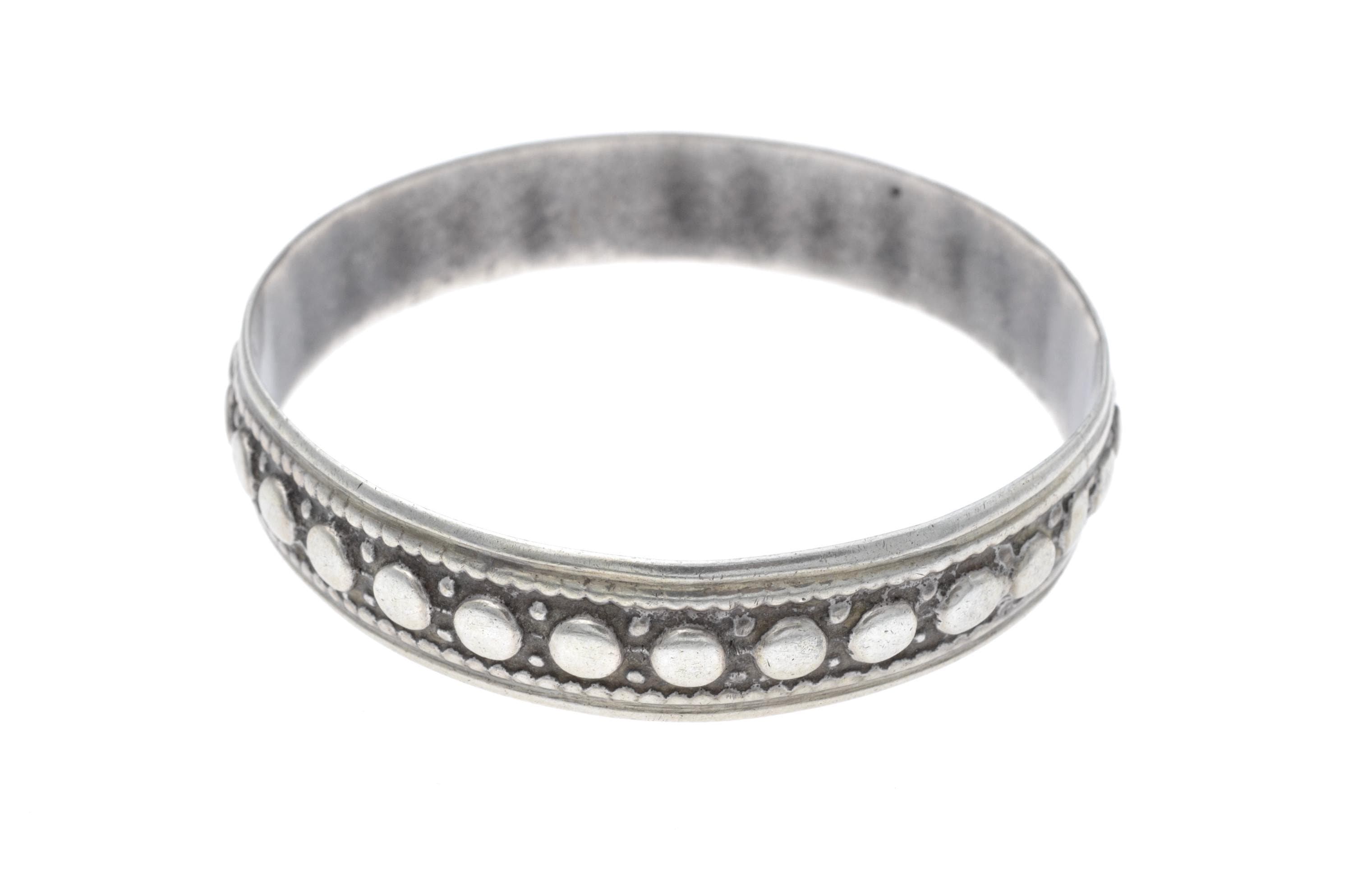 Rigid Mauritanian bracelet crafted in solid silver, featuring two parallel bands adorned with raised beaded patterns and interlaced geometric engravings. The production technique includes manual hammering and chiseling, characteristic of Mauritanian silversmithing traditions. This type of bracelet is commonly worn by women and reflects Saharan influences, particularly in its choice of patterns and materials.