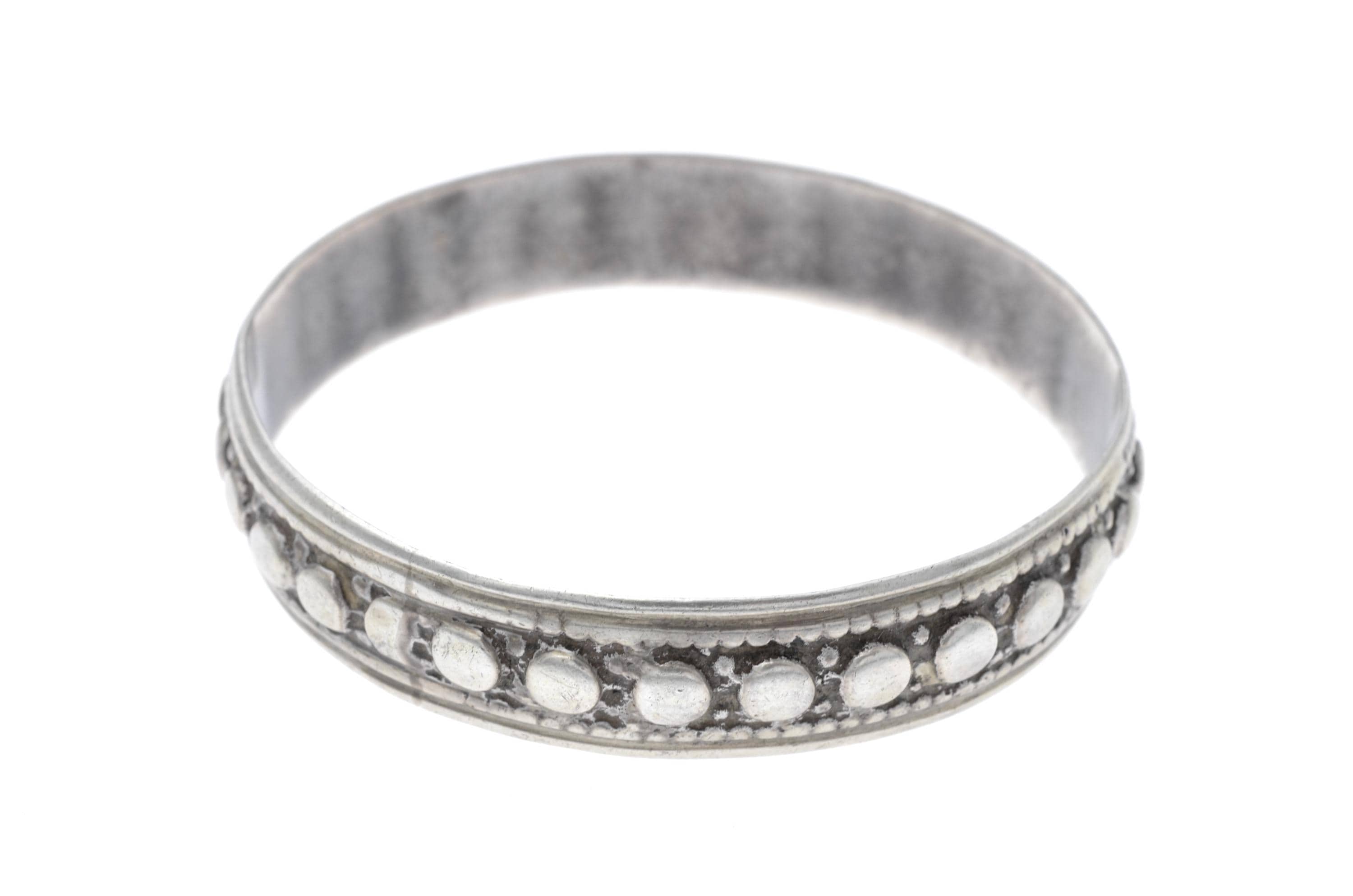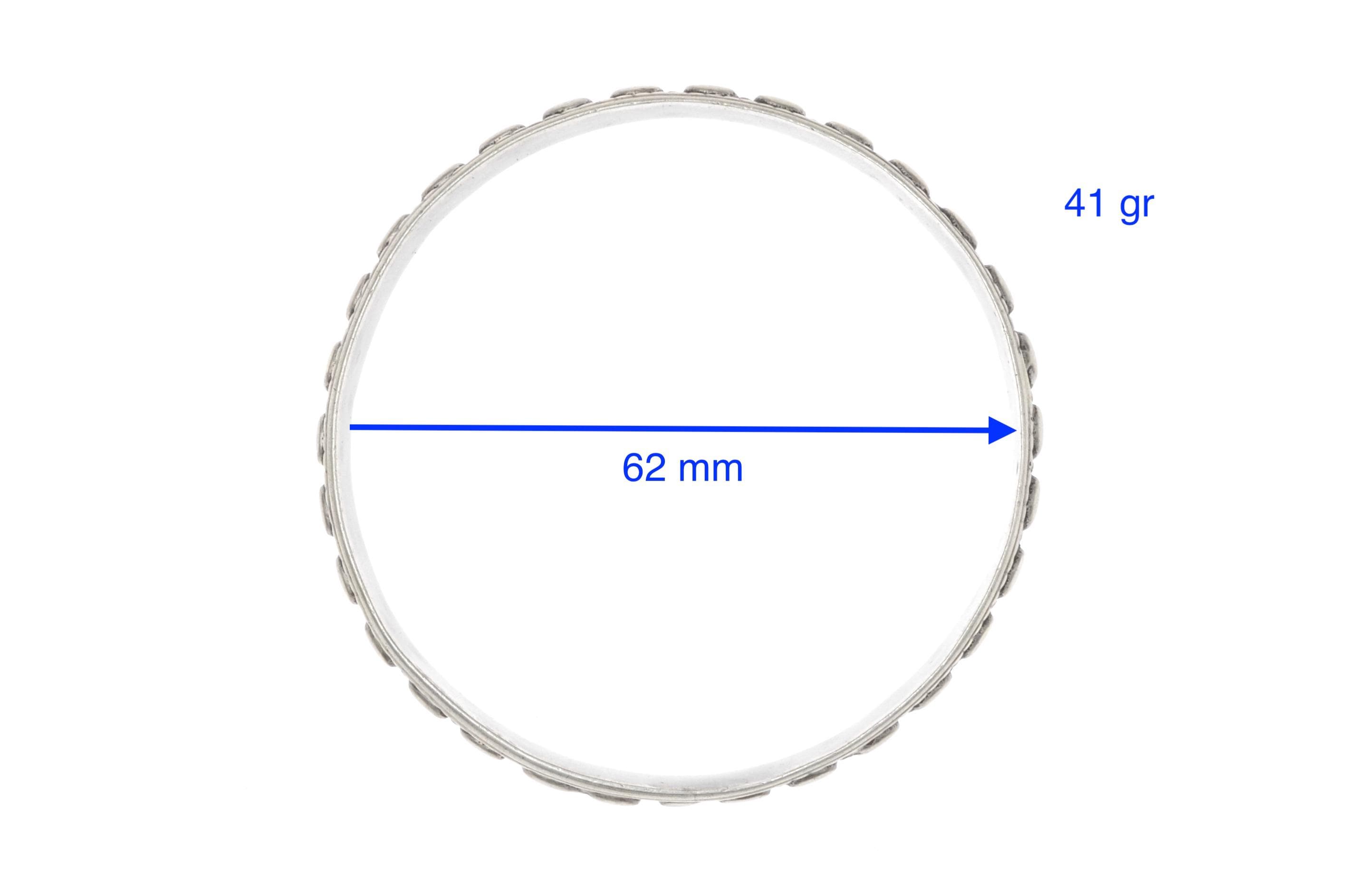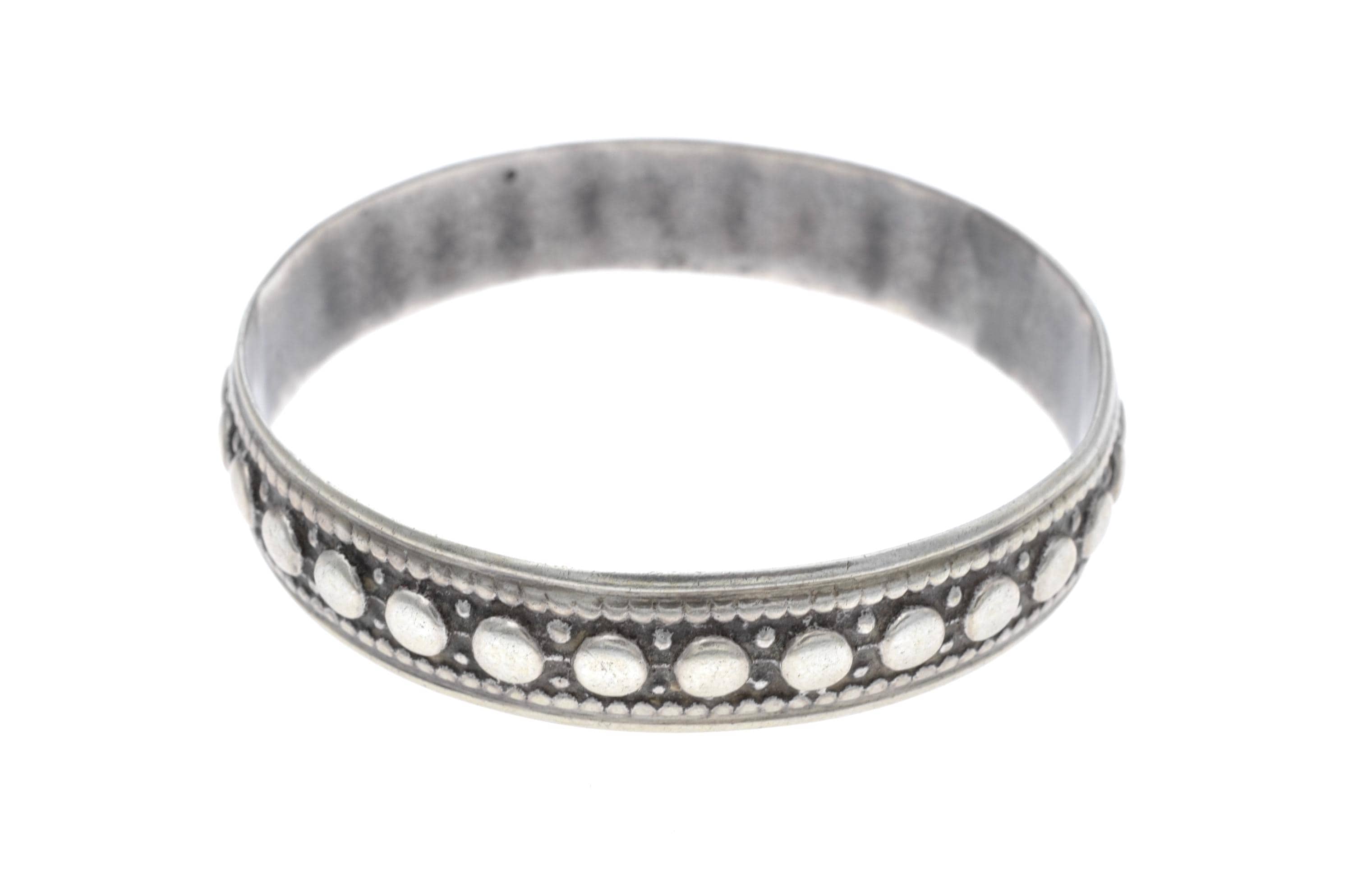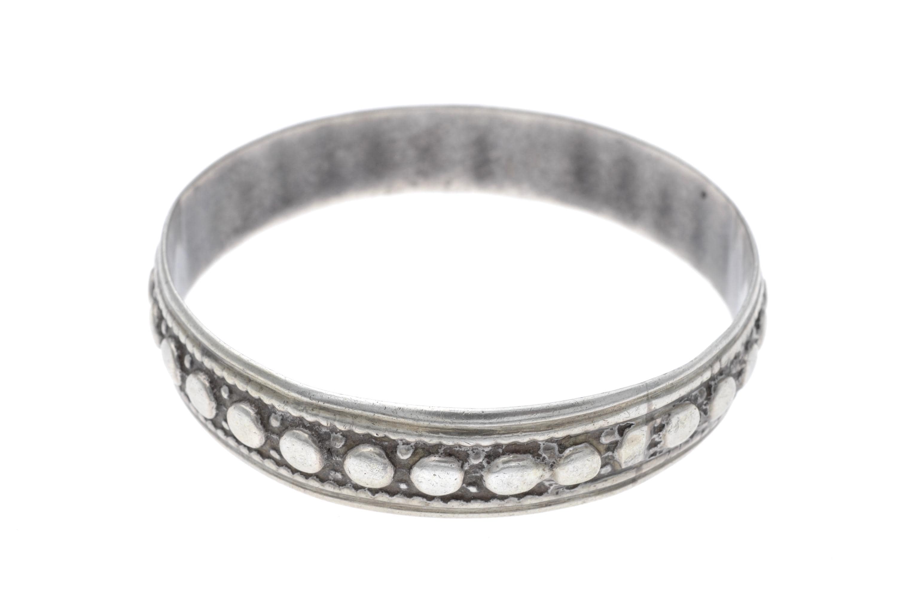 Rigid Mauritanian bracelet crafted in solid silver, featuring two parallel bands adorned with raised beaded patterns and interlaced geometric engravings. The production technique includes manual hammering and chiseling, characteristic of Mauritanian silversmithing traditions. This type of bracelet is commonly worn by women and reflects Saharan influences, particularly in its choice of patterns and materials.
