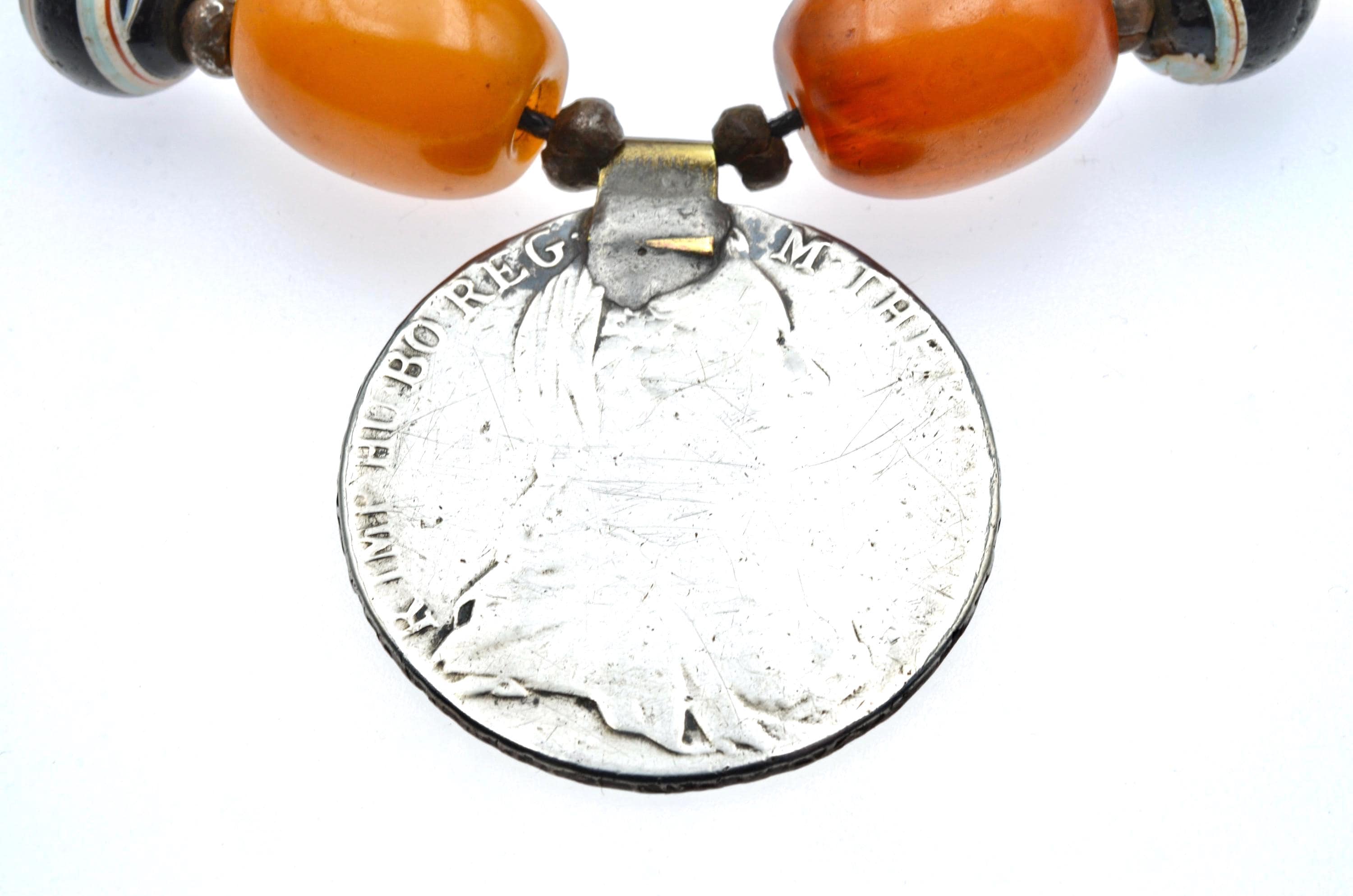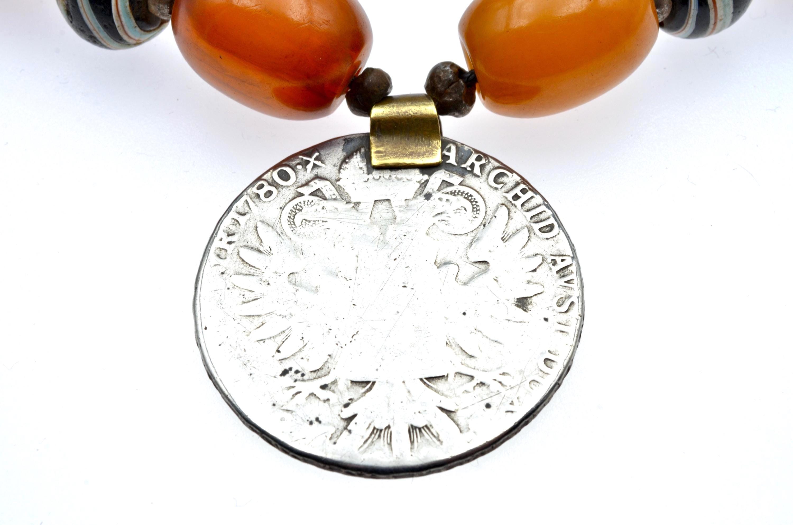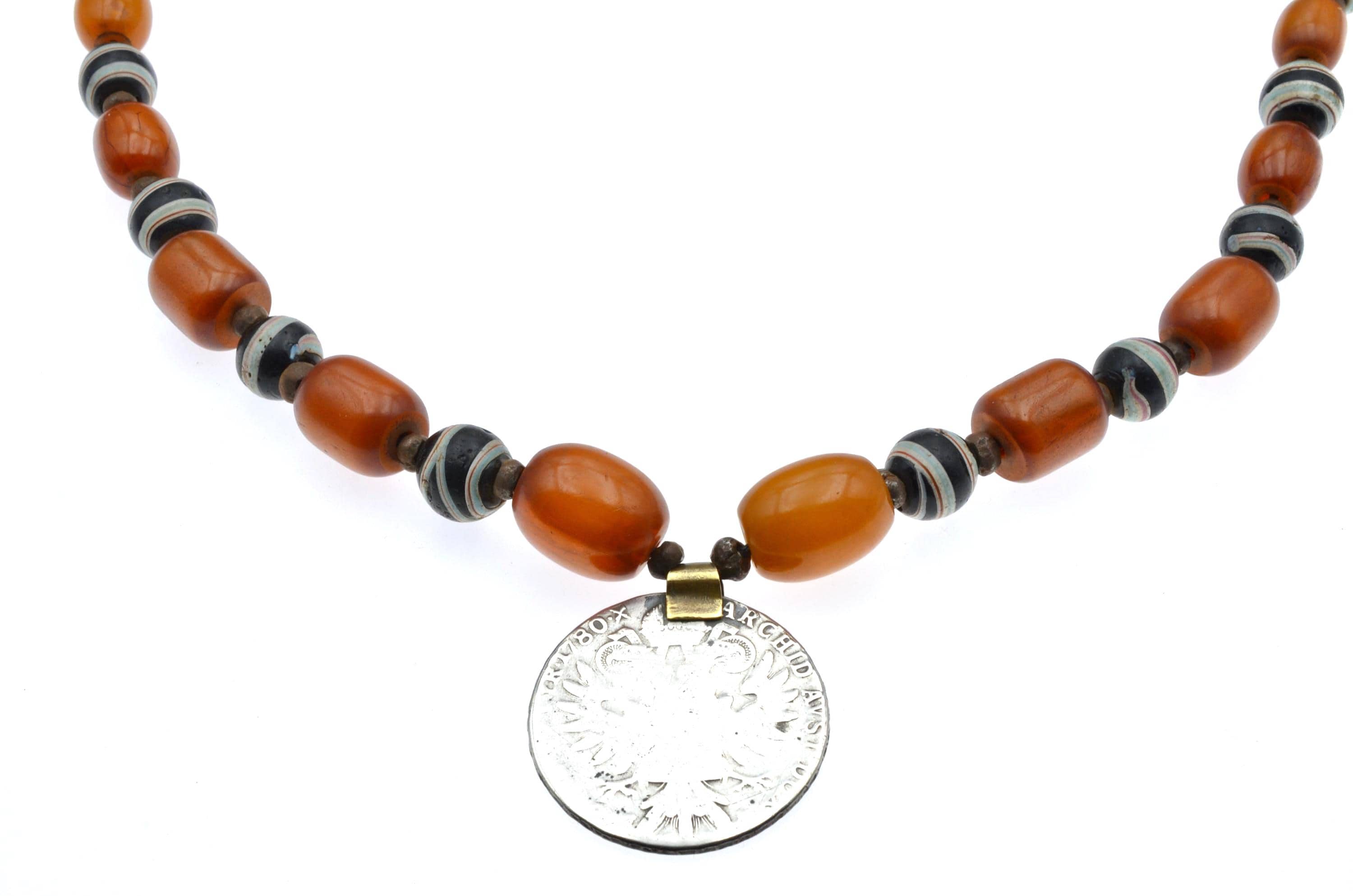 Ethiopian necklace composed of an Austrian Maria Theresa thaler, bakelite beads, and Venetian trade beads.