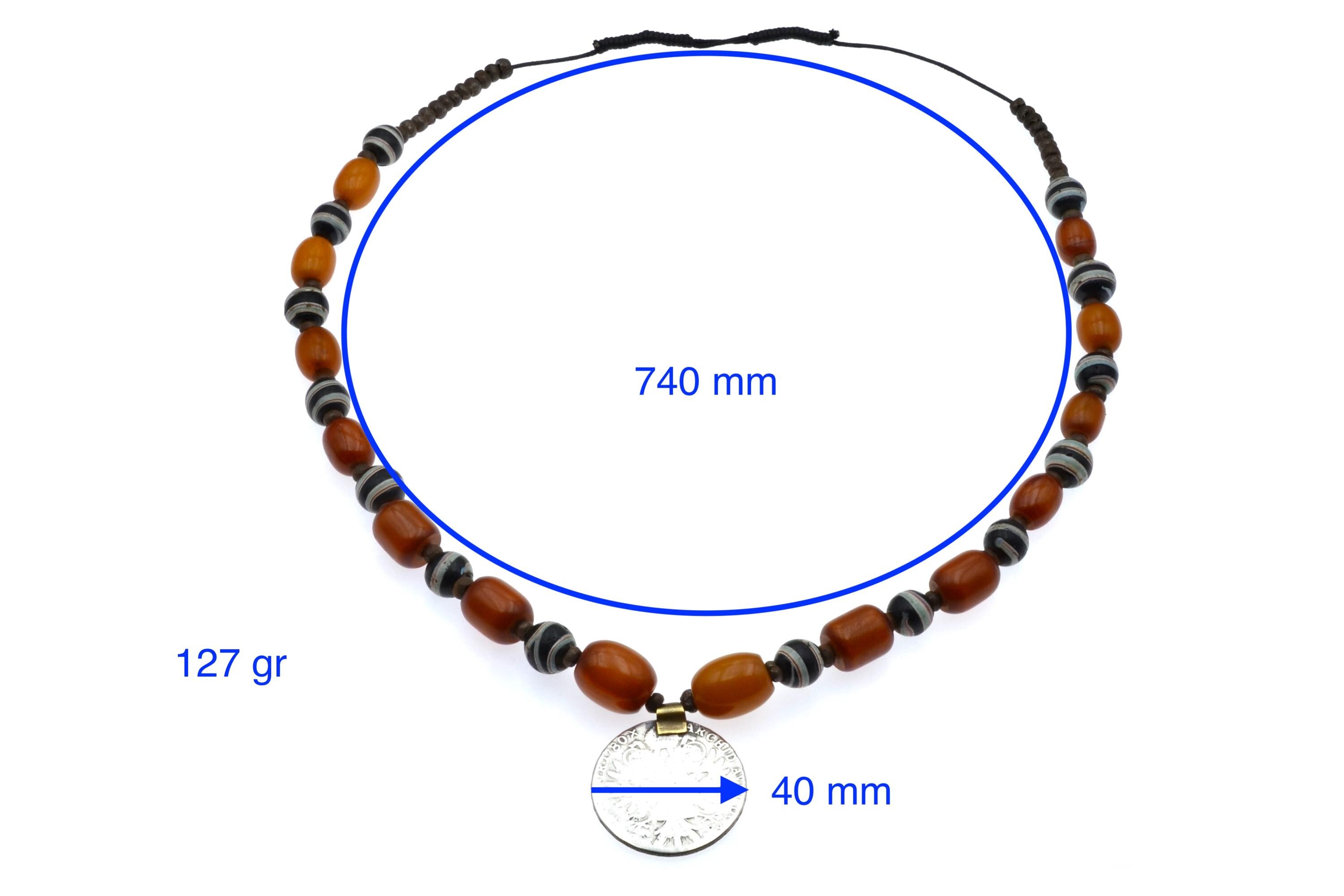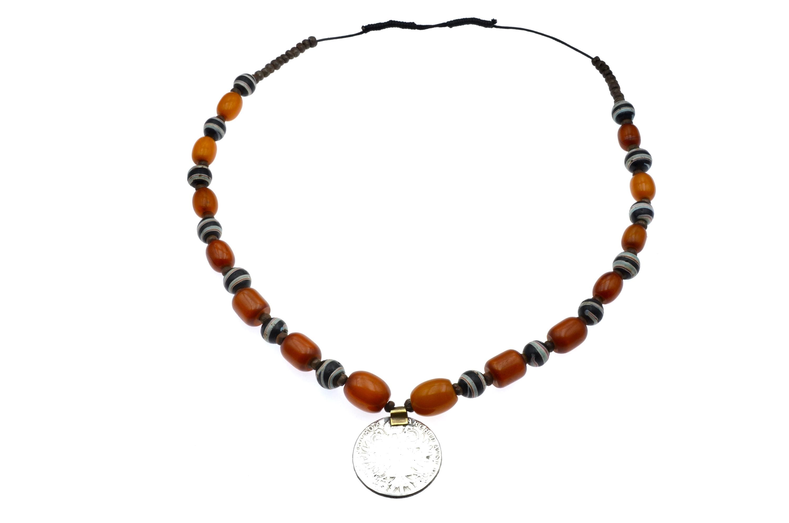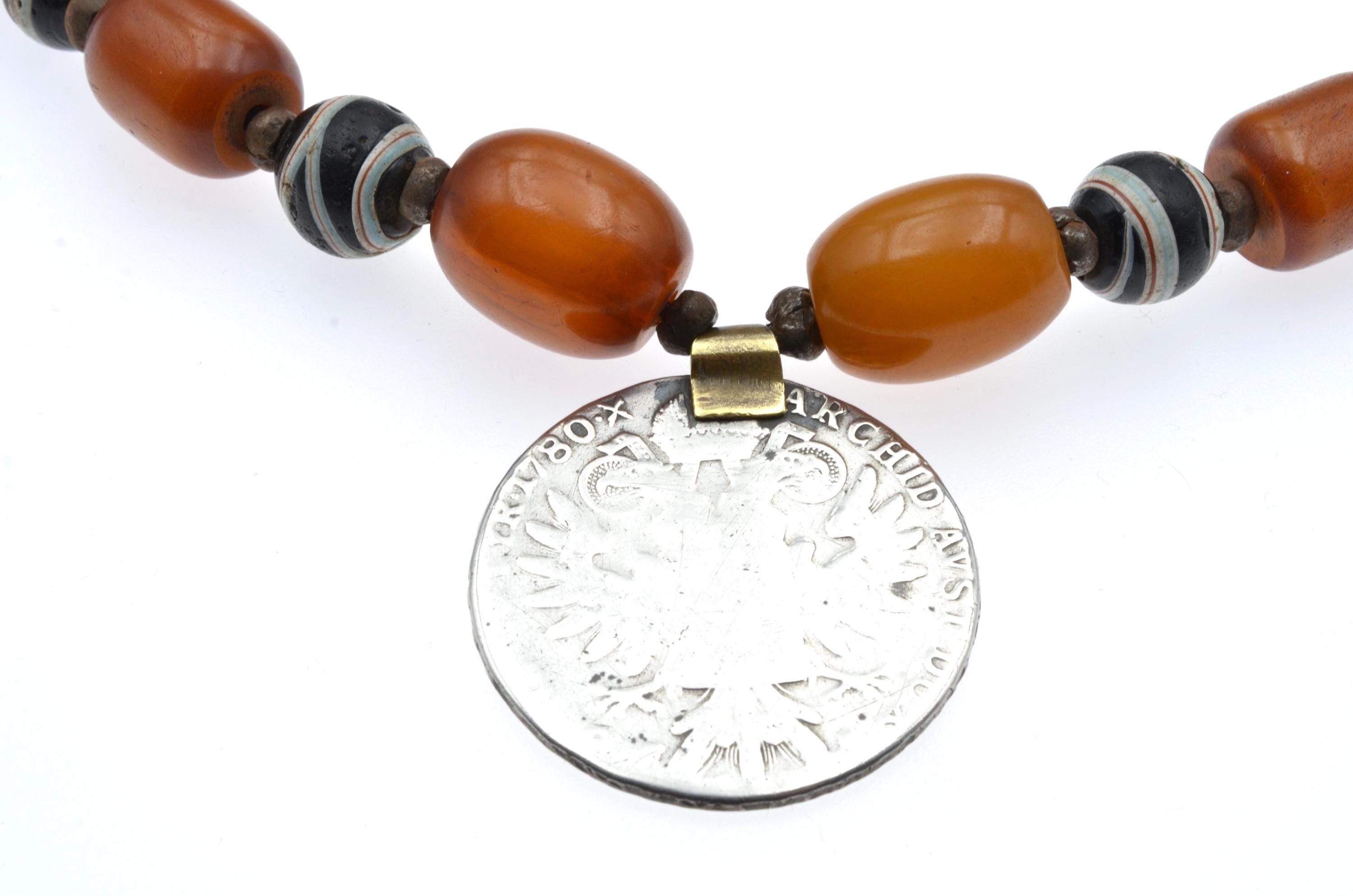 Ethiopian necklace composed of an Austrian Maria Theresa thaler, bakelite beads, and Venetian trade beads.