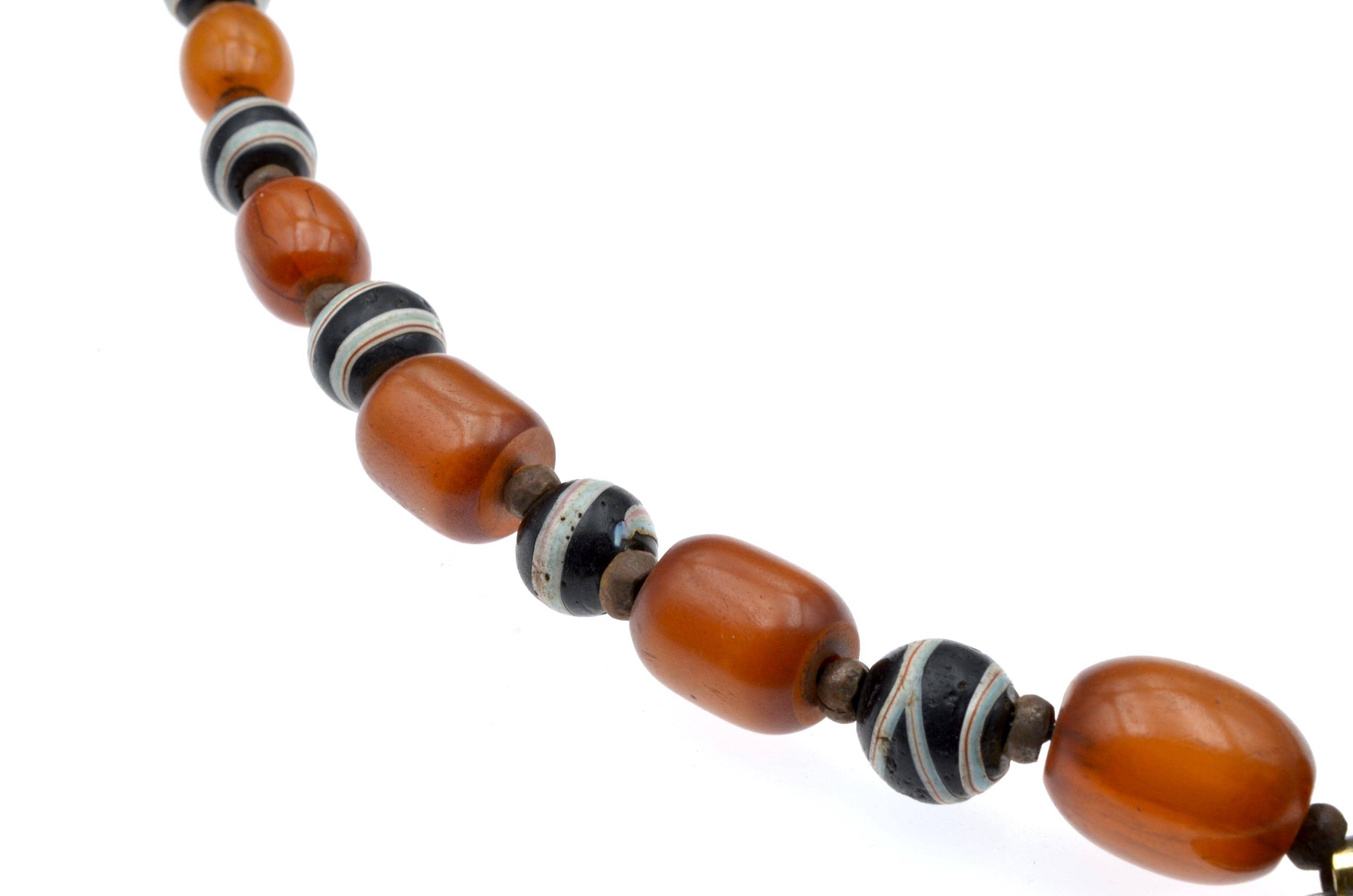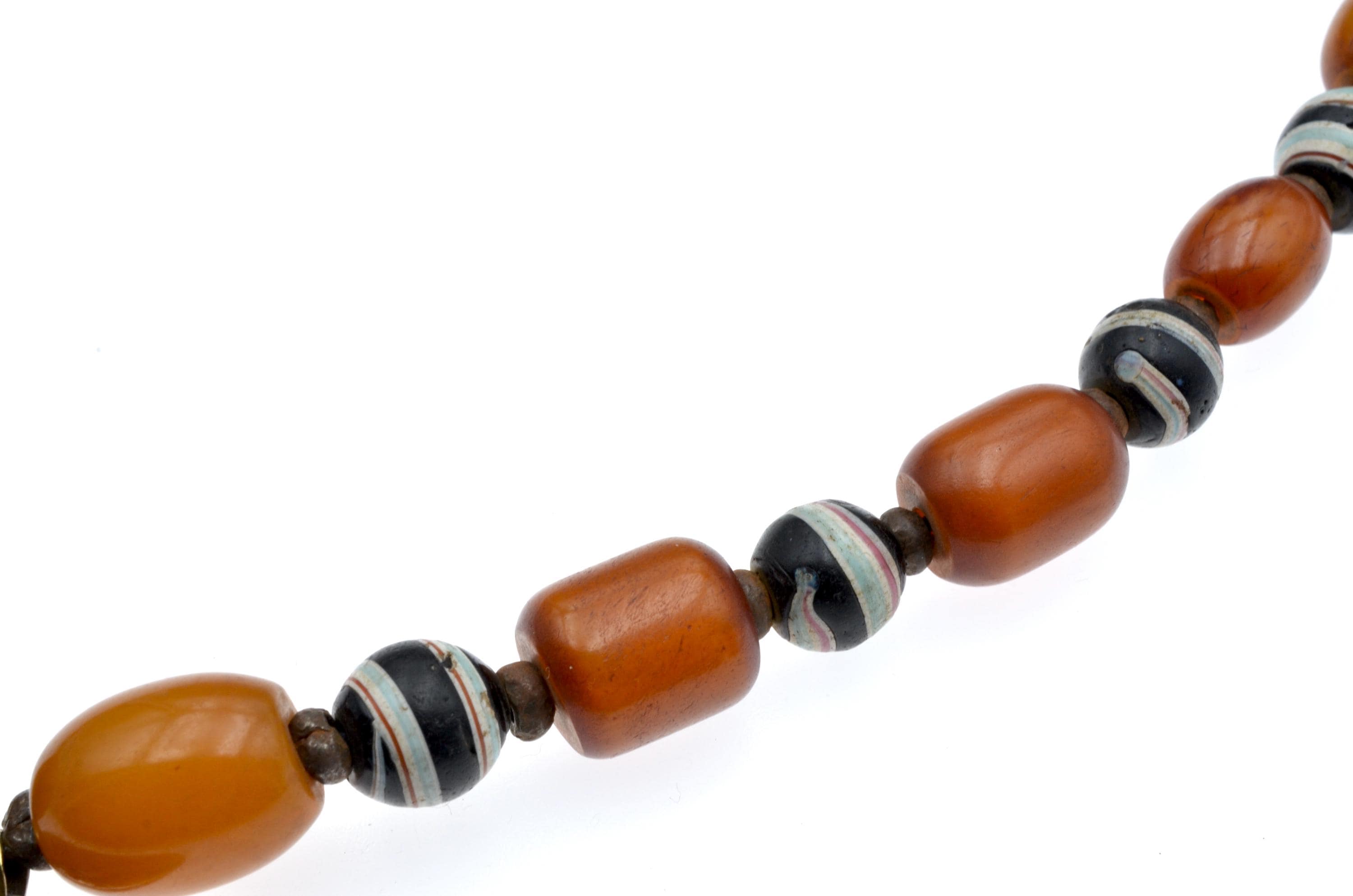 The strand alternates oval amber-toned early bakelite beads with striped spherical Venetian trade beads originating from Mediterranean commercial production. Surface wear is consistent with prolonged use.