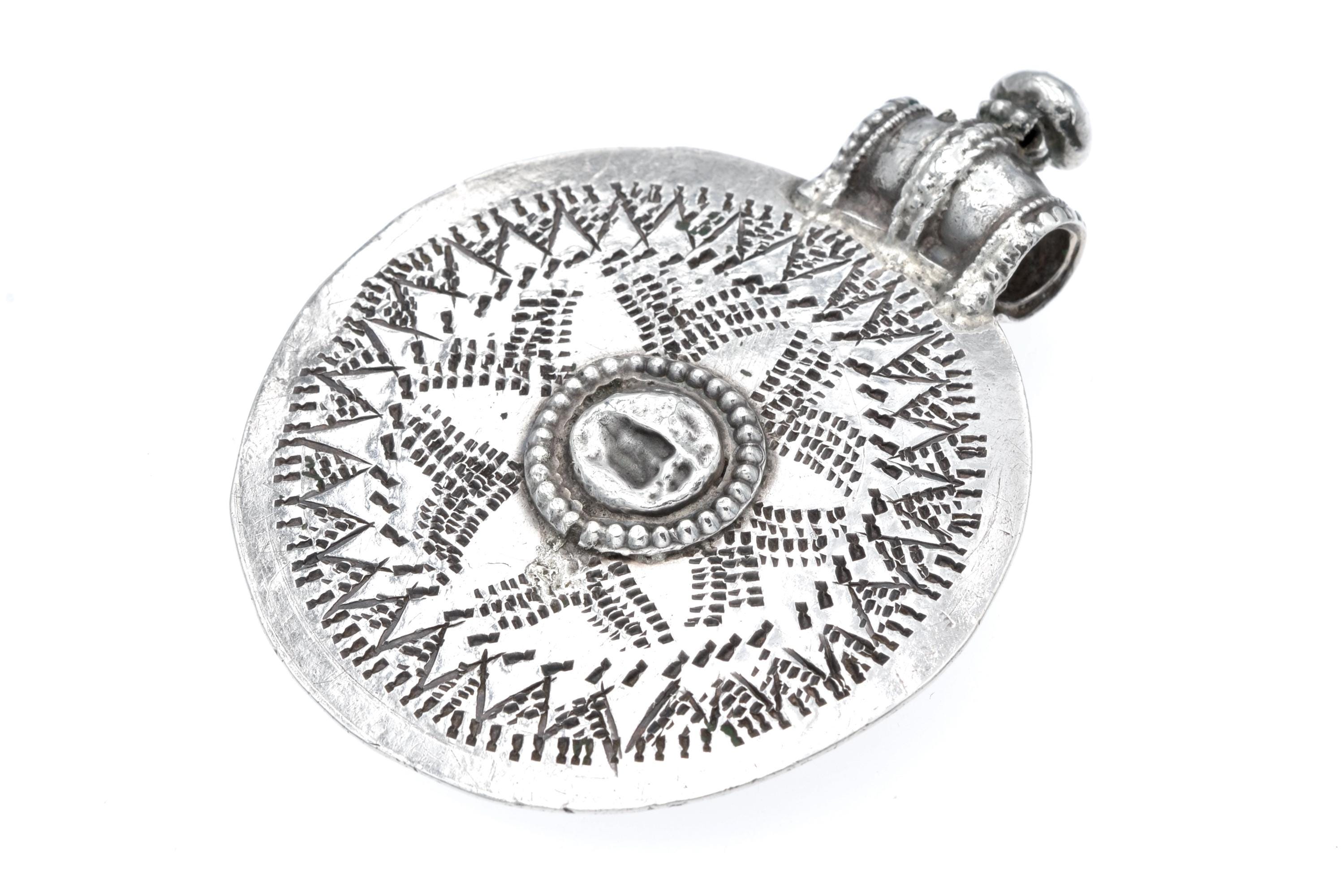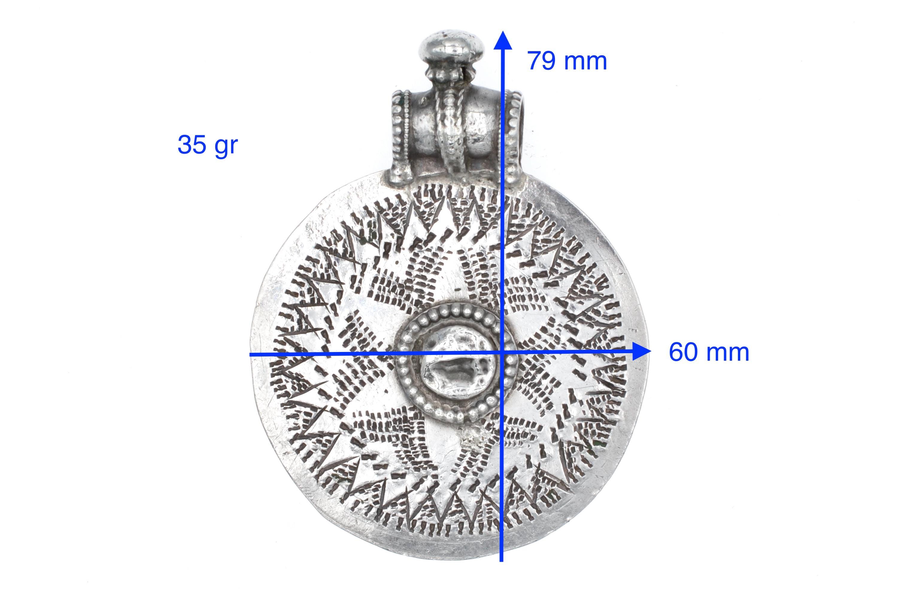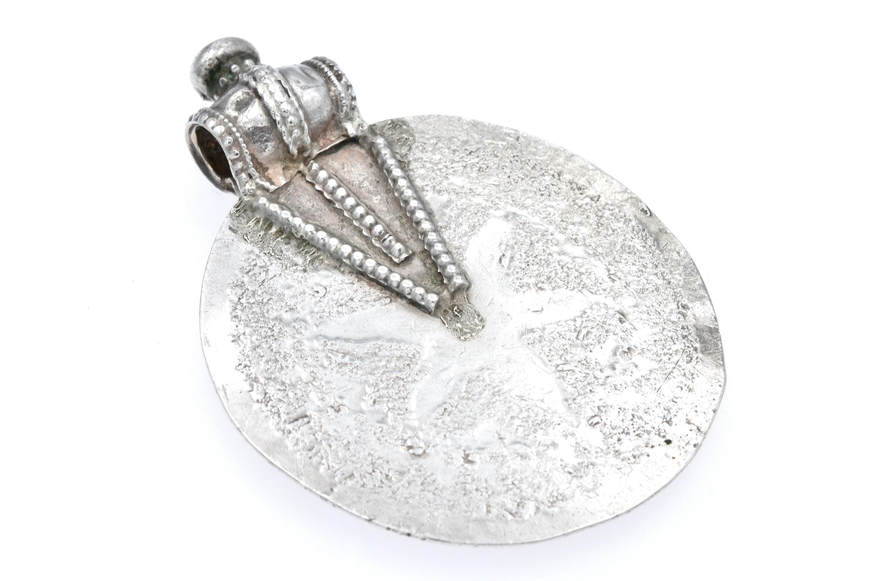 Antique traditional Omani pendant, "Samt Mukahhal," crafted in fine silver. The structure is further adorned with geometric patterns, stamped details, crosshatch engravings, and delicate dotted designs, showcasing hallmark Omani craftsmanship. A tubular, bead-decorated bail is affixed at the top, allowing it to be suspended on a chain.