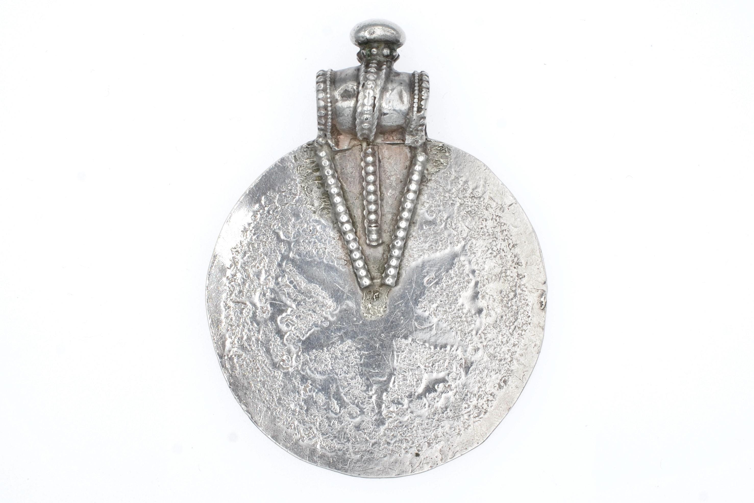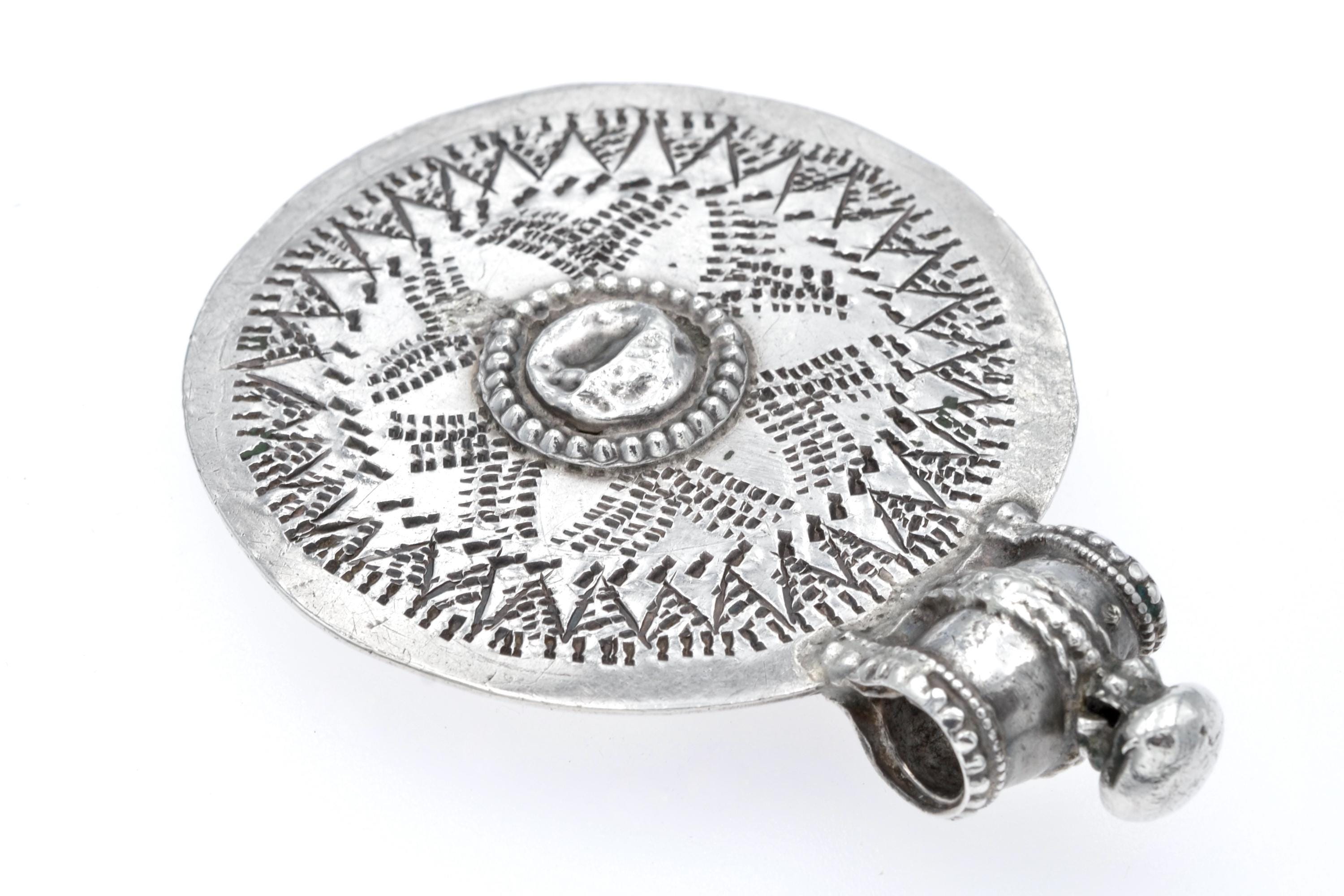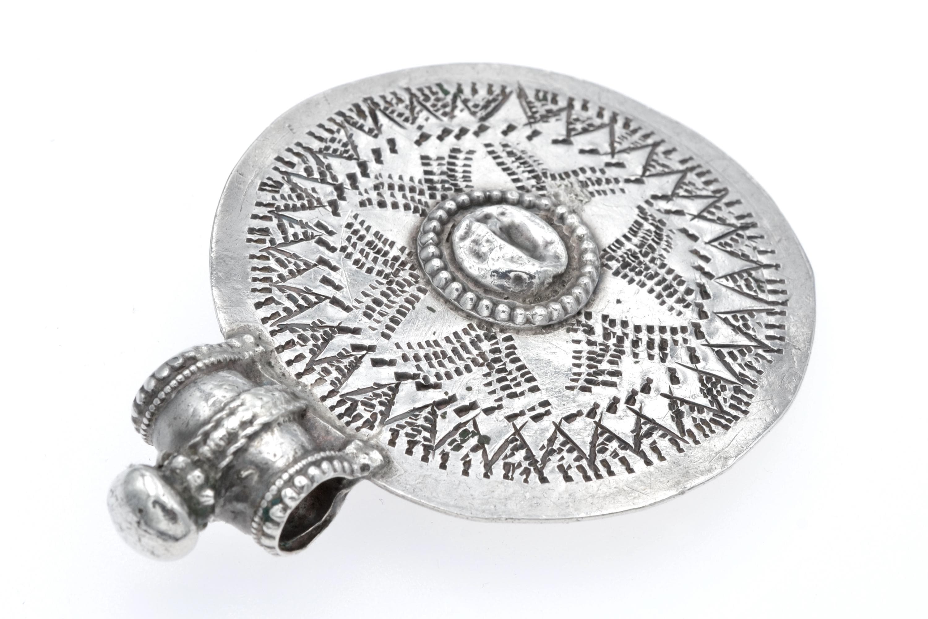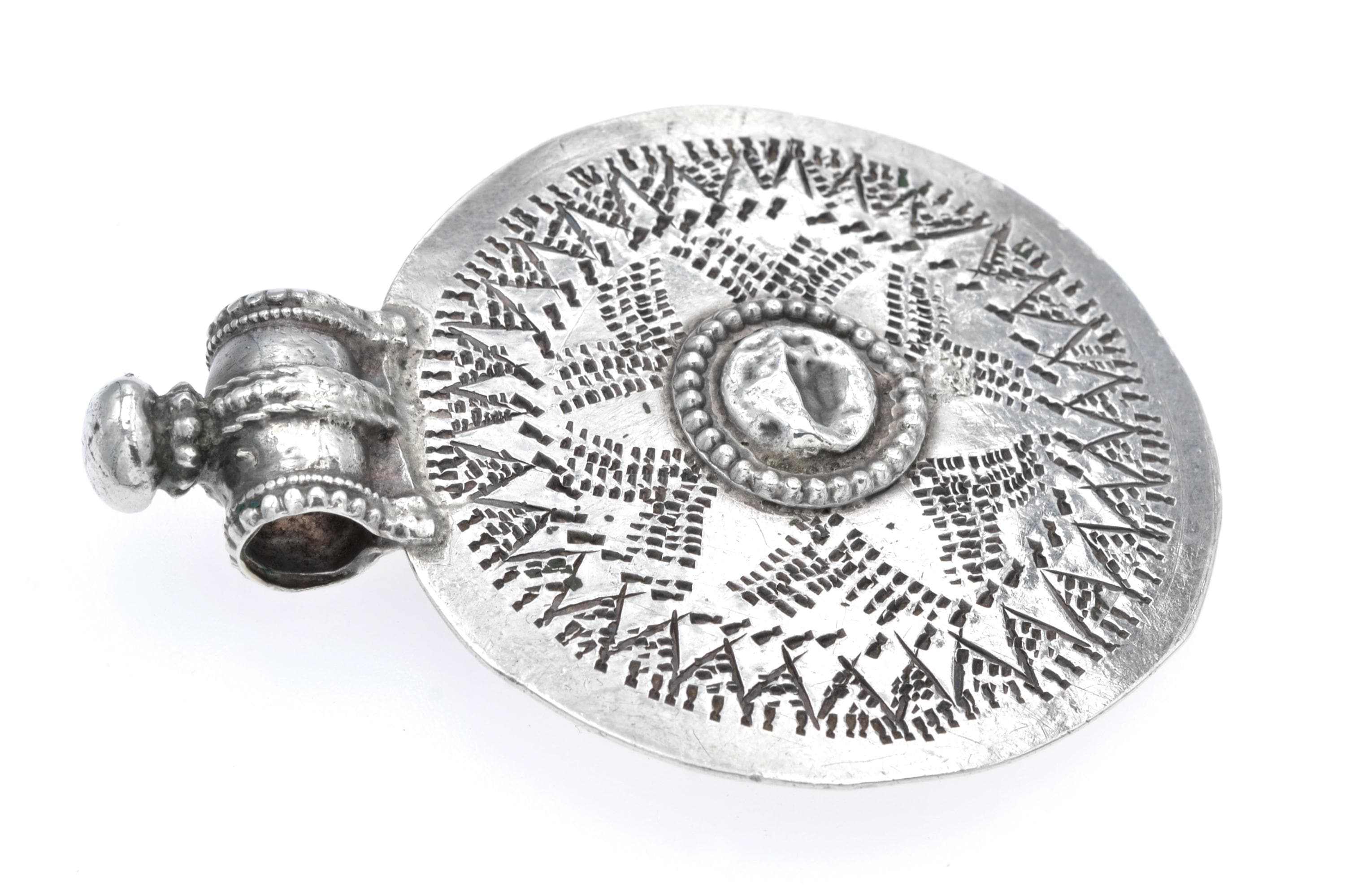 Antique traditional Omani pendant, "Samt Mukahhal," crafted in fine silver. The structure is further adorned with geometric patterns, stamped details, crosshatch engravings, and delicate dotted designs, showcasing hallmark Omani craftsmanship. A tubular, bead-decorated bail is affixed at the top, allowing it to be suspended on a chain.