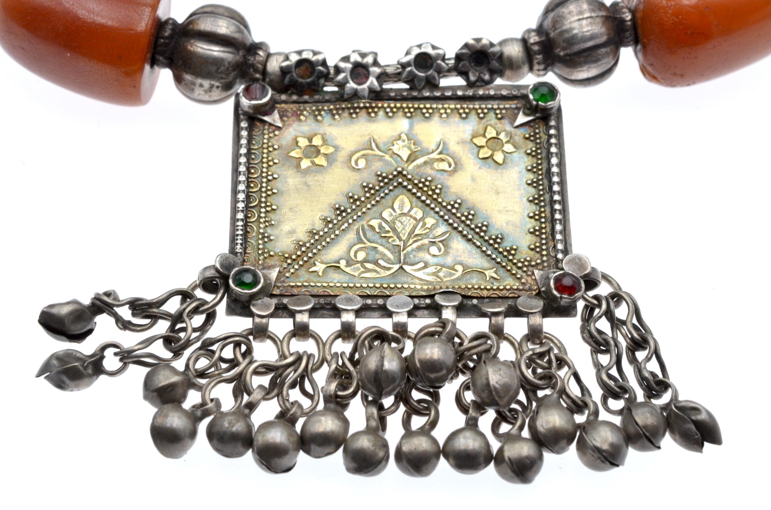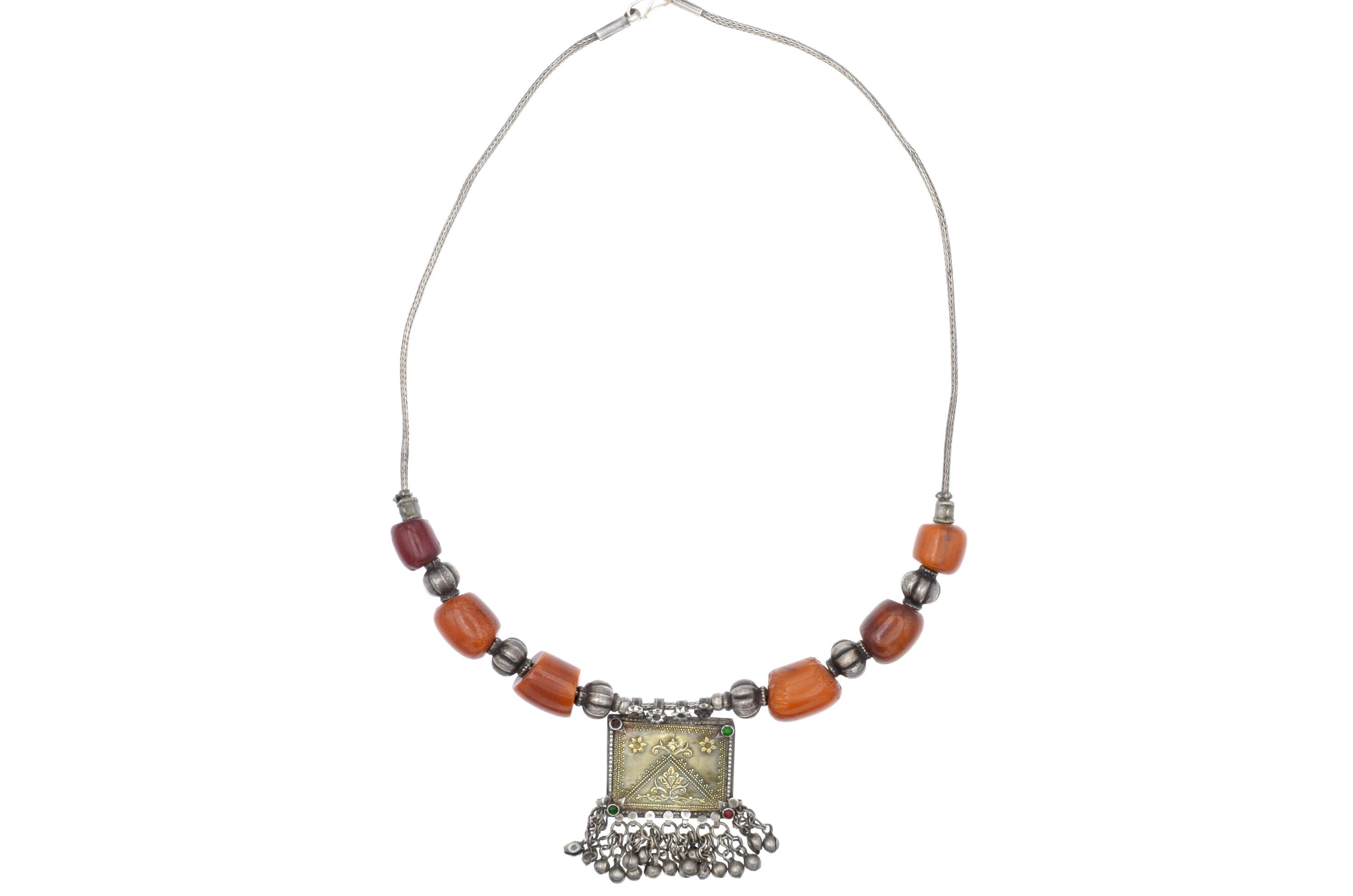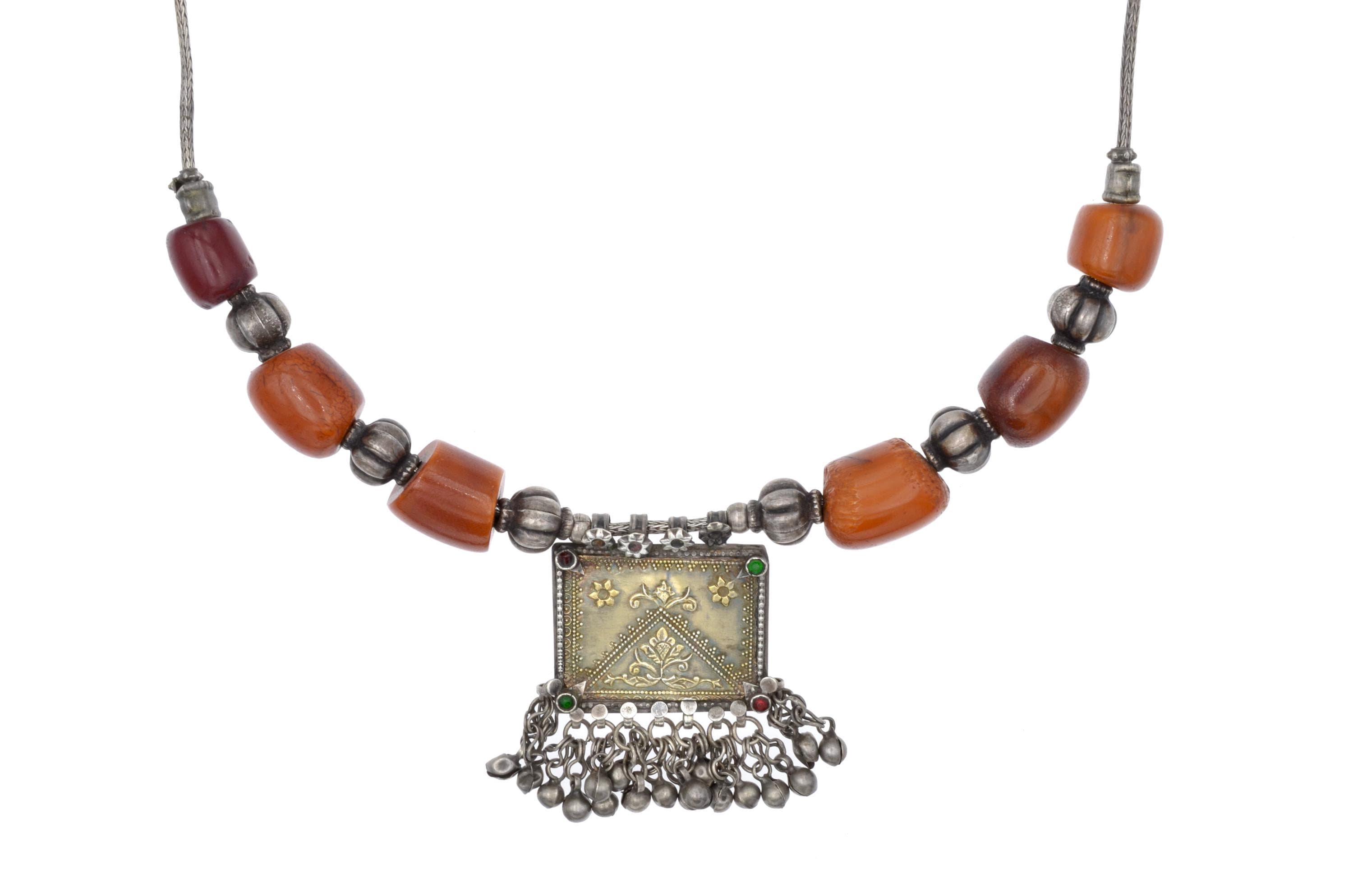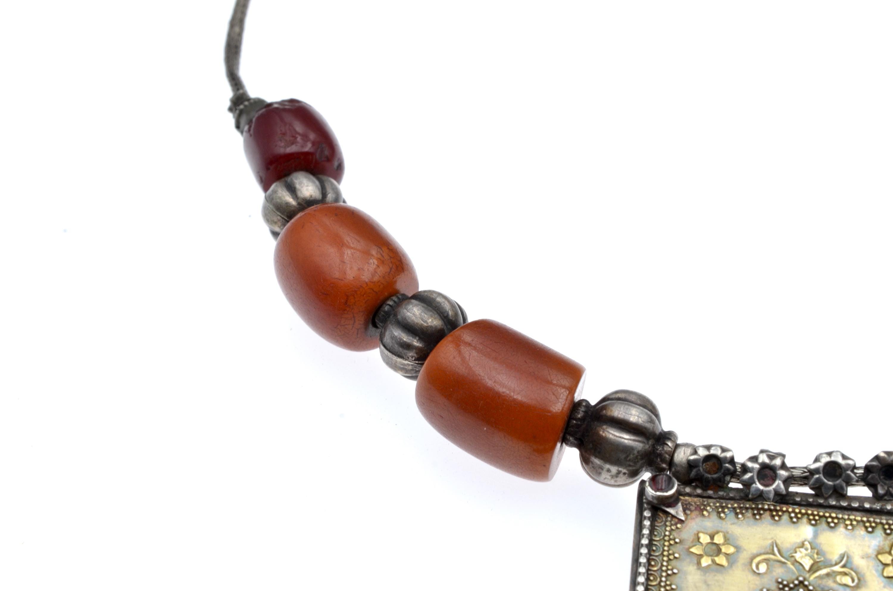 Antique tribal necklace centered by a rectangular silver pendant partially gilt, suspended from a twisted metal cord and complemented by orange bakelite beads.