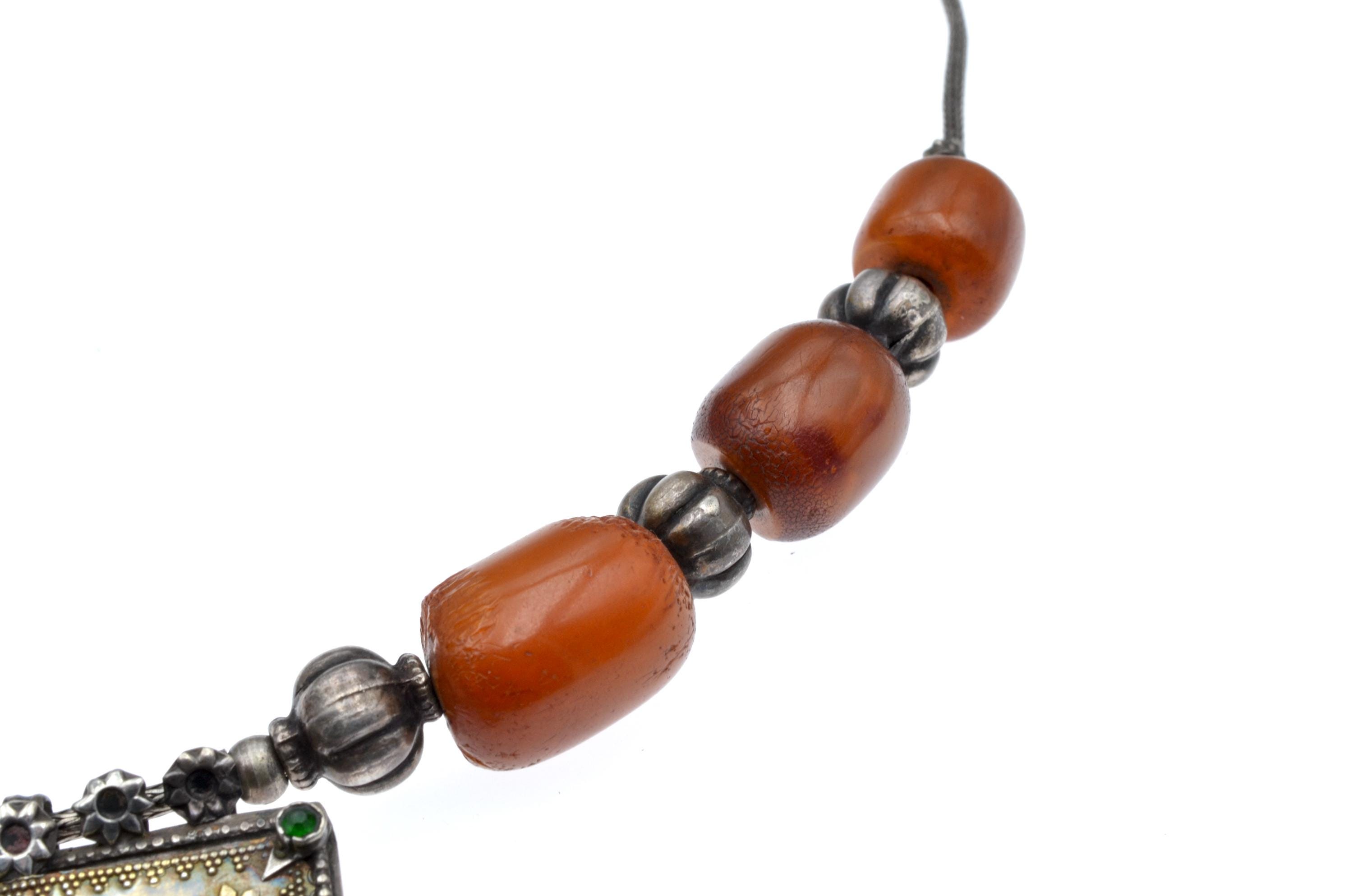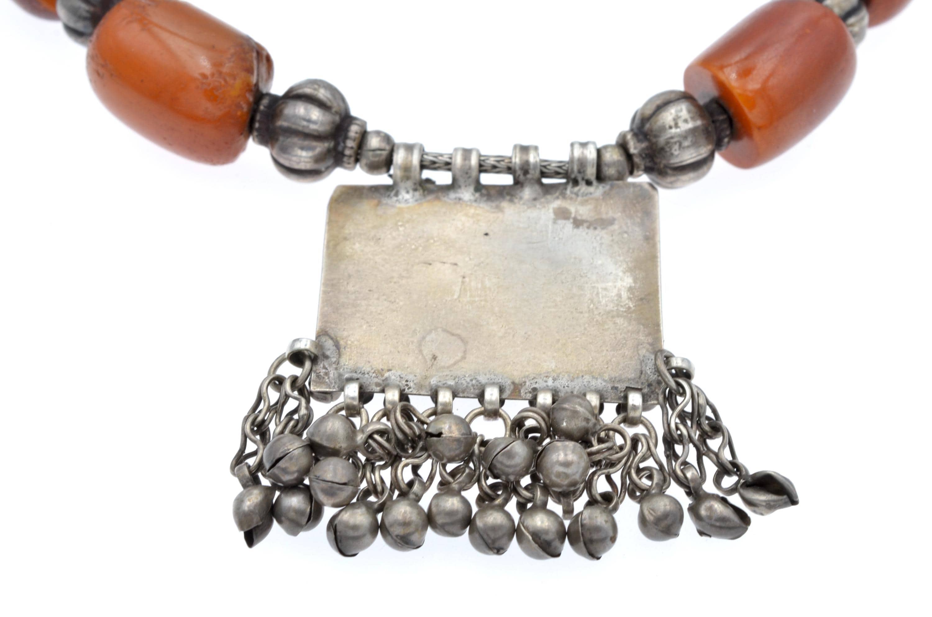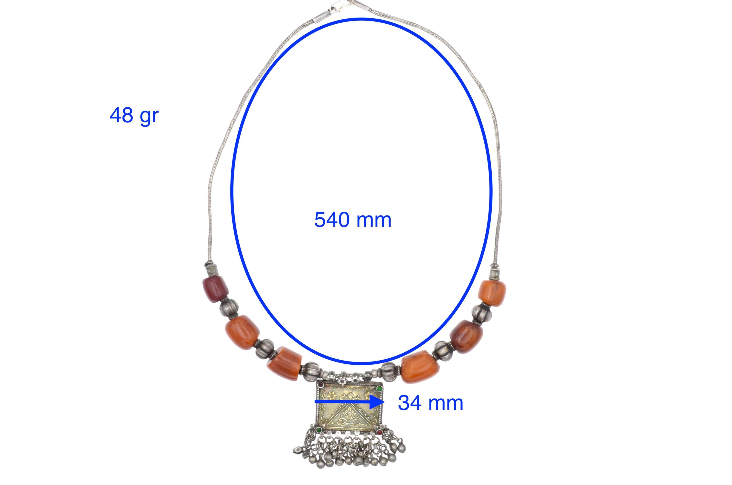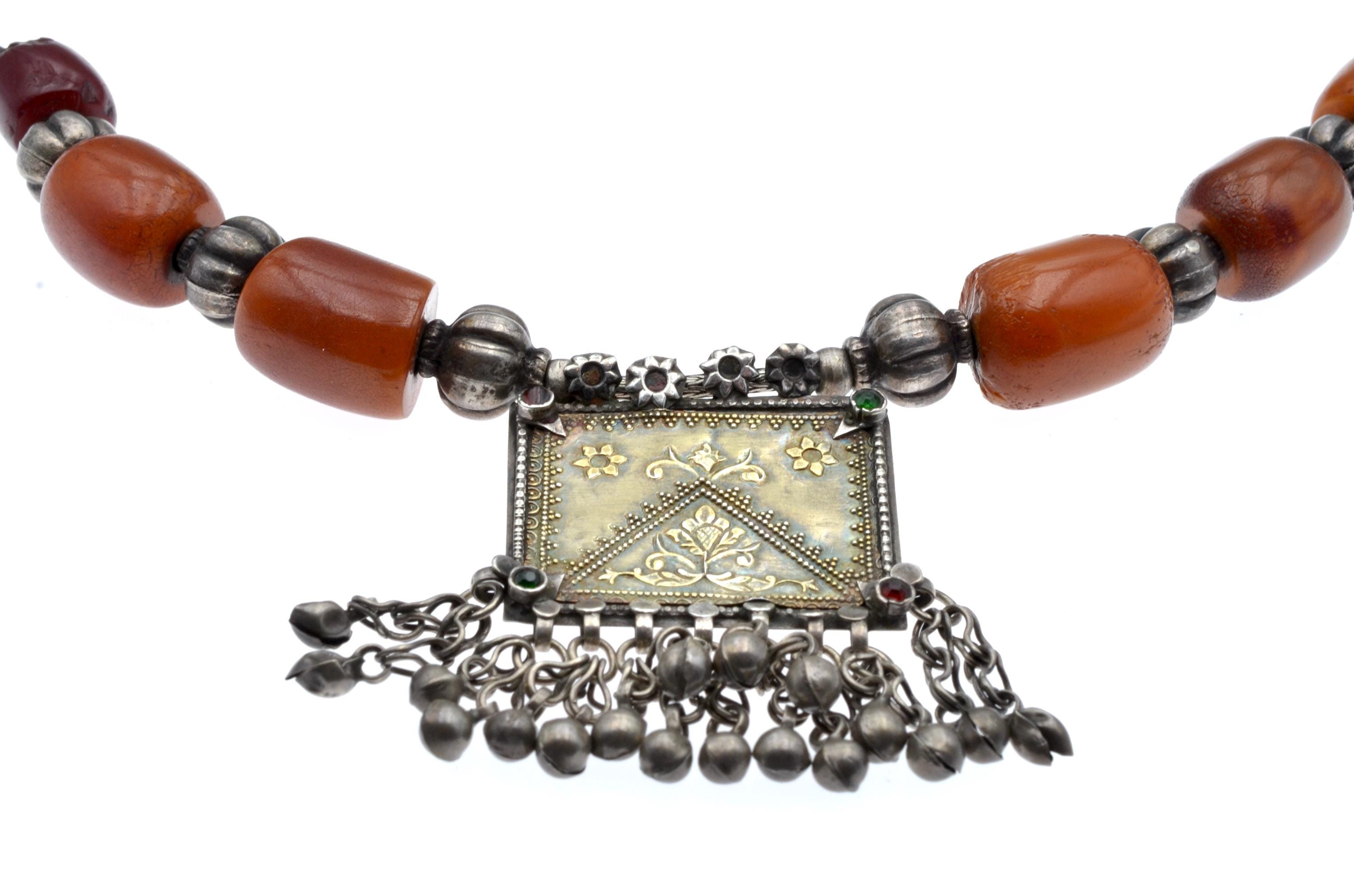 Antique tribal necklace centered by a rectangular silver pendant partially gilt, suspended from a twisted metal cord and complemented by orange bakelite beads.
