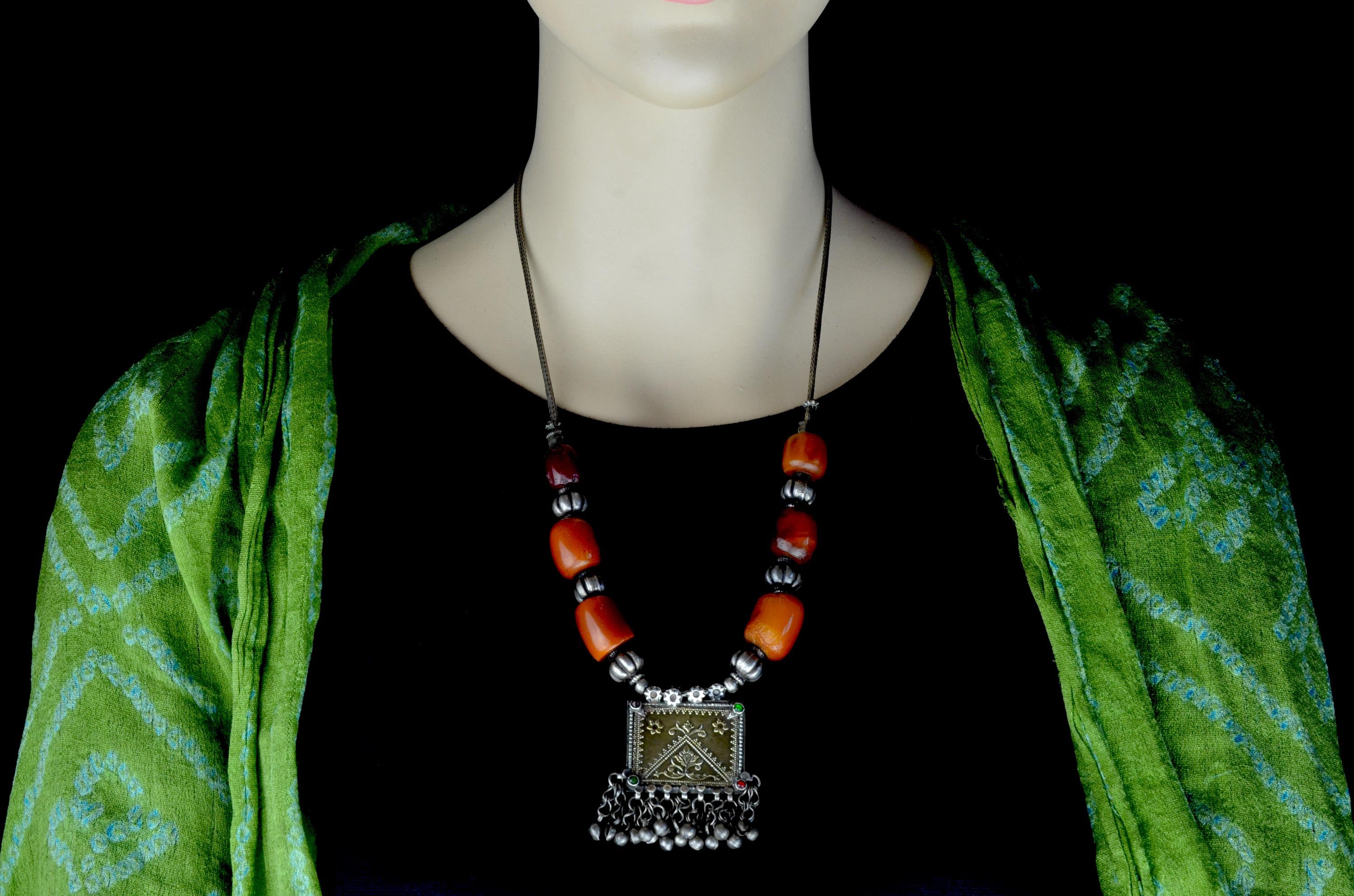 The pendant is mounted on a braided metal cord with silver beads and several cylindrical orange bakelite beads imitating the color of coral. Phenolic resins such as bakelite became widely used in tribal ornaments during the first half of the twentieth century as substitutes for organic materials like Mediterranean coral.