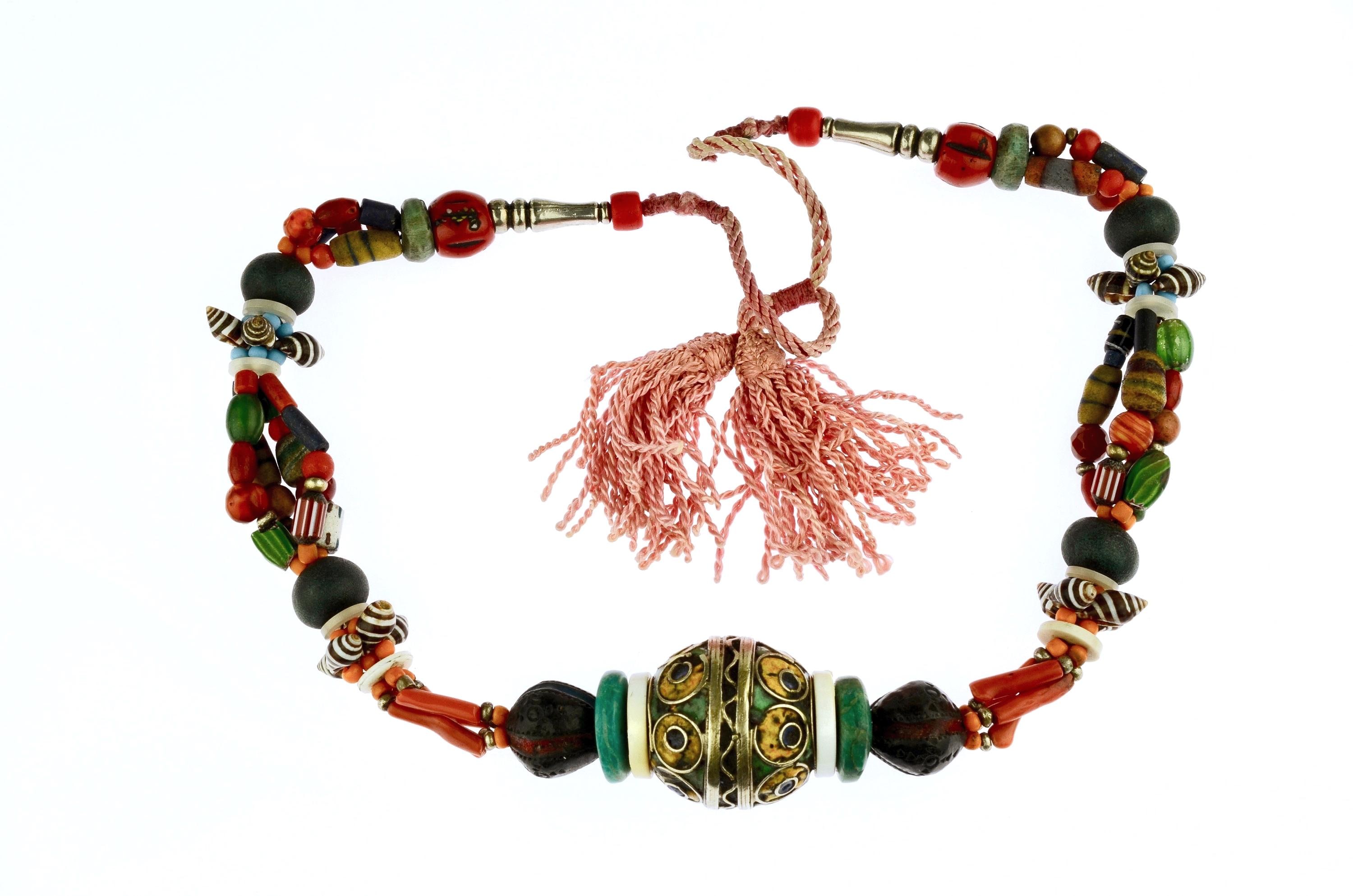 Ornaments of coral, amazonit, trade glass beads, lapis lazuli, very old turquoise, shell, carnelian, mounted on 3 rows.